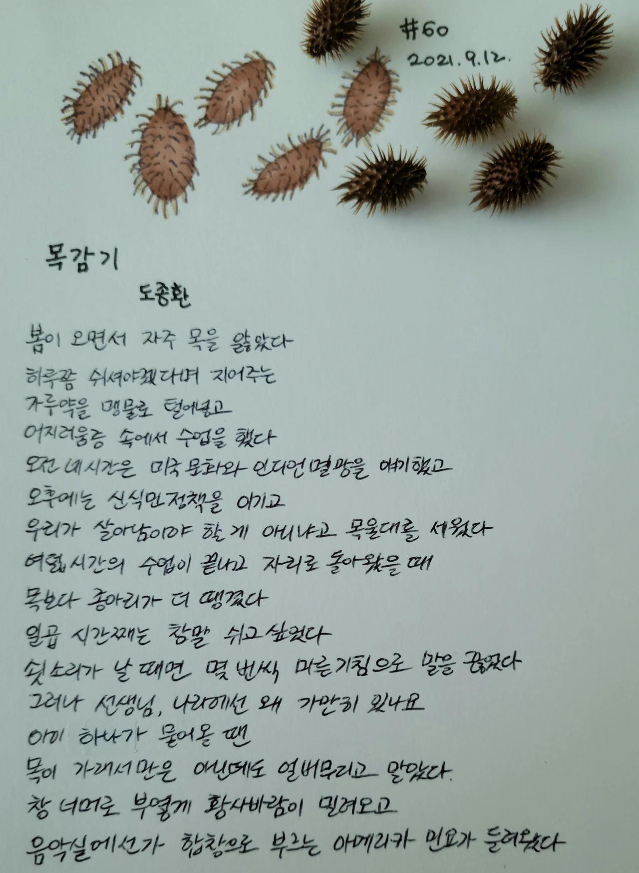 도꼬마리는 감기나 비염, 축농증에 좋다고 한다. 학교 선생의 직업병은 목 통증이다. 성대결절은 흔한 질병이고 다리도 잘 붓는다. 도종환 시인의 <목감기>에서 선생의 직업병에 공감하다가 학생의 날카로운 질문에 기침을 핑계로 자신을 숨기게 되는 모습에 쓴웃음을 지었다. 제국주의와 식민지의 역사는 끝났지만 그 영향은 그대로 남아 제3세계 국경마다 분쟁이 일어나고 혼란스러운데 국제사회에서 정의는 뒷전이고 이익을 앞세우는 것이 현명한 외교, 탁월한 선택이 되었다. 미국 역사와 인디언 멸망을 배우는 교실 옆에서 인디언, 아프리카 노예, 알래스카 소수민족의 아픔이 담긴 아메리카 민요를 배우는 음악수업이 한창이다. 그런데 나라는 왜 가만히 있냐는 학생의 물음만 공허하게 울린다.
