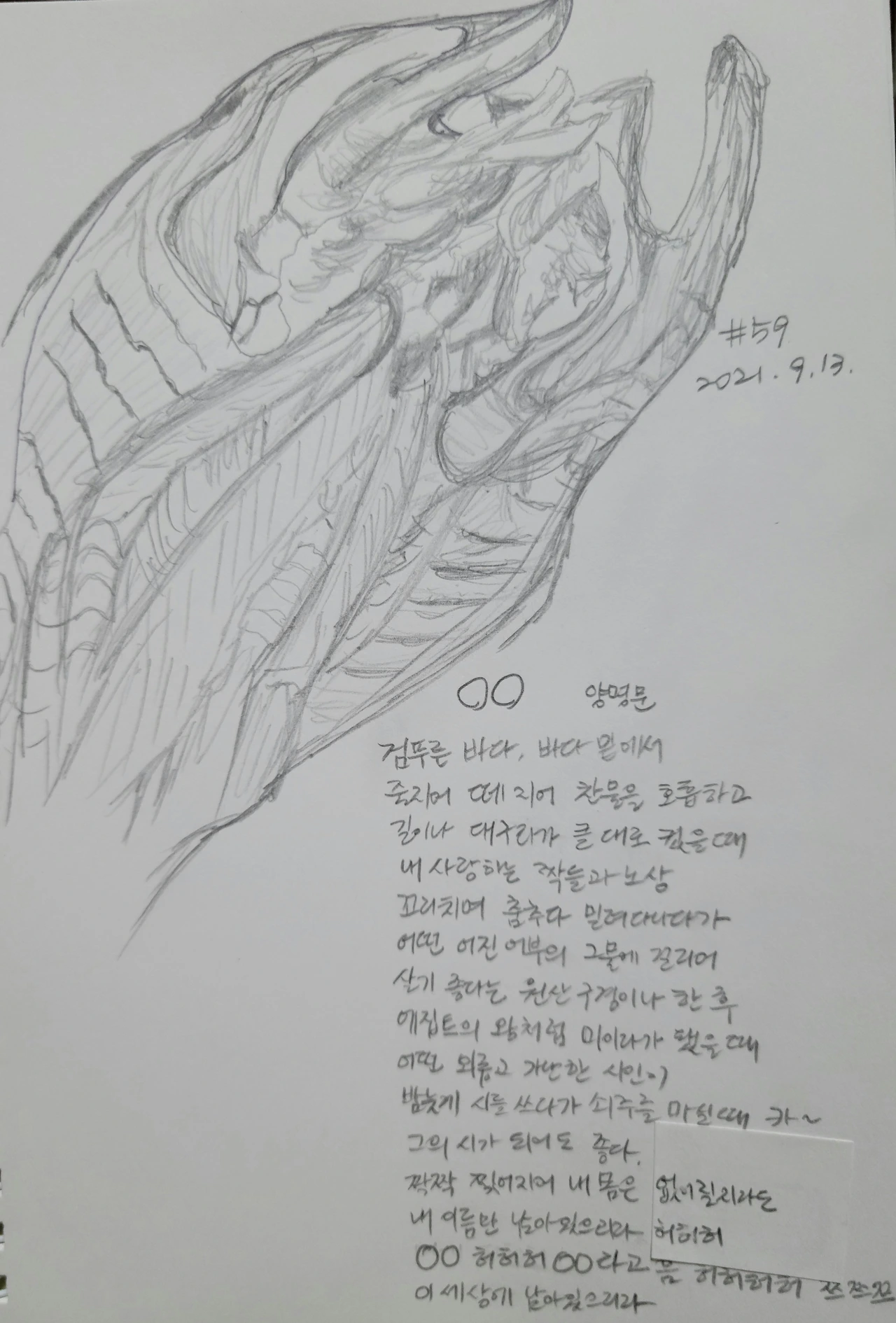 학교 정문을 나서는데 사방이 어둑해져 화단의 꽃이나 잎들이 시커먼 복면을 쓴 것 마냥 보이지 않는다. 발걸음이 내뜻과 다르게 질질 끌리고 몸은 천근만근이다. 집에 오니 마른 명태가 눈에 띈다. 내가 그다지 좋은 세상 구경 못하고 미라가 된 명태 같다. 그리다 보니 영화 <에일리언>의 괴물처럼 보인다.