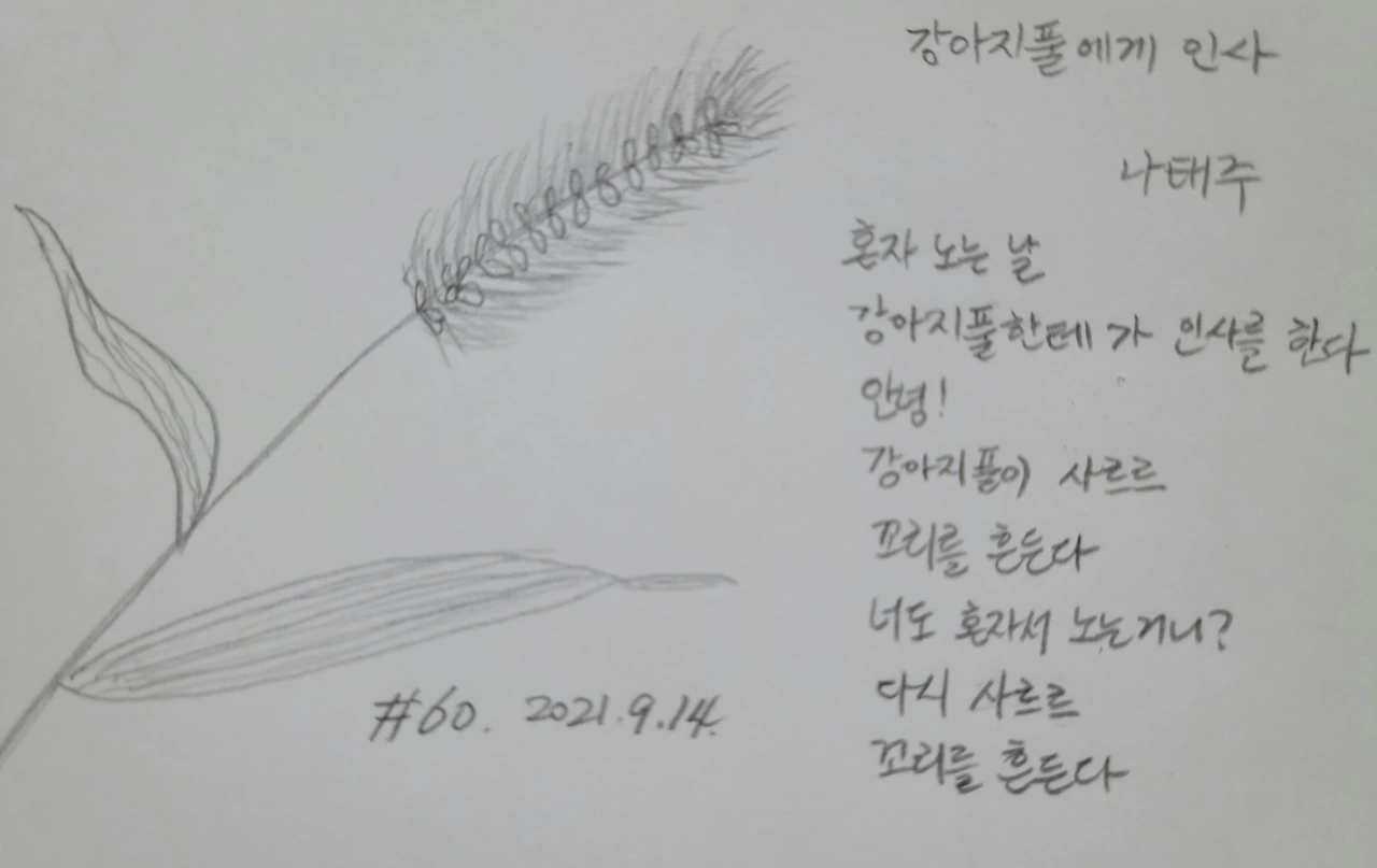 모습을 따라 그려보면 풀 이삭이 강아지 꼬리를 닮아 이름이 된 까닭을 바로 이해하게 된다. 손아귀에 넣고 쓸어 올리면 시골 외갓집에서 봤던 mix 진돗개의 뻣뻣한 꼬리가 생각난다.