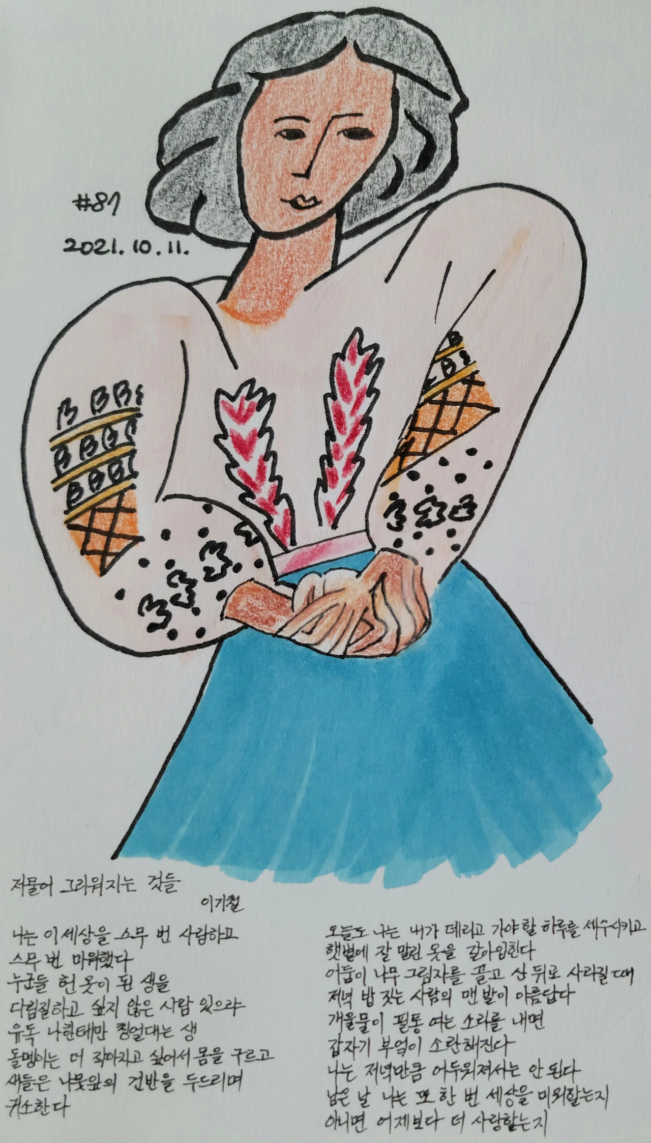 스웨터의 도톰한 재질과 굵은 꼬임, 털실의 보풀이 주는 따스한 느낌이 좋다. 이번 가을은 멀리했던 스웨터를 꺼내 입고 산책에 나서야겠다. 예전에 뚱뚱해 보인다고 질색하고 피했던 파스텔 색 스웨터를 한벌 장만해 가을을 지내고 나면 내 몸의 부피에 적응된 늘어진 모양에 정들 것 같다. 스웨터를 입은 내 모습이 어떻게 보이나에 신경 쓰는 대신 올 가을, 세상을 더 사랑할 수 있는데 집중하겠다. <저물어 그리워지는 것들> 속 화자처럼 내가 데리고 갈 하루를 세수시키고 햇볕에 잘 말린 옷을 갈아입혀 삶을 긍정하는 데 시간을 보내겠다.