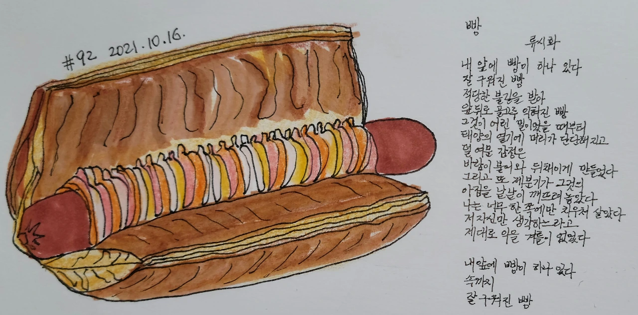 자전거 탈 때 간식으로 많이 먹었던 열량높은 소세지빵을 그리고 류시화의 <빵>을 읽었다.