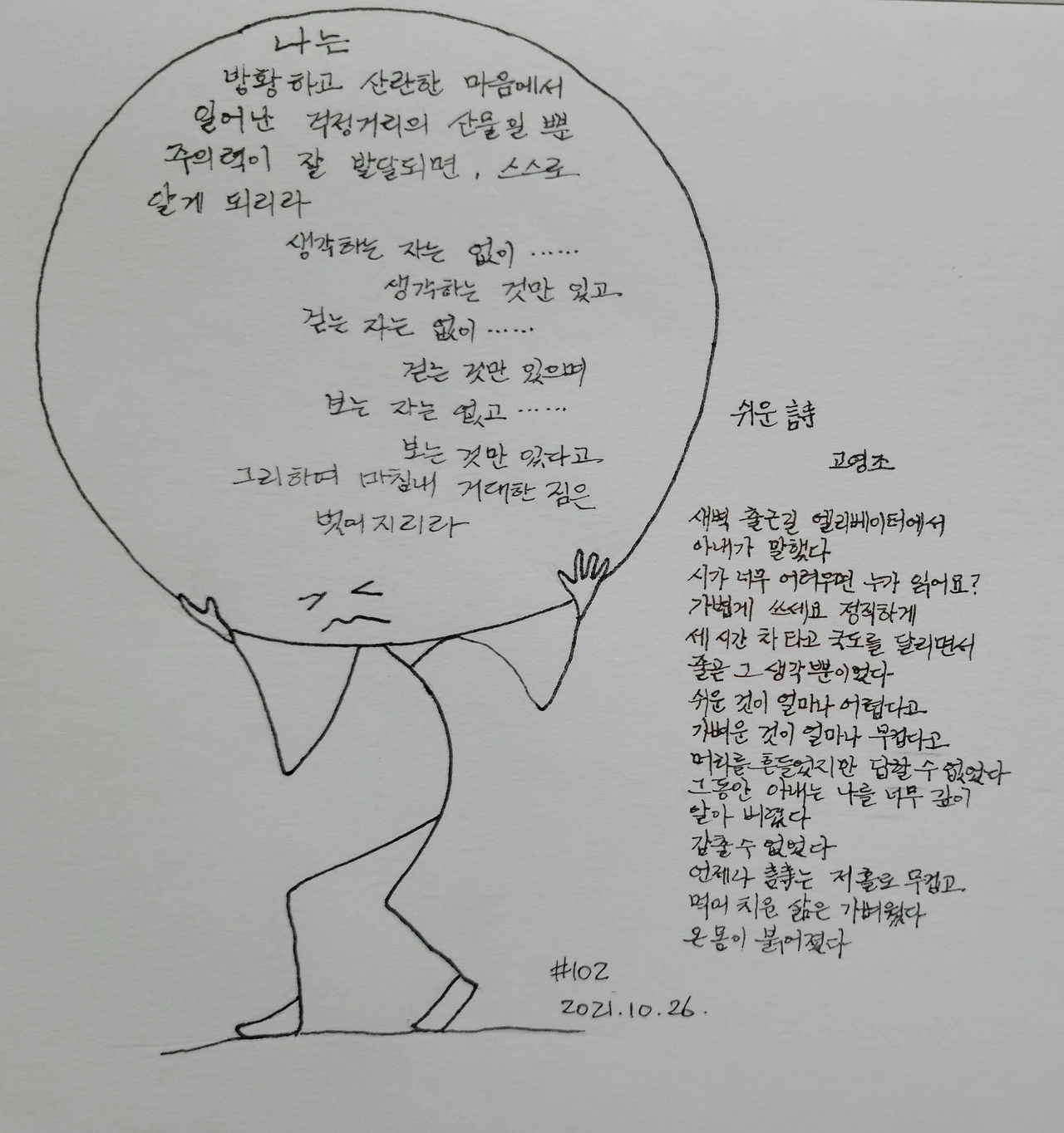 오늘 드로잉은 수자타의 <관-명상을 통하여 얻어지는 자유> 책에 나오는 한 페이지를 따라 그렸다. 무려 1986년에 나온 책이다. 아이들이 졸라맨이라고 부르는 그림체와 글로 마음챙김의 매력을 소개하고 있다.