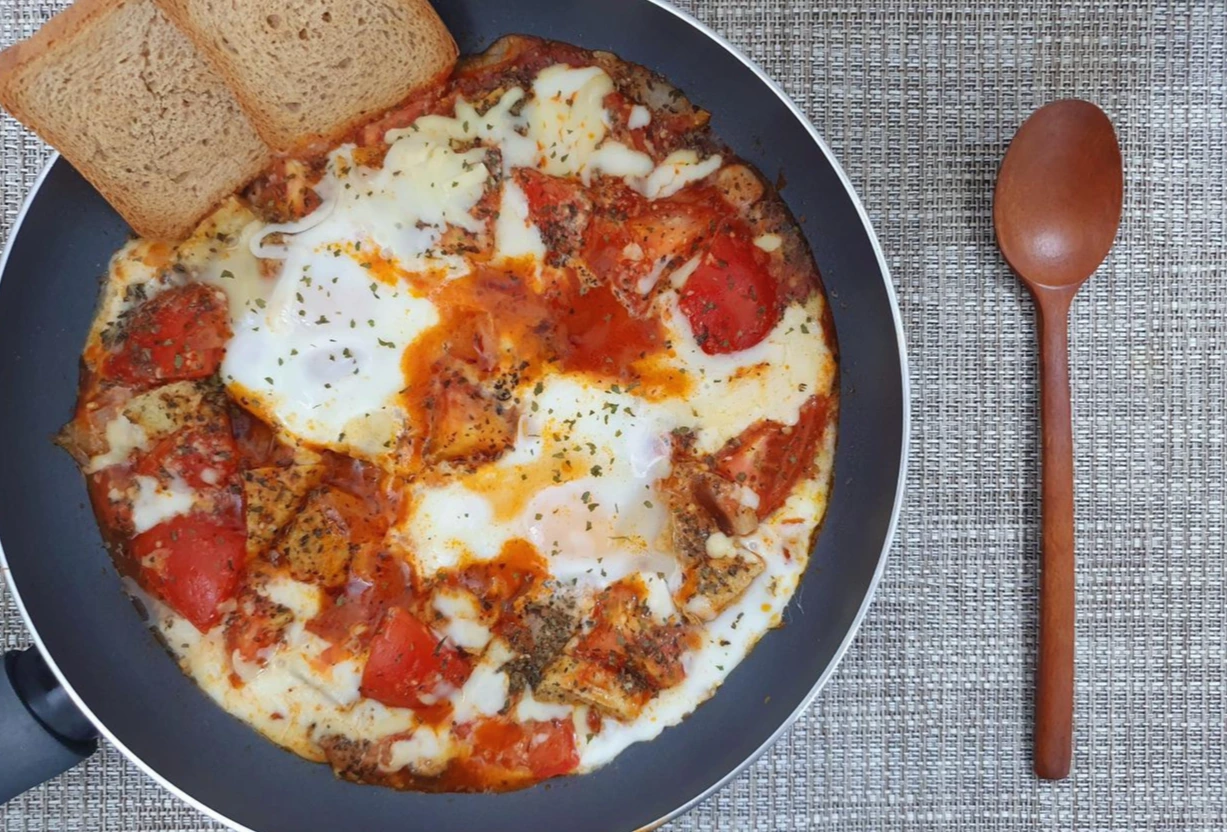 다른 이름은 '샥슈카'로, 주로 지중해와 중동 지역에서 즐겨 먹는 일종의 토마토 스튜이다. 토마토소스와 토마토, 각종 야채와 계란을 넣었다. 본래 향신료가 많이 들어가는 음식이라서, 바질이나 파슬리, 후춧가루를 많이 넣었다. 모짜렐라 치즈를 얹고 푹 끓여서 먹으니, 몸이 따뜻해졌다.