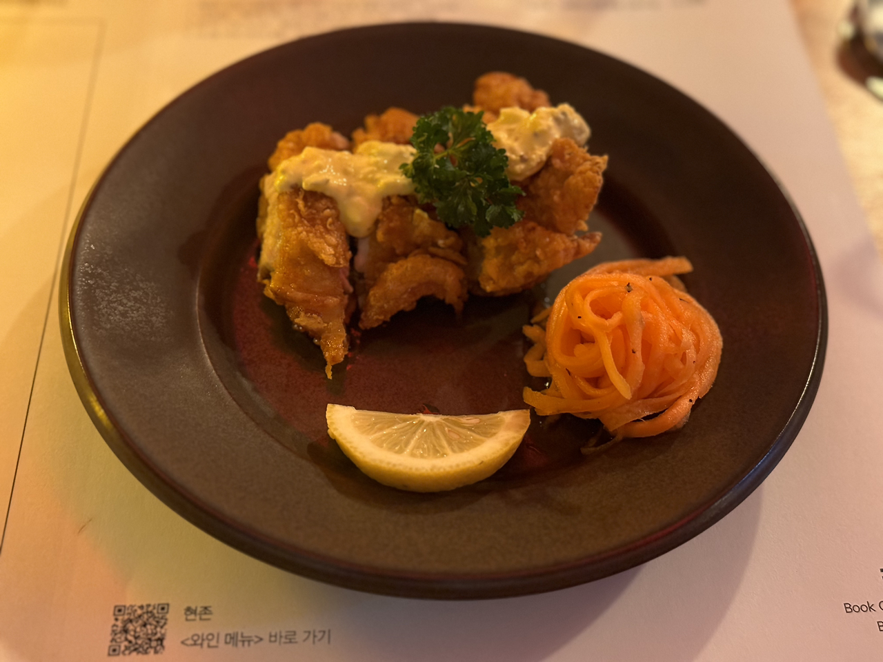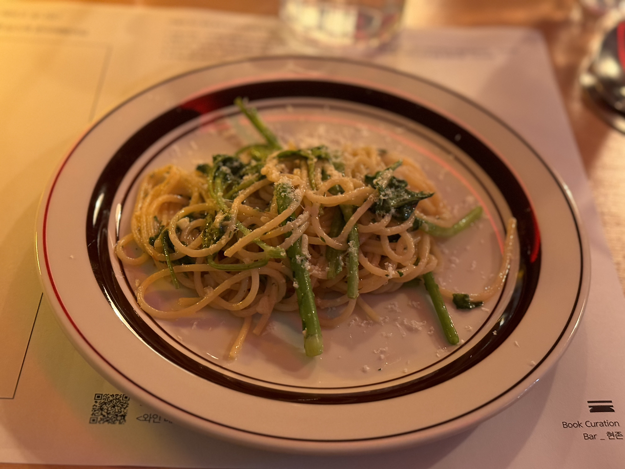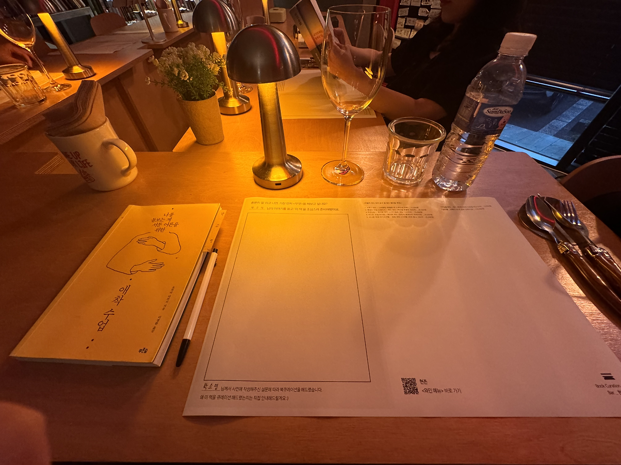 책과 함께 바 현존에 입장하면 각 사람마다 자리가 있고, 적당히 분위기 있는 조도의 식사 공간이 등장한다. 이제부터 약 한시간 반 동안 순서대로 나오는 코스 요리를 곁들이며 독서를 하게 된다. 각 코스마다 맞춤 와인도 준비되어 있다. 추천받은 책마다 큐레이터가 그어놓은 밑줄이 한가득있고, 한 권을 다 읽어내기엔 부족한 시간이지만 추천의 이유를 찾아가기에는 충분하다. 나와 함께 이 프로그램에 참여한 이 중에는 책을 읽으며 눈물을 흘린 사람도 있었다.