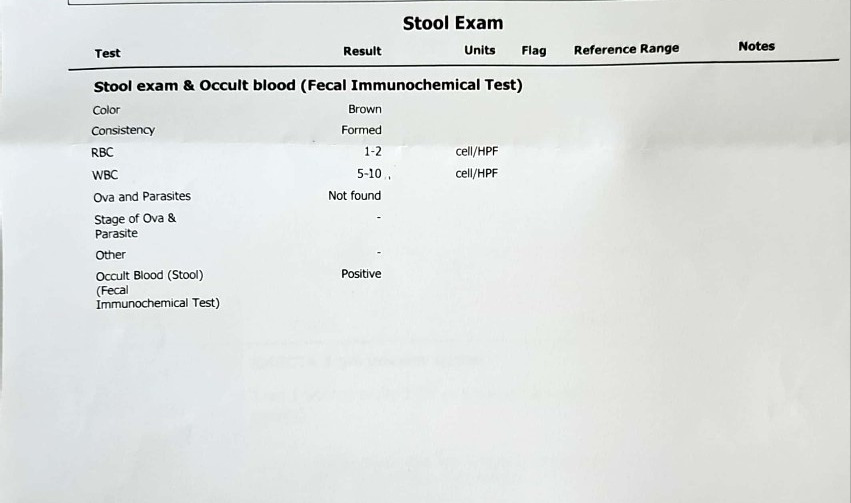 검사 결과지를 보여주며 의사가 직접 설명해 주는데, wbc 수치와 rbc수치가 있다고 하며 하부 위장에 염증이 생겼고, 약간의 출혈도 있는 것 같다고 말해주셨다.
