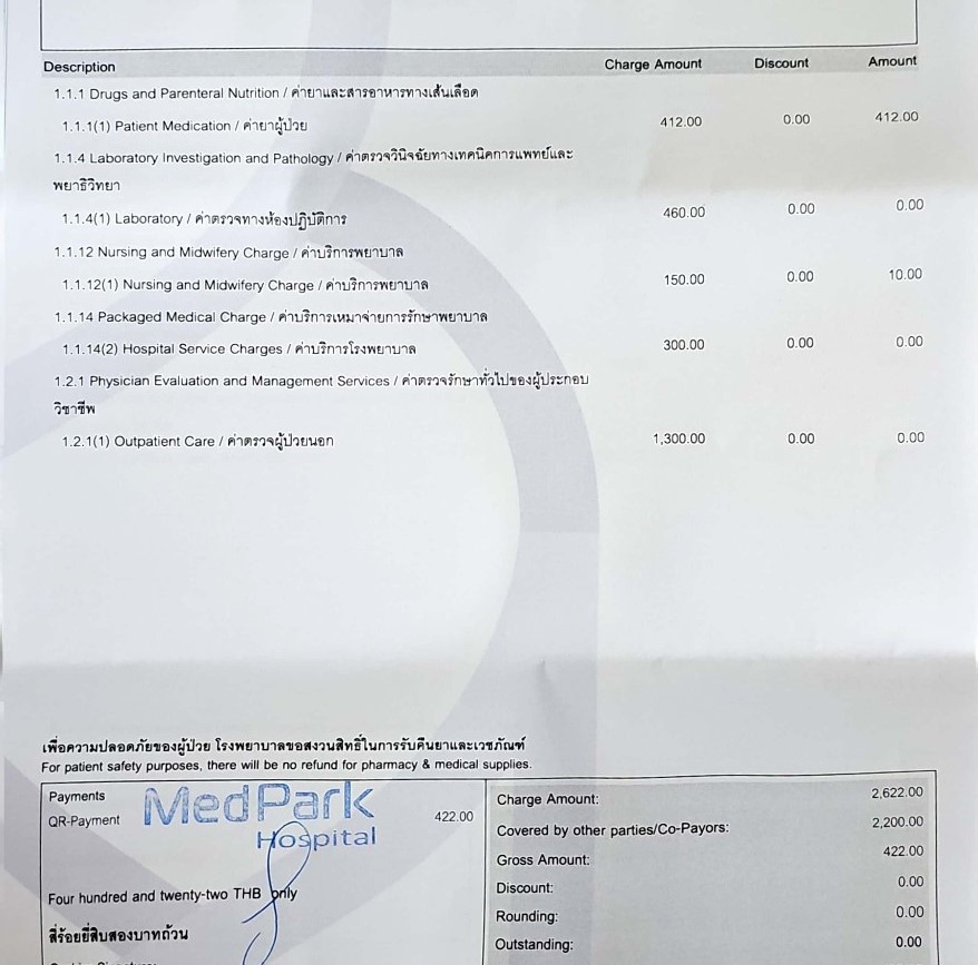 다행히 보험 처리가 되어서 422바트 (16,200원)만 내면 되었지만......... 한국에서는 정말 상상도 할 수 없는 병원비인 것 같아요.