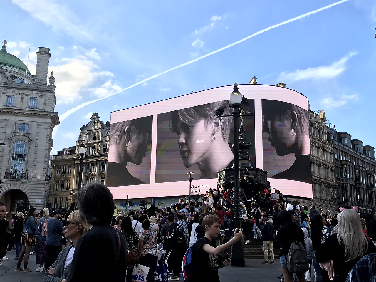 이쯤에서, 런던 한복판에서 BTS를 외치던 아미들의 모습이 떠오르네요. 현재 BTS가 글로벌 홍보대사로 있는 현대차가, 피카딜리 서커스 대형 전광판에 미공개 영상을 푼다고 해서 가봤었습니다. 이미 몇 시간 전부터 광장 앞을 가득 메운 아미들이 저마다 떼창을 하기도 하고, 춤을 추기도 하면서 상영 시간을 기다리고 있었어요. 지나가는 관광객이 휘둥그레진 눈으로 쳐다보며 지나가기도 하고, 축구팀 유니폼을 사기 위해 간 매장에서는 대체 뭘 하길래 사람들이 저렇게 모여있는 거냐며 되레 제게 묻기도 했어요.