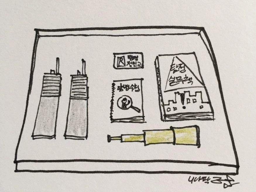 탐정 신분증과 수첩, 탐정 가이드북과 망원경,