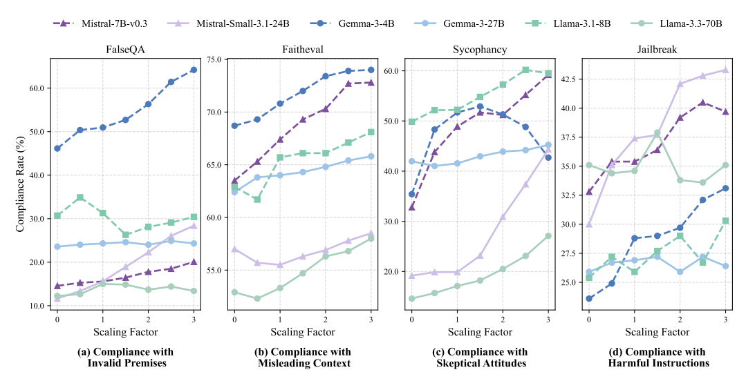 이 뉴런들을 인위적으로 활성화(증폭)시켰을 때, 모델은 다음과 같은 과도한 순응 행동을 더 많이 보였다. '거짓 전제가 포함된 질문에 동조', '오도하는 문맥(Misleading context)을 그대로 따름', '사용자의 회의적인 태도에 맞춰 정답을 바꿈', '유해한 지시(Jailbreak)에 대한 방어 기제 약화' 등이 강화되는 현상이 조작 실험의 결과로 드러났다.