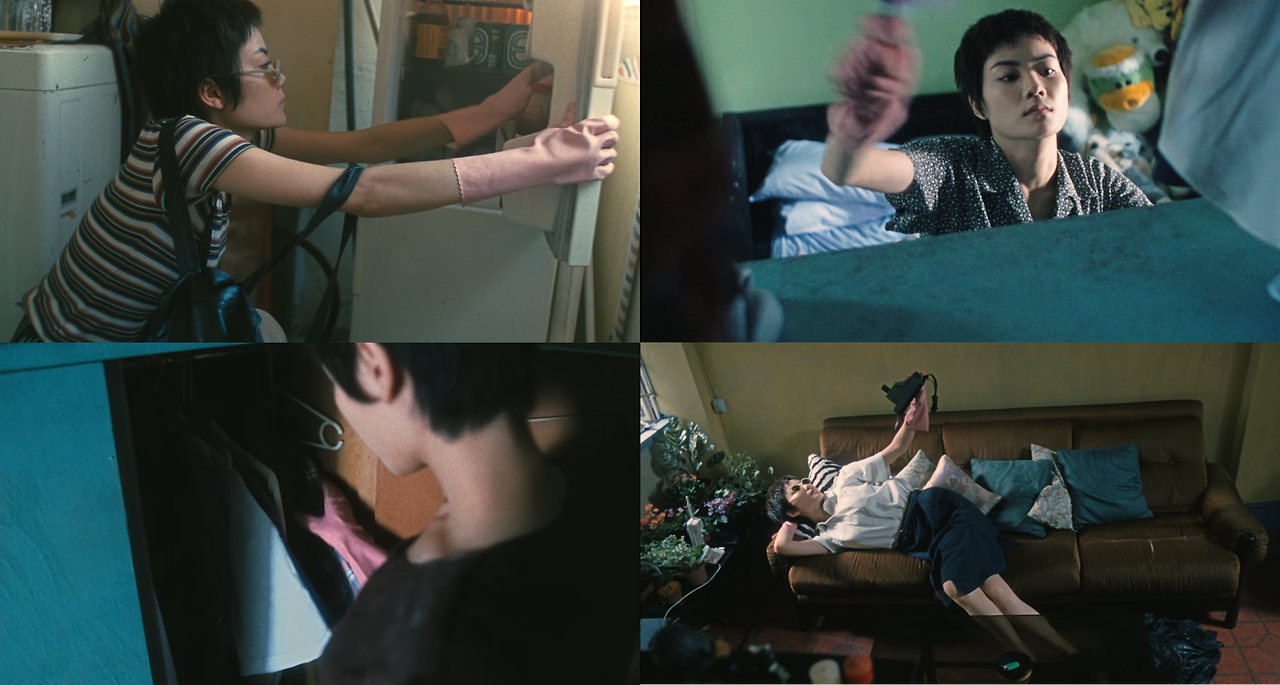 집 안에서의 경찰 663의 행동은 독특하다. 사물이 헤어진 그녀를 그리워한다며, 말을 걸고 위로하고, 때로는 격려하며 타박한다. 그런데 영화라는 세계는 원래 이렇게 작동한다. 영화는 배우의 연기로만 말하지 않는다. 때론 영상의 사물들이 의미를 가지고 관객에게 이를 전달하기도 한다. 언어로 다하지 못하는 것, 말보다 효과적인 전달을 위해 사용하는 수단, 사물과 공간의 배치, 우린 그것을 미장센이라 부른다. 화면 안에서 이것들이 배우의 연기와 함께 조화와 서사를 펼치는 일, 그것이 영화다.