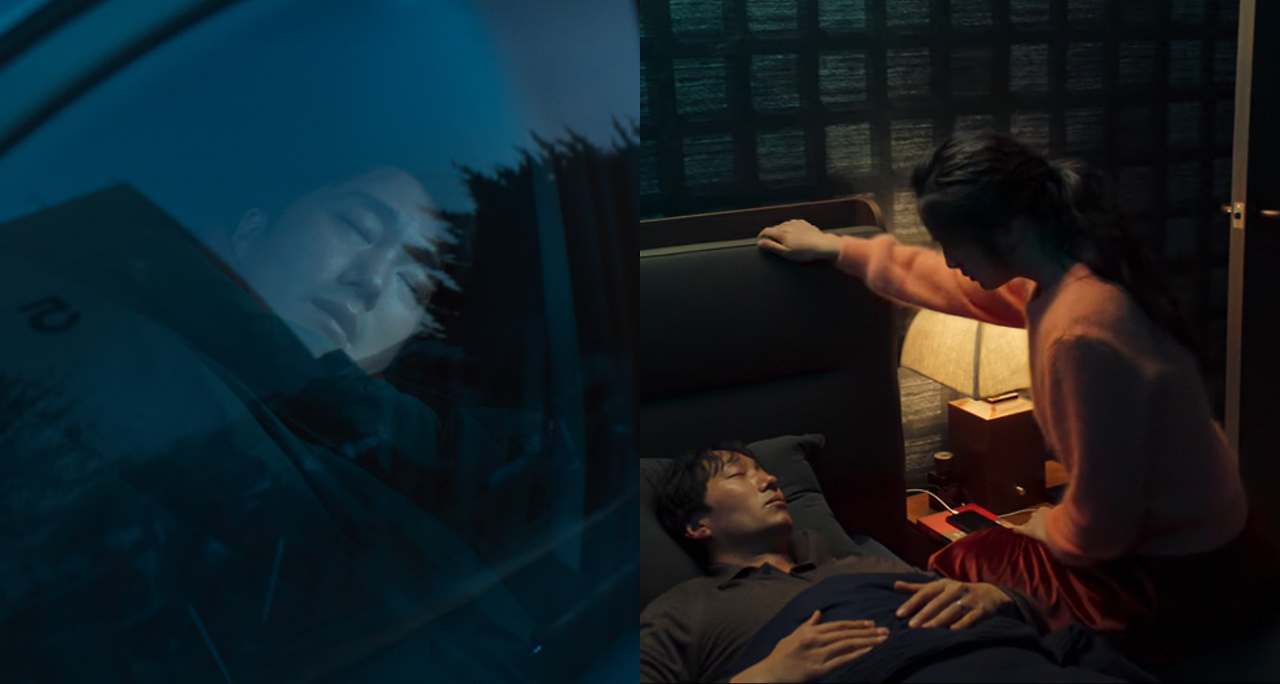 그러나 에로스에 충실해 보이는 이 남자를 영화 내내 괴롭히는 치명적인 결핍이 있으니, 바로 지독한 불면증이다. 잠이란 살면서 매일같이 짧은 죽음을 체험하는 일이다. 역설적이게도 죽음의 비밀을 집요하게 파헤치는 그에게는 정작 '일상적인 죽음(잠)'이 허락되지 않는다. 이 일상적 죽음에 대한 지독한 갈증을 품고 있던 해준이, 죽음을 주관하는 자(타나토스)를 맞닥뜨렸을 때 맹렬하게 끌리는 것은 필연이다. 그가 잠복수사라는 명목으로 서래를 관찰하며 비로소 모처럼 만의 달콤한 숙면에 빠져드는 이유가 여기에 있다.