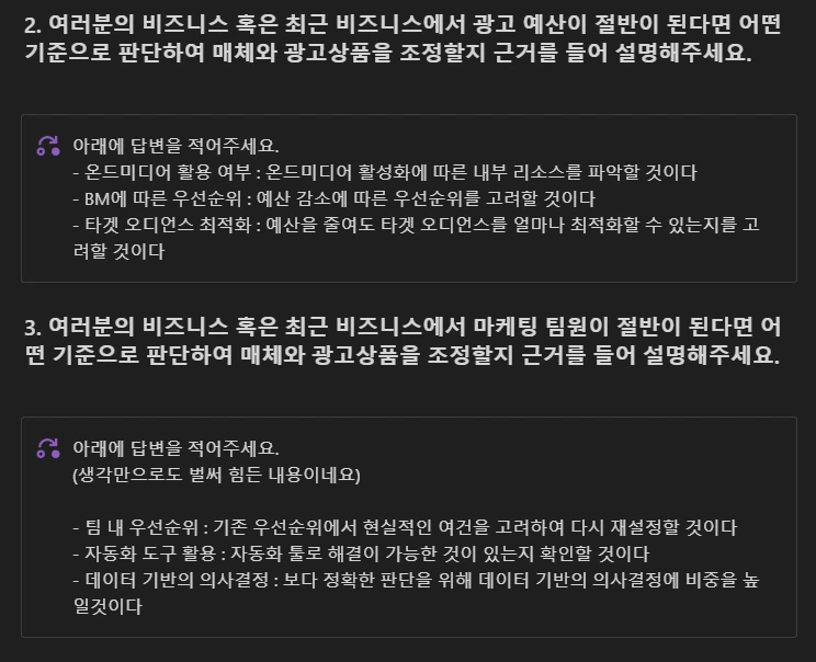그랬기 때문에, 스터디의 짧은 기간이 아쉽게 느껴졌습니다만! 첫 주와 두 번째 주의 학습 내용을 비교하며 고민하고 결론 내리는 과정은 저 스스로에 대한 마케팅의 기준과 전략, 그리고 마케터로서 실력의 성숙도를 확인할 수 있는 좋은 기회였습니다. 사실 기간이 더 길었으면 일정이 빠듯해서 집중도가 떨어졌을 것 같기도.. 합니다.