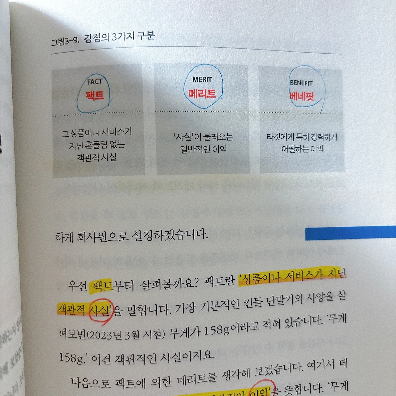팩트, 메리트, 베네핏을 세 가지로 나누어 설명한 부분도 인상 깊었다. 단순히 정의를 나열하는 데 그치지 않고, 독자가 자신의 사례를 자연스럽게 대입해볼 수 있도록 풀어낸다. 생각보다 많은 프로덕트와 비즈니스가 이런 요소들을 명확히 정리하지 않은 채 출발한다는 사실이 떠올랐다.