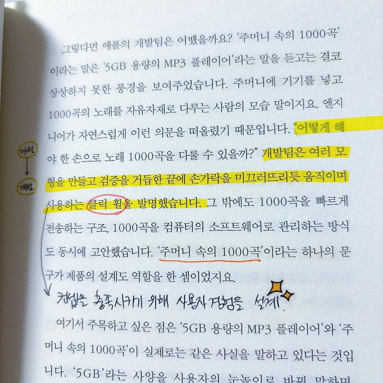 애플의 아이팟 개발 이야기를 읽으며 그 기준이라는 말이 무엇인지 조금 더 선명해졌다. 아이팟의 클릭휠은 사용자가 음악을 탐색하는 경험을 가장 직관적으로 만들기 위해 설계된 결과물이다. 컨셉을 먼저 세우고, 그 컨셉을 충족시키기 위해 사용자 경험을 끝까지 설계했다는 점이 인상 깊었다.