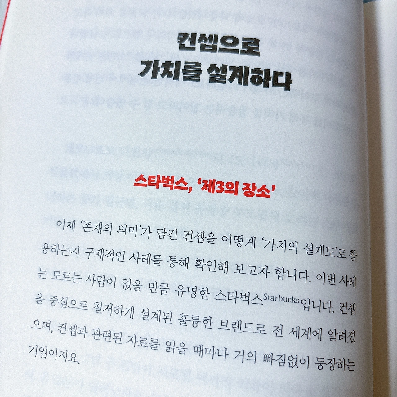 스타벅스의 ‘제3의 장소’ 사례를 읽을 때도 비슷한 감정이 들었다. 이탈리아의 카페 문화를 미국에 들여오고 싶다는 아이디어는 그 자체로는 멋지지만, 고객이 돈을 지불할 이유는 아니다. 그것을 집도 직장도 아닌, 머물 수 있는 또 하나의 공간으로 재구성했을 때 비로소 컨셉이 된다.
