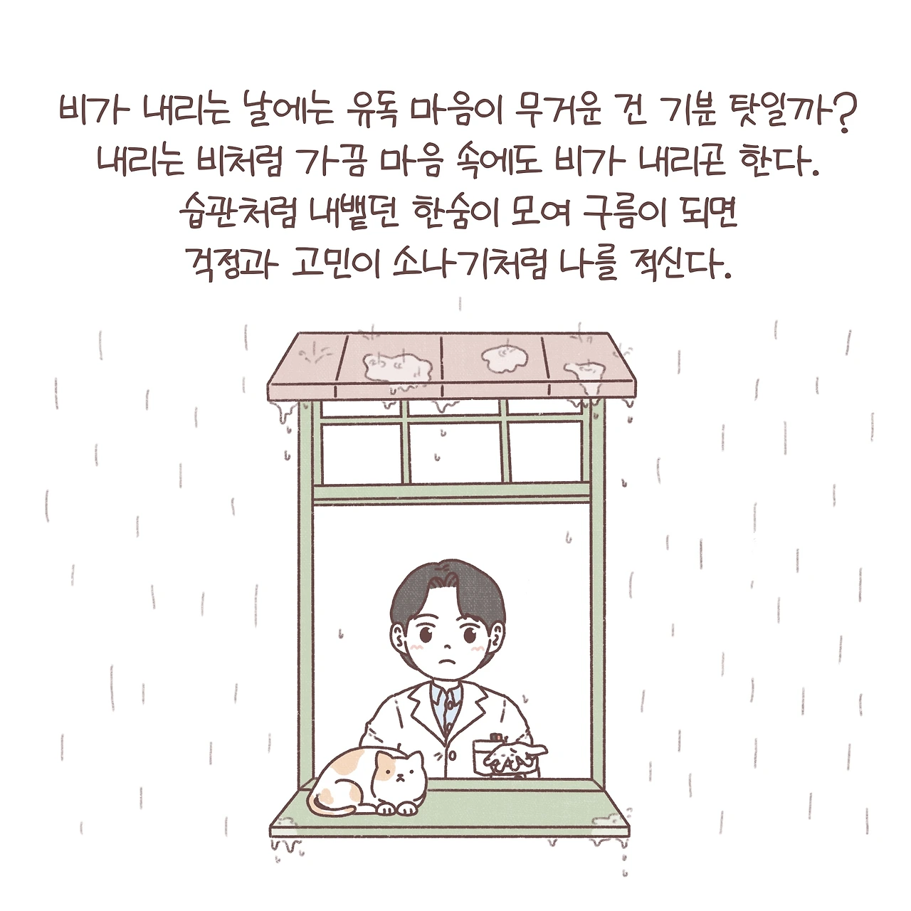 비가 내리면 유독 마음이 무거운 것은 기분 탓일까요? 추적추적 내리는 저 비처럼, 때로는 우리 마음속에도 비가 내리곤 합니다. 크고 작은 고민과 걱정들.. 내뱉은 한숨이 모여 구름에 더해지면 어느새 소나기가 되어 내리곤 하죠. 가끔은 비가 너무 거세져 잠시 일상을 뒤로하고 처마 밑에 숨기도 합니다. 우울, 불안과 같은 증상을 경험하는 누군가의 마음속에는 긴 장마가 온 것처럼 매일같이 비가 내리기도 할 테죠. 내리는 비가 무서워 점점 일상을 멀리하는 경우를 자주 보곤 합니다.