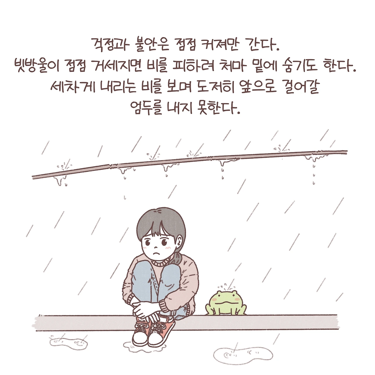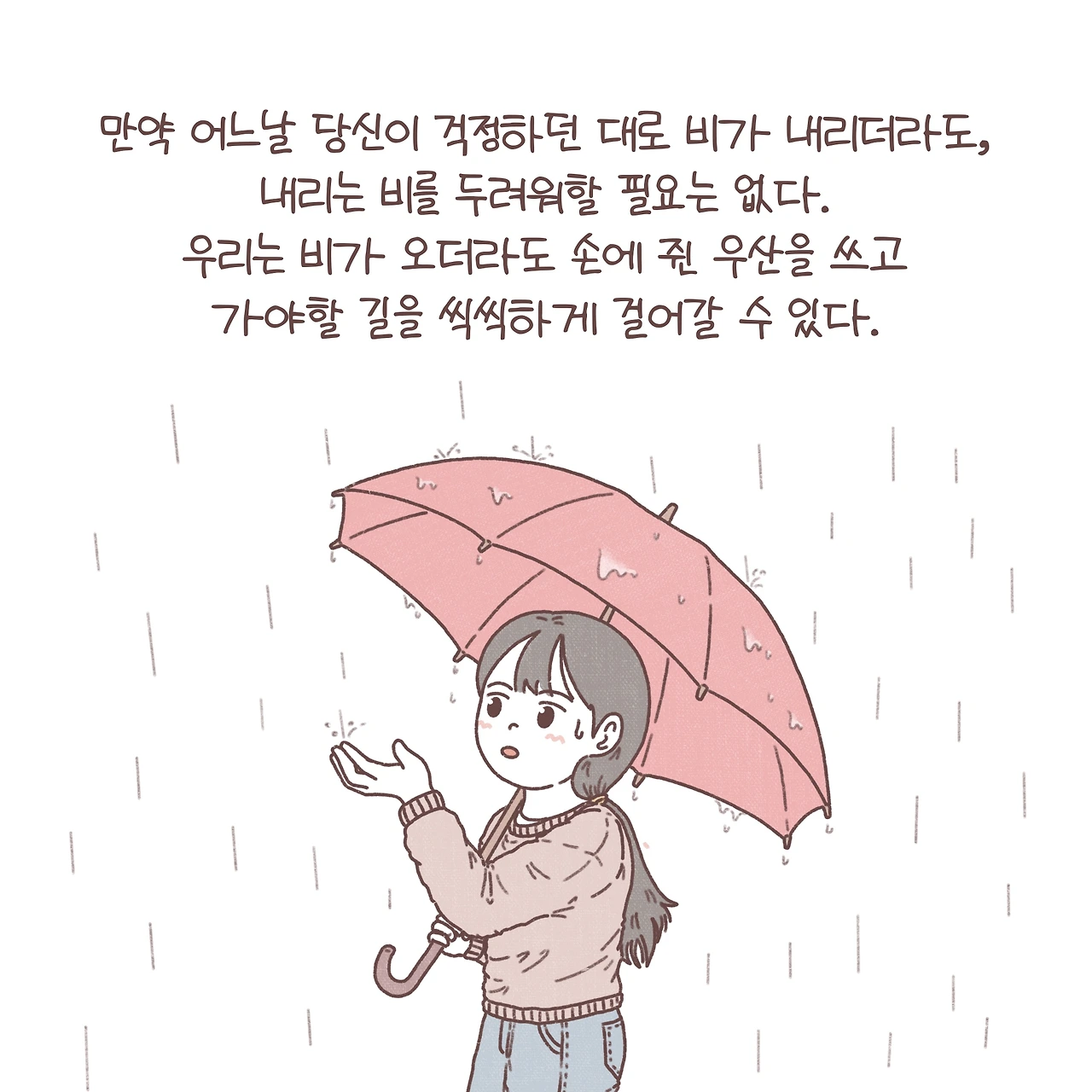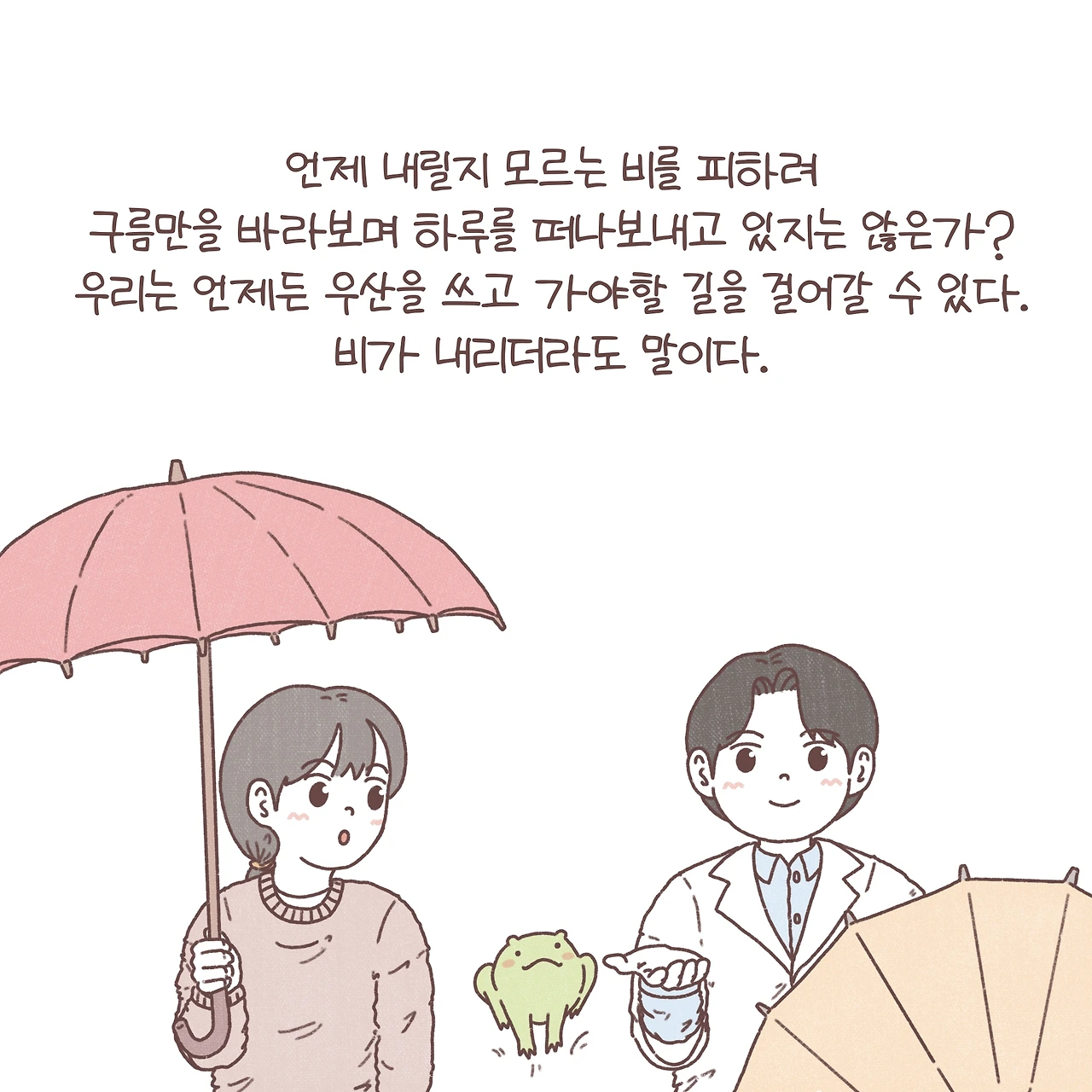 그런데, 누군가는 비가 그친 뒤에도 쉽사리 밖으로 나가지 못하기도 합니다. 세차게 내리던 비가 두려워서, 언제 또 비가 올지 몰라 하늘에 떠다니는 구름만 바라보곤 하죠. 구름을 뚫어지게 바라본다고 비가 언제 내릴지 알 수는 없는 노릇인 걸 알면서도, 어느새 두려움이 자리 잡아 망설이는 이들을 만납니다. 그런 이들어게 비가 내리더라도 우산을 쓰고 가야 할 길을 향해 걸어가는 것이 중요함을 말해주곤 해요. 만약, 정말로 비가 다시 내리더라도, 인생에 중요한 가치들을 잃지 않고 소중한 가족, 친구 또는 전문가들의 도움을 받아 든든한 우산을 쓰고 걸어가 보면 어떨까요? 망설이는 당신에게 작은 용기를 전할 수 있길 바랍니다. 비가 내리더라도.