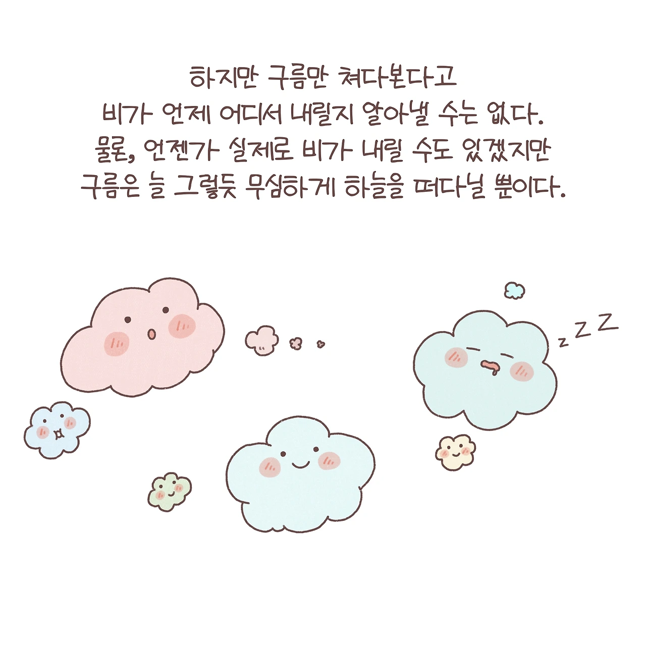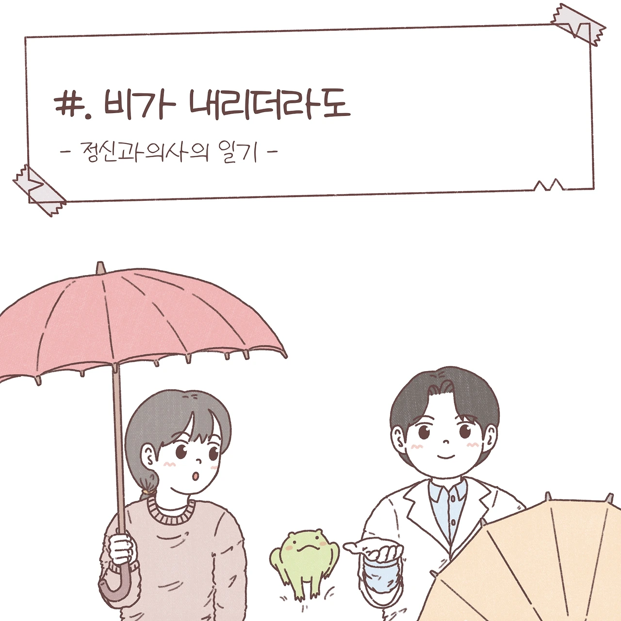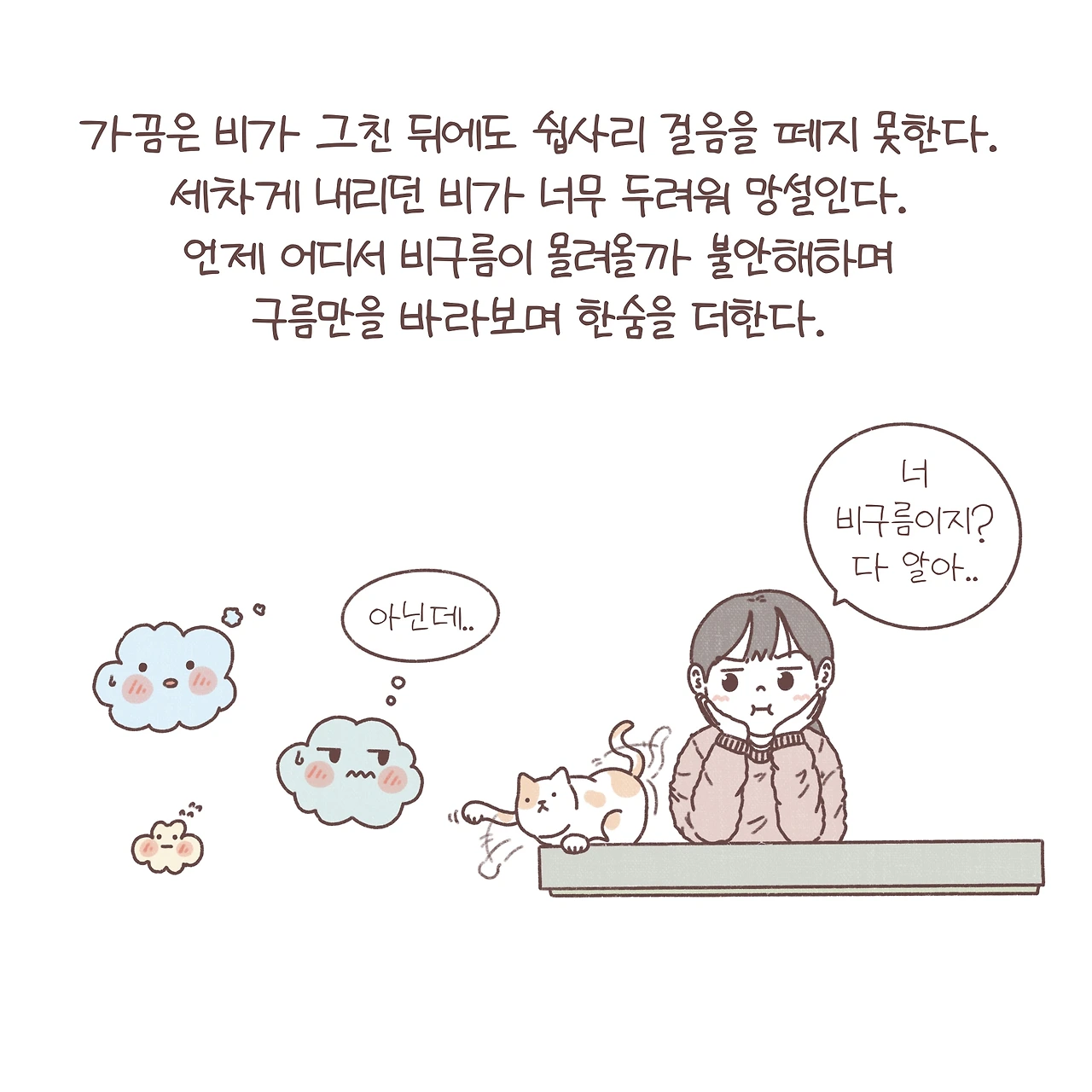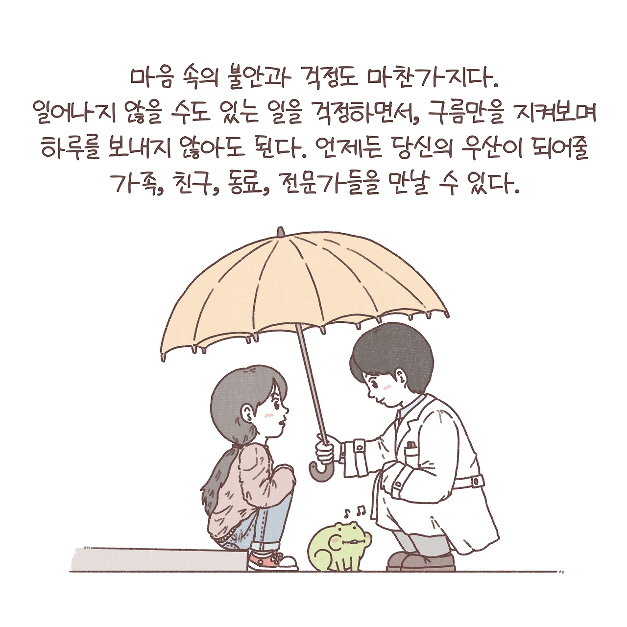 그런데, 누군가는 비가 그친 뒤에도 쉽사리 밖으로 나가지 못하기도 합니다. 세차게 내리던 비가 두려워서, 언제 또 비가 올지 몰라 하늘에 떠다니는 구름만 바라보곤 하죠. 구름을 뚫어지게 바라본다고 비가 언제 내릴지 알 수는 없는 노릇인 걸 알면서도, 어느새 두려움이 자리 잡아 망설이는 이들을 만납니다. 그런 이들어게 비가 내리더라도 우산을 쓰고 가야 할 길을 향해 걸어가는 것이 중요함을 말해주곤 해요. 만약, 정말로 비가 다시 내리더라도, 인생에 중요한 가치들을 잃지 않고 소중한 가족, 친구 또는 전문가들의 도움을 받아 든든한 우산을 쓰고 걸어가 보면 어떨까요? 망설이는 당신에게 작은 용기를 전할 수 있길 바랍니다. 비가 내리더라도.