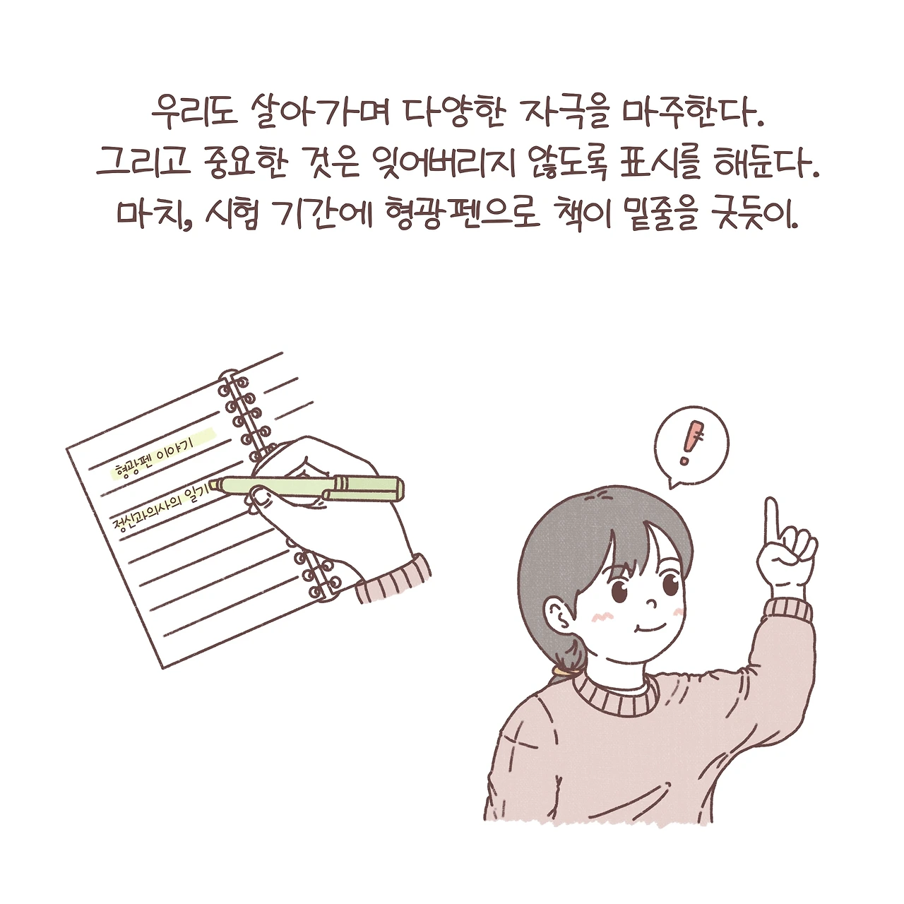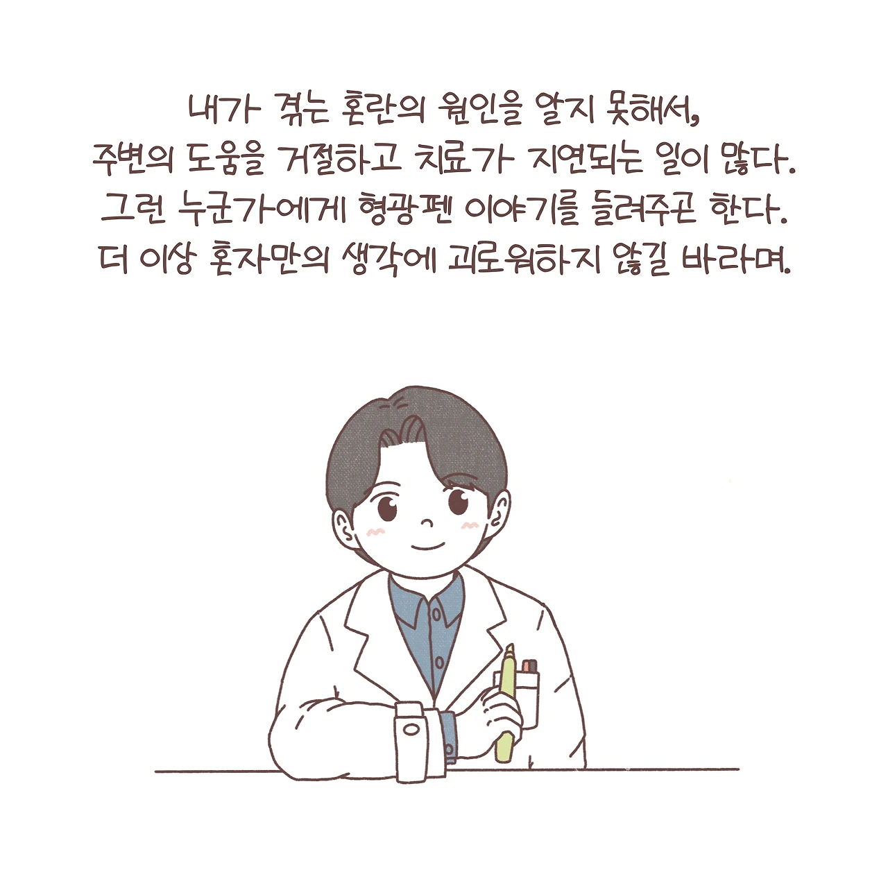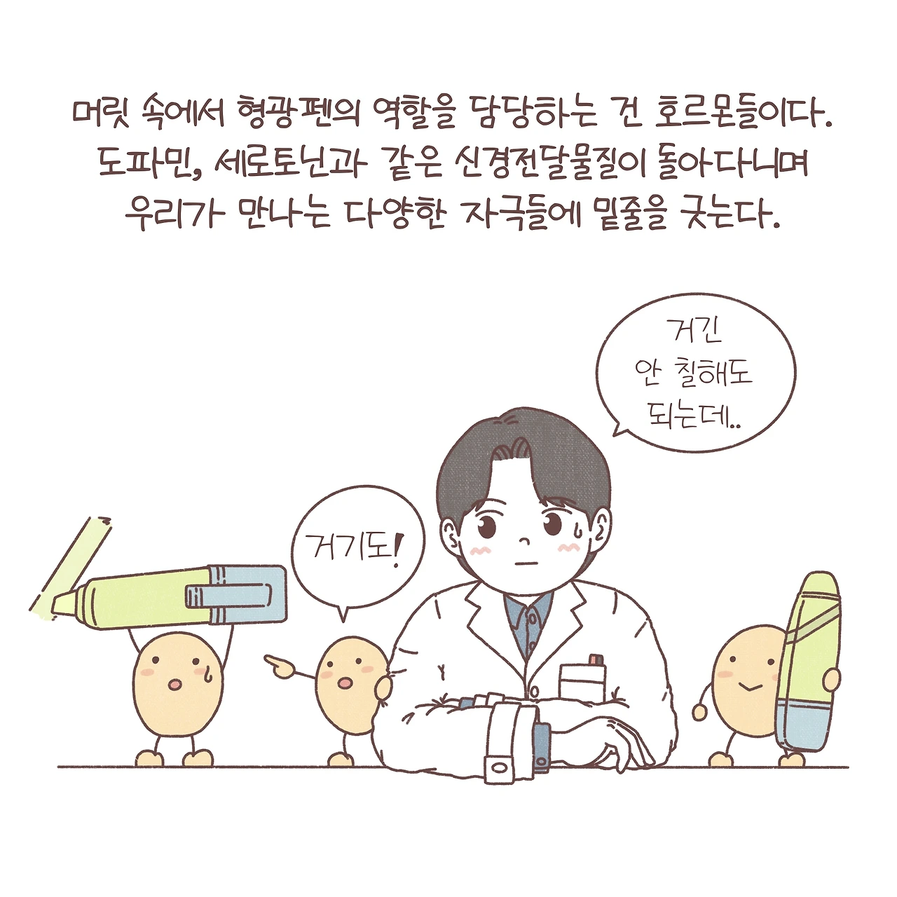 도파민은 우리에게 조금은 익숙한 호르몬인 것 같습니다. 흔히, ‘도파민이 오른다’라고 표현하기도 하죠? 도파민은 보상이나 쾌락을 느끼게 하는 신경회로에 중요한 역할을 합니다. 이뿐만 아니라, 다양한 신경회로에 작용하며 여러 역할을 수행하는 데요. 예전에 한 강연에서 도파민이 형광펜처럼 우리에게 보상을 줄 수 있는 자극들에 체크를 하는 역할을 하고, 때문에 도파민의 불균형이 조현병이나 다른 정신과적 질환에서 나타나는 망상의 기전일 수 있다는 인상 깊은 가설을 듣게 되었어요. 불필요한 곳에도 형광펜으로 마구 색칠을 하게 되는 거죠. 이를 조금 각색해서 ‘형광펜 이야기’라는 제목을 붙여 환자들에게 들려주곤 했답니다. 스스로가 겪는 힘든 상황을 이해하지 못해 괴로워하는 그들이 조금이라도 안심하고 치료에 집중할 수 있길 바라며. 늦은 밤 면담실에 앉아 형광펜이라는 단어를 반복하던 서툴었던 제 모습이 떠오릅니다. 함께 고민했던 밤들이 이제는 다들 조금은 평안해졌길, 그리고 아직 도움의 손길을 망설이는 누군가에게 그 손이 어서 닿길 바라봅니다.