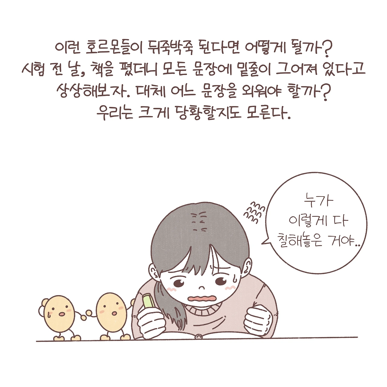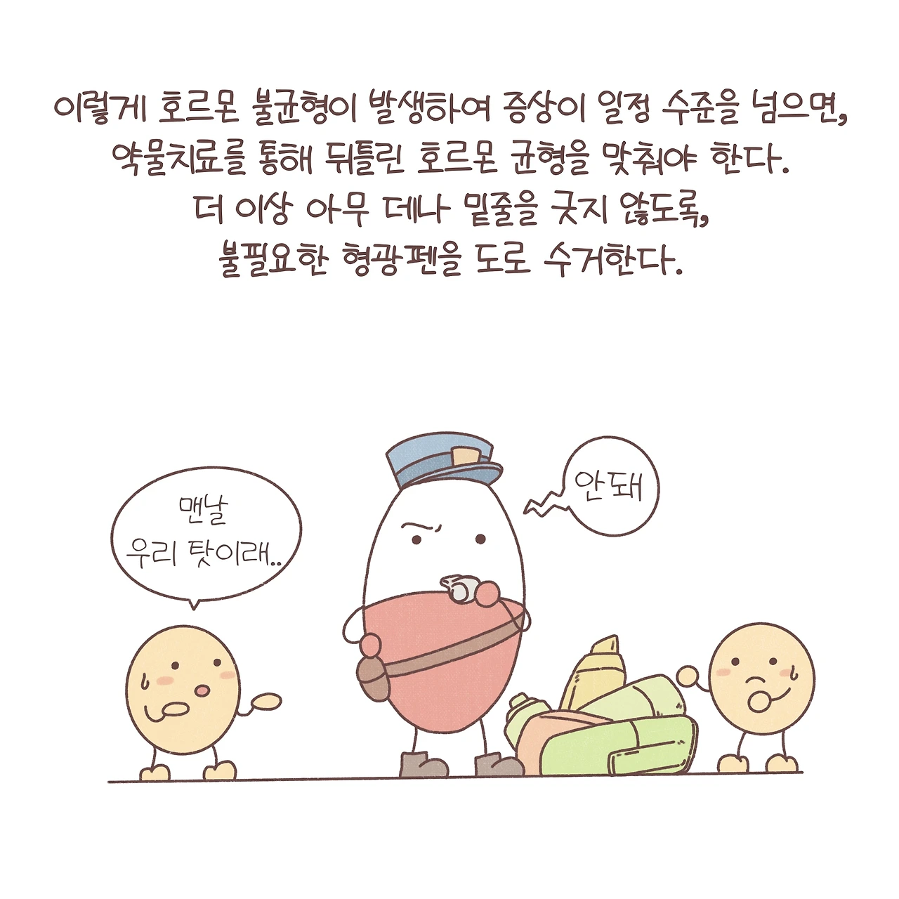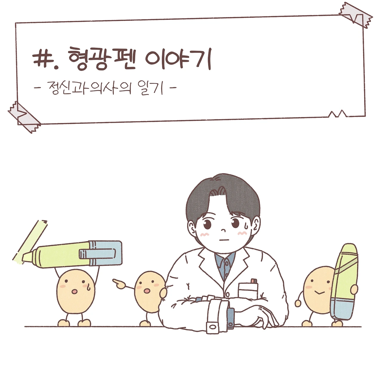도파민은 우리에게 조금은 익숙한 호르몬인 것 같습니다. 흔히, ‘도파민이 오른다’라고 표현하기도 하죠? 도파민은 보상이나 쾌락을 느끼게 하는 신경회로에 중요한 역할을 합니다. 이뿐만 아니라, 다양한 신경회로에 작용하며 여러 역할을 수행하는 데요. 예전에 한 강연에서 도파민이 형광펜처럼 우리에게 보상을 줄 수 있는 자극들에 체크를 하는 역할을 하고, 때문에 도파민의 불균형이 조현병이나 다른 정신과적 질환에서 나타나는 망상의 기전일 수 있다는 인상 깊은 가설을 듣게 되었어요. 불필요한 곳에도 형광펜으로 마구 색칠을 하게 되는 거죠. 이를 조금 각색해서 ‘형광펜 이야기’라는 제목을 붙여 환자들에게 들려주곤 했답니다. 스스로가 겪는 힘든 상황을 이해하지 못해 괴로워하는 그들이 조금이라도 안심하고 치료에 집중할 수 있길 바라며. 늦은 밤 면담실에 앉아 형광펜이라는 단어를 반복하던 서툴었던 제 모습이 떠오릅니다. 함께 고민했던 밤들이 이제는 다들 조금은 평안해졌길, 그리고 아직 도움의 손길을 망설이는 누군가에게 그 손이 어서 닿길 바라봅니다.