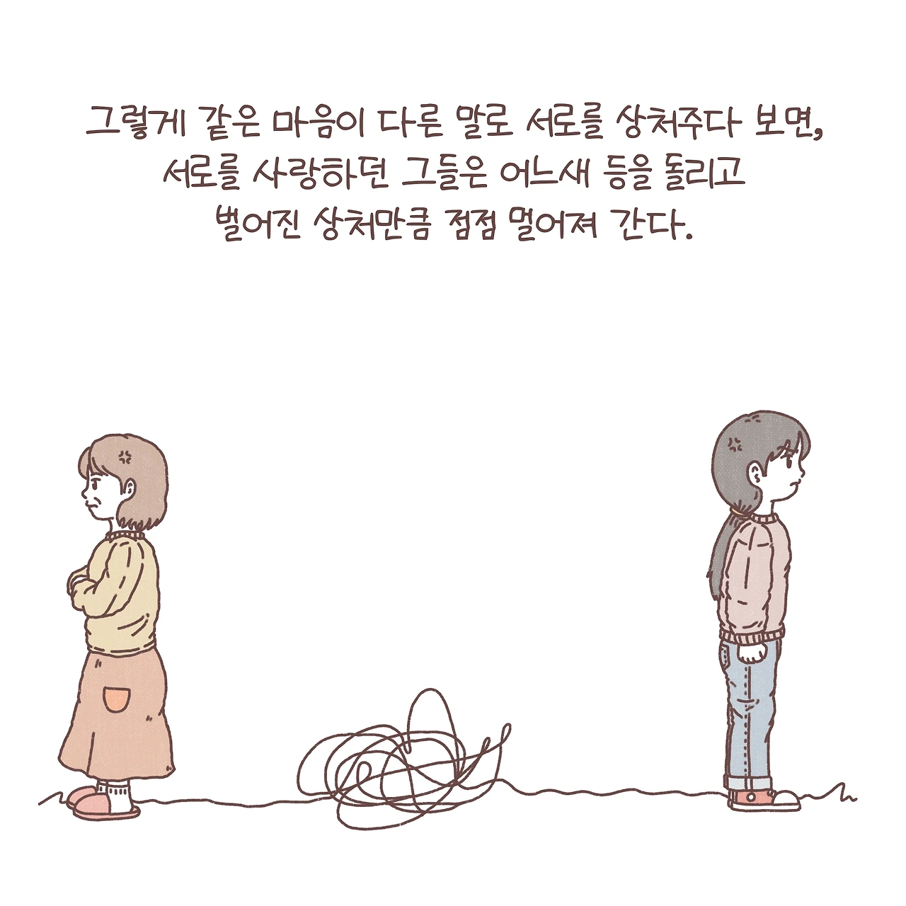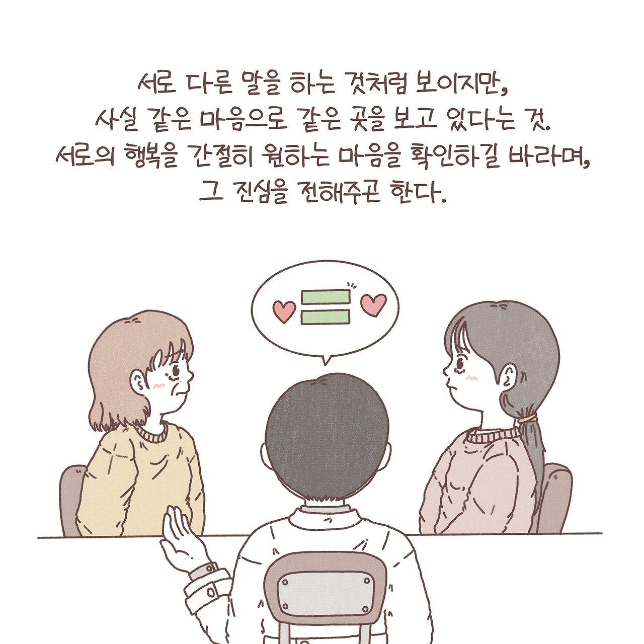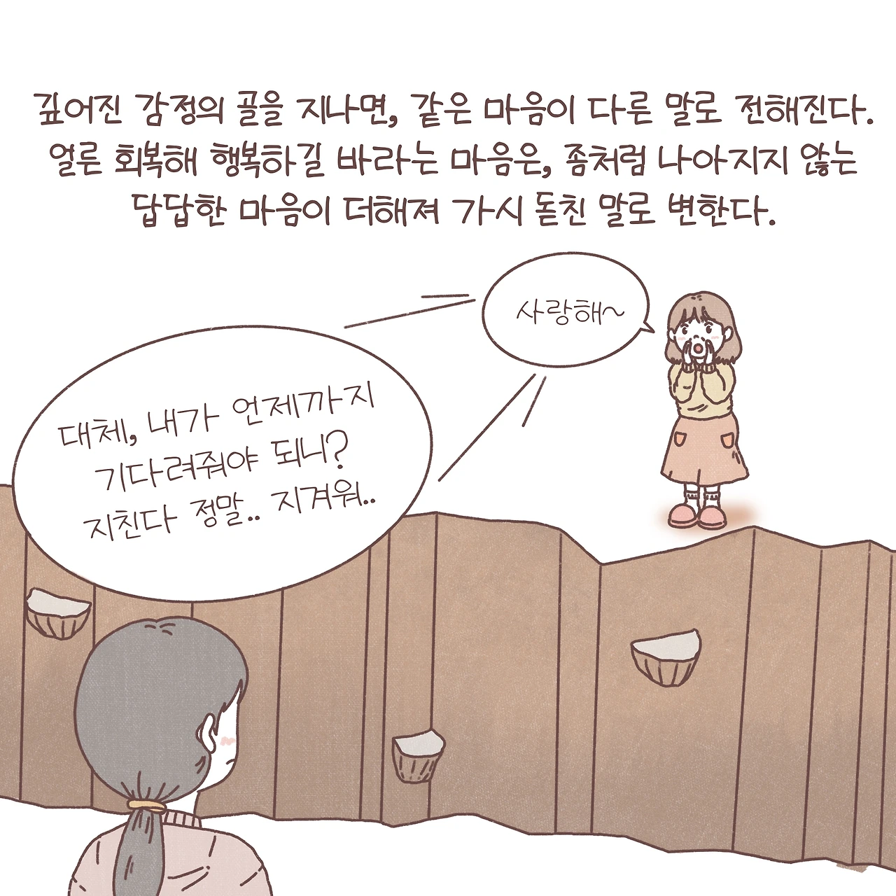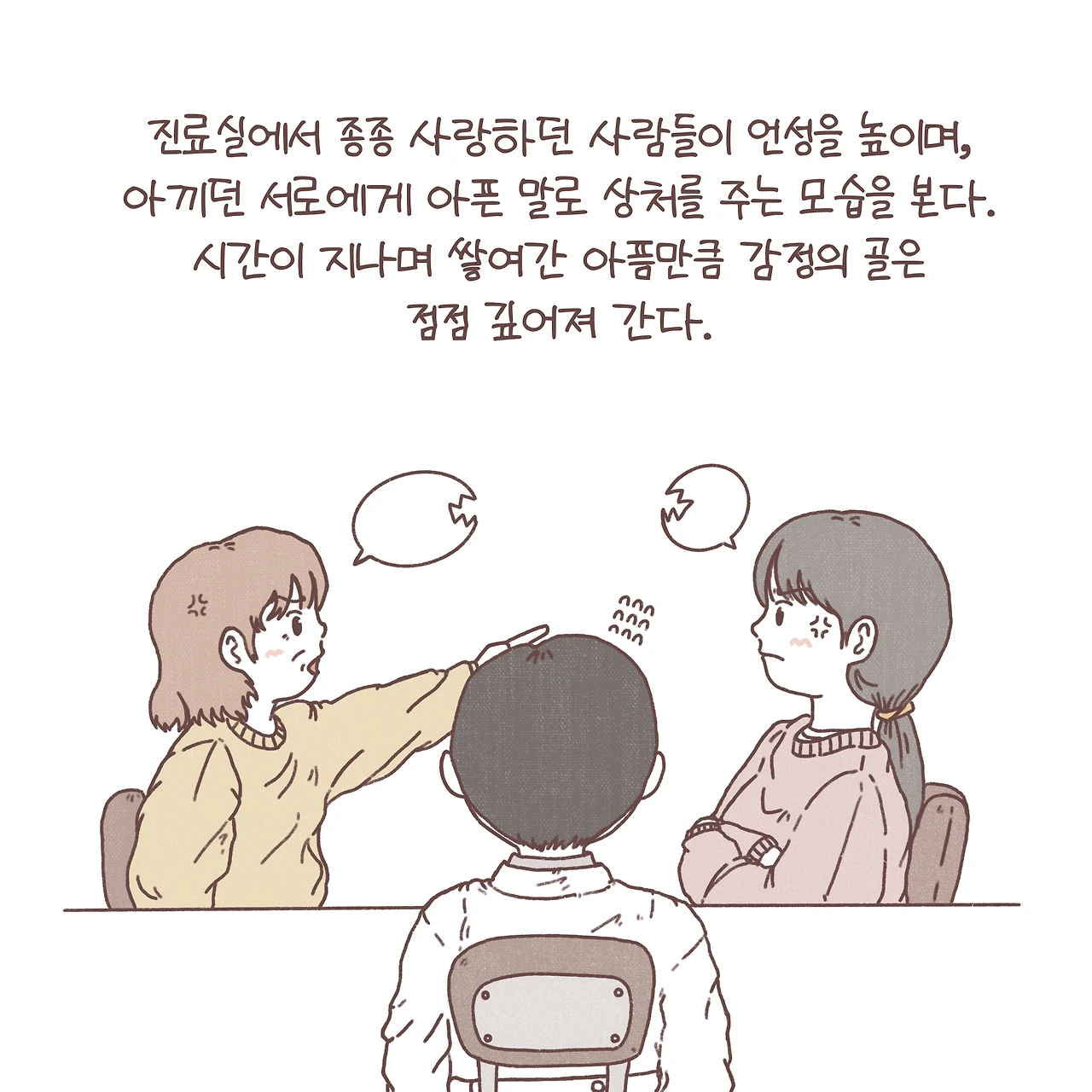 진료실에 가족들이 함께 찾아올 때가 있습니다. 종종 사랑하던 이들이 서로에게 모진 말을 하며, 상처를 주는 모습을 보기도 해요. 따로 앉아 이야기를 천천히 들어보면, 사실 같은 마음을 다른 말로 표현하고 있는 경우가 많습니다. 사랑하는 사람이 행복하길 바라는 마음. 잠시, 마음에 찾아온 병이 얼른 나아서 예전처럼 행복하길 바라는 마음, 다시 떳떳하게 좋은 모습으로 함께 걸어가고픈 마음. 그런 마음들이 길어진 시간 동안 쌓인 상처에 깊어진 감정의 골을 지나면 모진 말로 변해 서로를 아프게 하곤 하죠. 우리는 분명 같은 곳을 바라보며, 같은 마음을 지니고 있다는 것을 전해주기도 합니다. 서로의 마음을 확인하고 다시 멀어진 손을 잡고 같은 곳을 바라보며 걸어갈 수 있길 바랍니다.