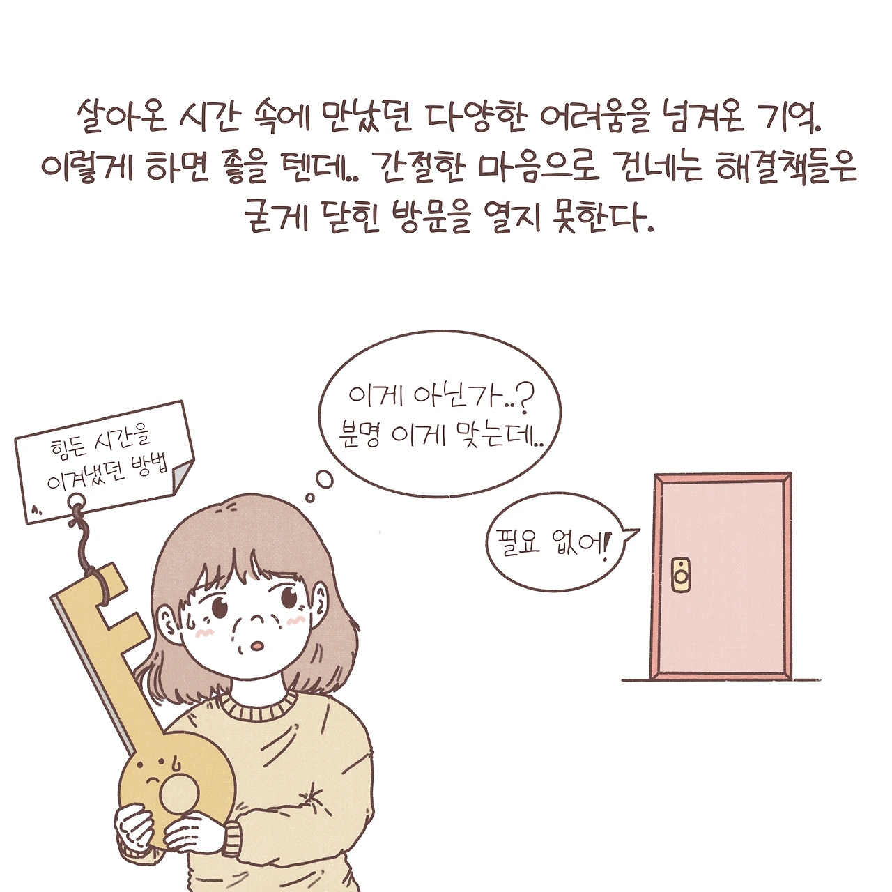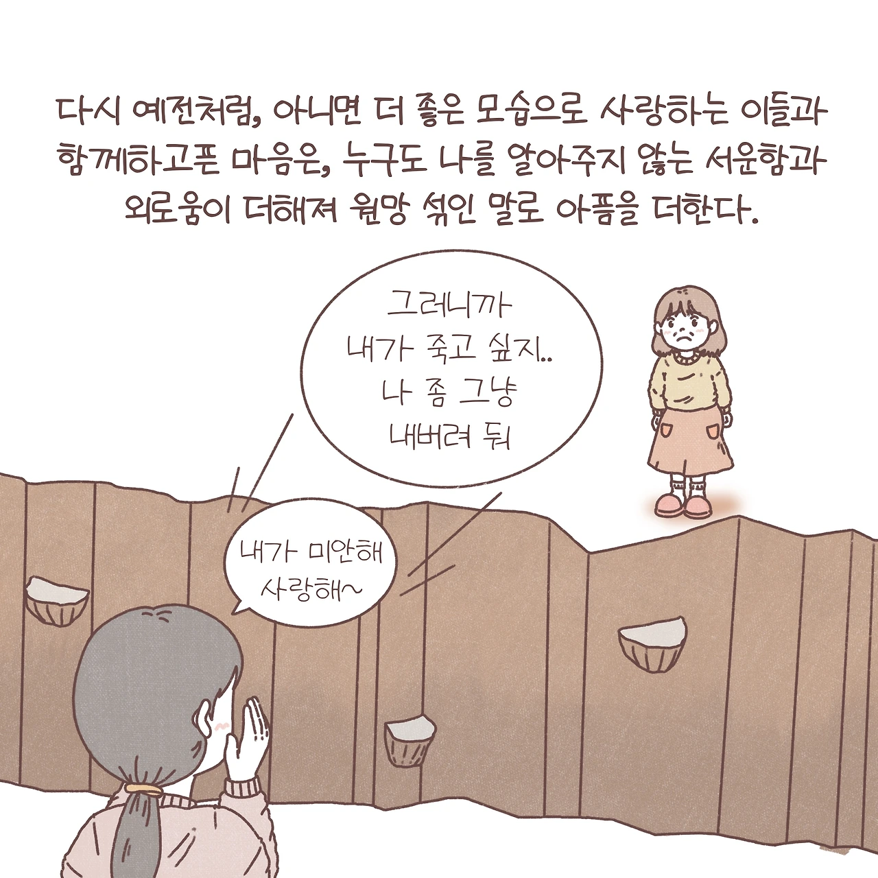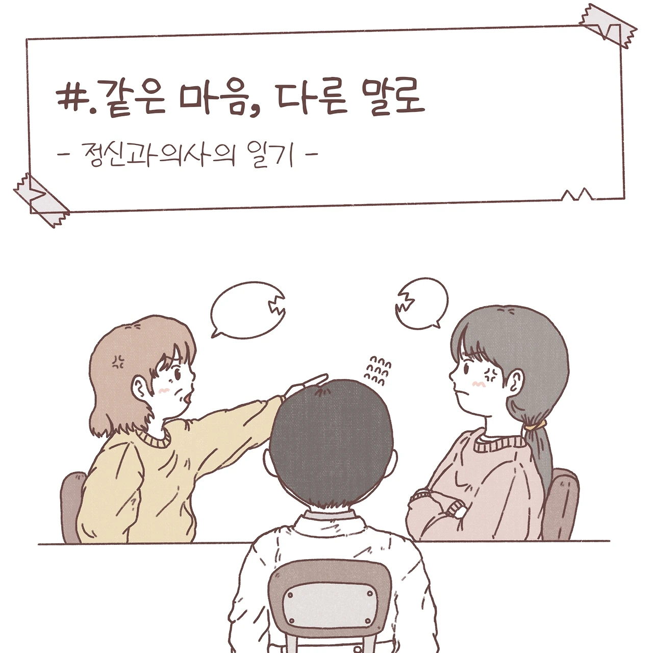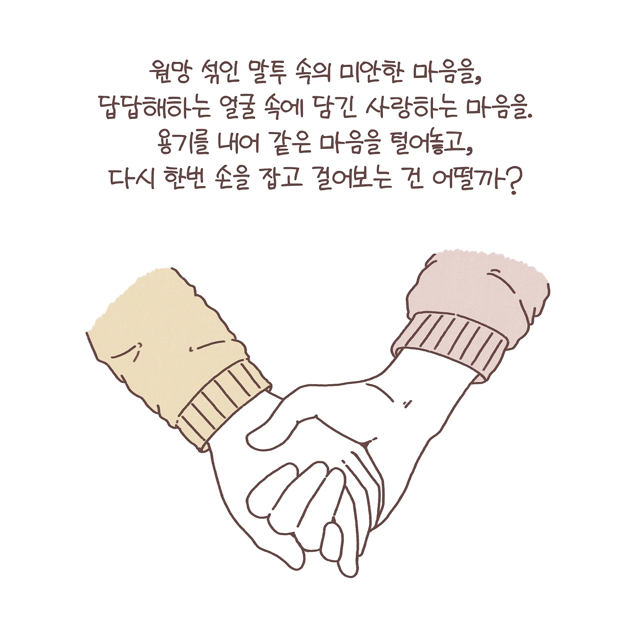 진료실에 가족들이 함께 찾아올 때가 있습니다. 종종 사랑하던 이들이 서로에게 모진 말을 하며, 상처를 주는 모습을 보기도 해요. 따로 앉아 이야기를 천천히 들어보면, 사실 같은 마음을 다른 말로 표현하고 있는 경우가 많습니다. 사랑하는 사람이 행복하길 바라는 마음. 잠시, 마음에 찾아온 병이 얼른 나아서 예전처럼 행복하길 바라는 마음, 다시 떳떳하게 좋은 모습으로 함께 걸어가고픈 마음. 그런 마음들이 길어진 시간 동안 쌓인 상처에 깊어진 감정의 골을 지나면 모진 말로 변해 서로를 아프게 하곤 하죠. 우리는 분명 같은 곳을 바라보며, 같은 마음을 지니고 있다는 것을 전해주기도 합니다. 서로의 마음을 확인하고 다시 멀어진 손을 잡고 같은 곳을 바라보며 걸어갈 수 있길 바랍니다.