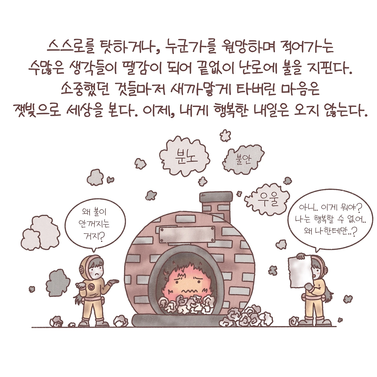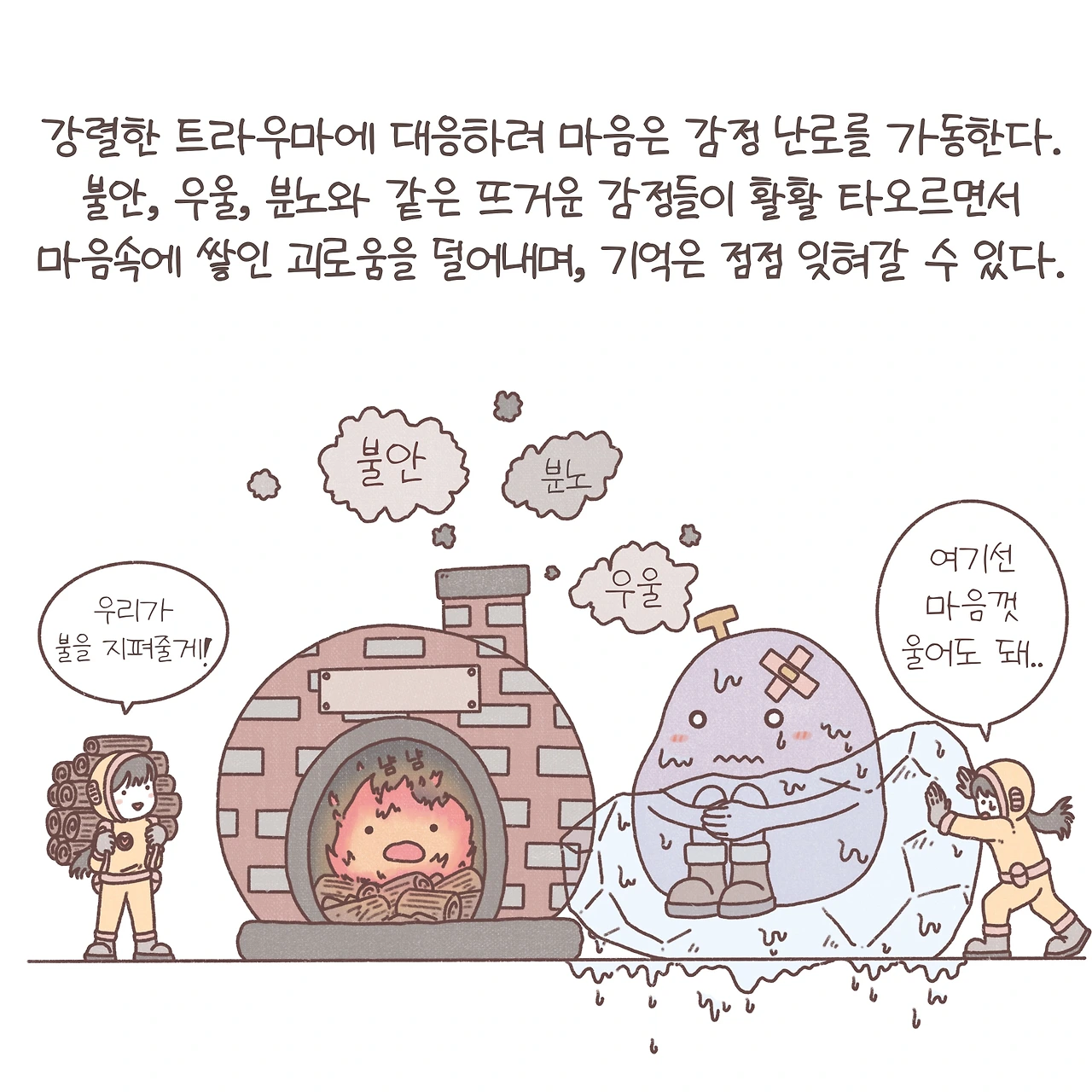 꼭 외상 후 스트레스장애 정도로 큰 트라우마가 아니더라도, 우리는 종종 과거의 기억에 괴로워하곤 하죠. 트라우마가 될 법한 어떤 기억에 대해 초반에 나타나는 감정들(불안, 우울, 분노 등)은 사실, 잘못된 것은 아닙니다. 나를 괴롭히는 나쁜 기억과 생각을 덜어내기 위해 마음속에서 커다란 감정난로를 켜고 뜨겁게 에너지를 소비하는 거라고 생각하면 이해하기 쉬울 것 같아요. 그런데, 때로는 어떤 기억들은 시간이 많이 지난 뒤에도 나를 괴롭게 합니다. 마음 한편에 그날의 내가 같은 자리에 앉아 남을 탓하고, 때로는 나를 탓하는 생각들을 매일 일기에 적고는 하죠. 이런 생각들은 또 다른 연료가 되어 끊임없이 감정을 태우고, 어느새 소중했던 것들마저 새까맣게 그을려 잿빛으로 세상을 바라보게 됩니다. 나에게 행복은 너무나 먼 이야기고, 모든 것이 가치가 없어 보일지도 몰라요.