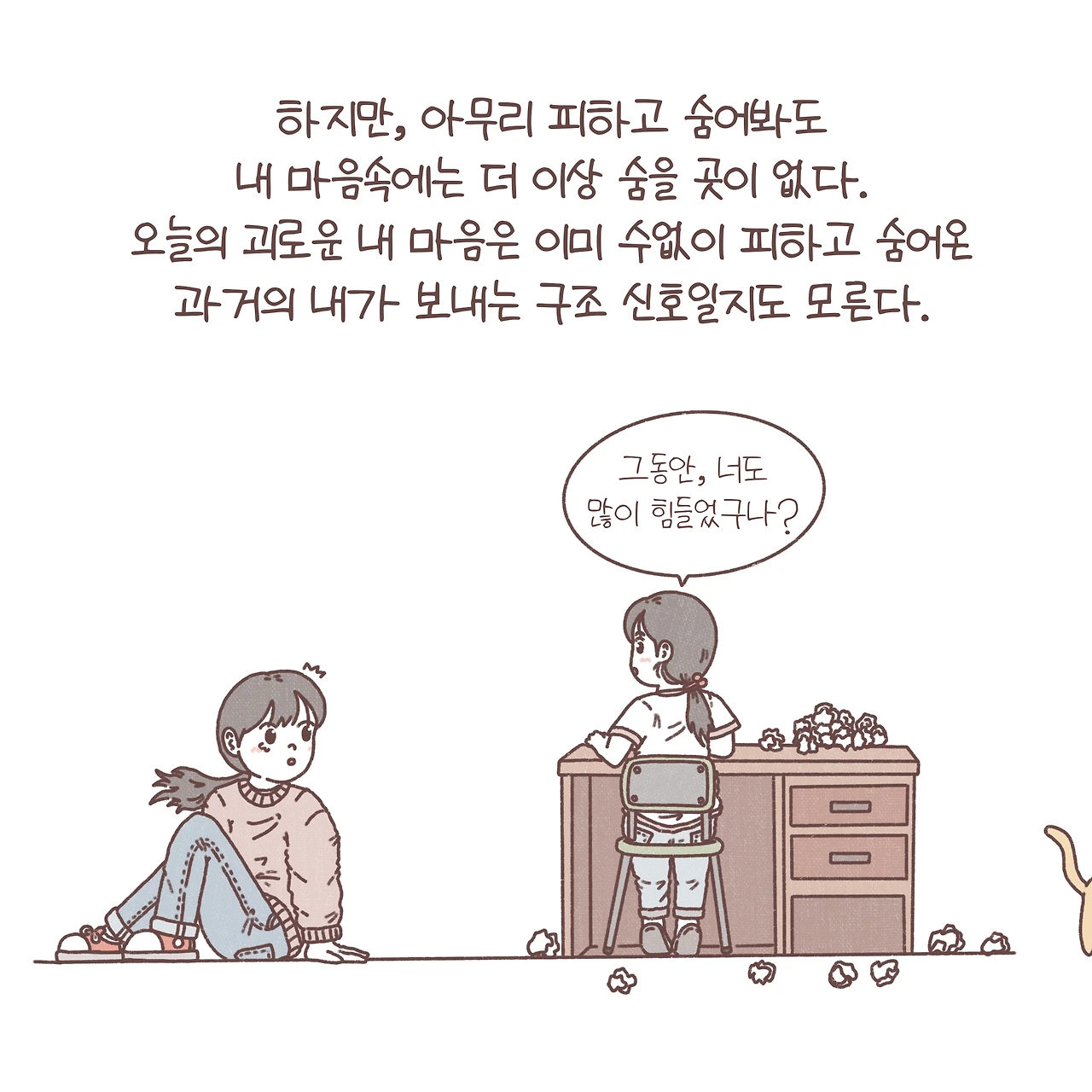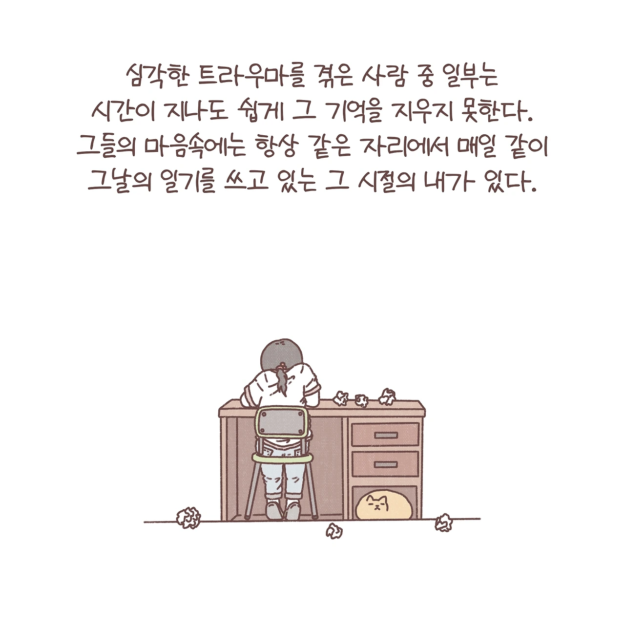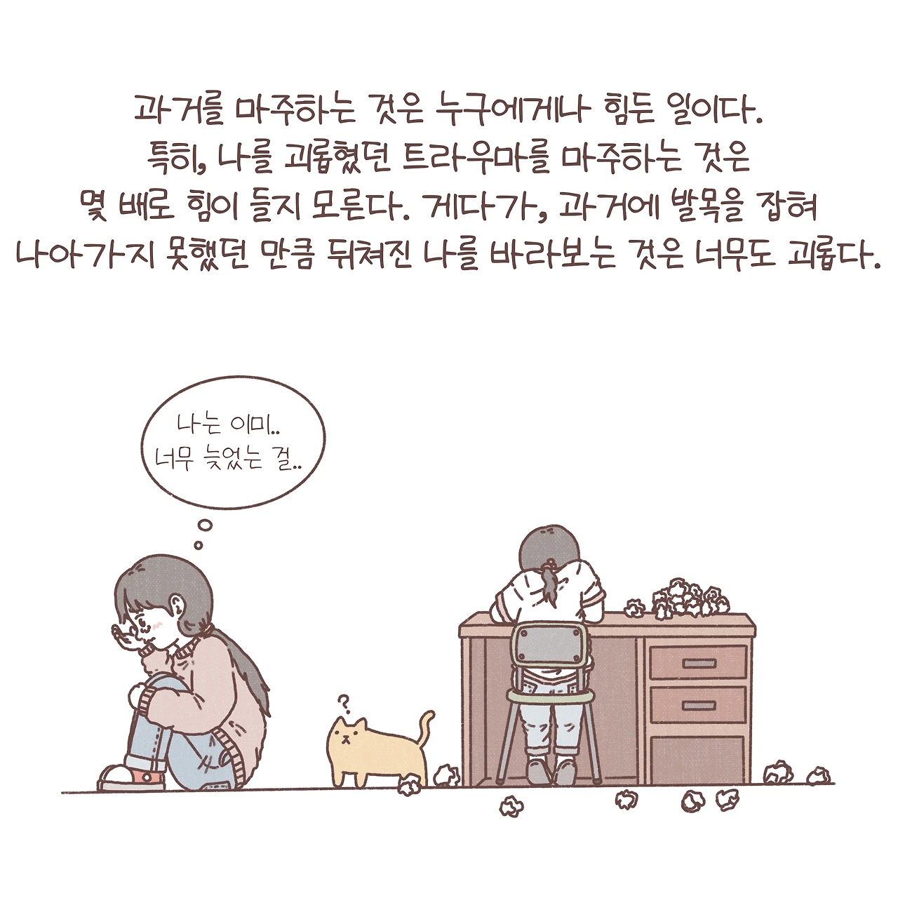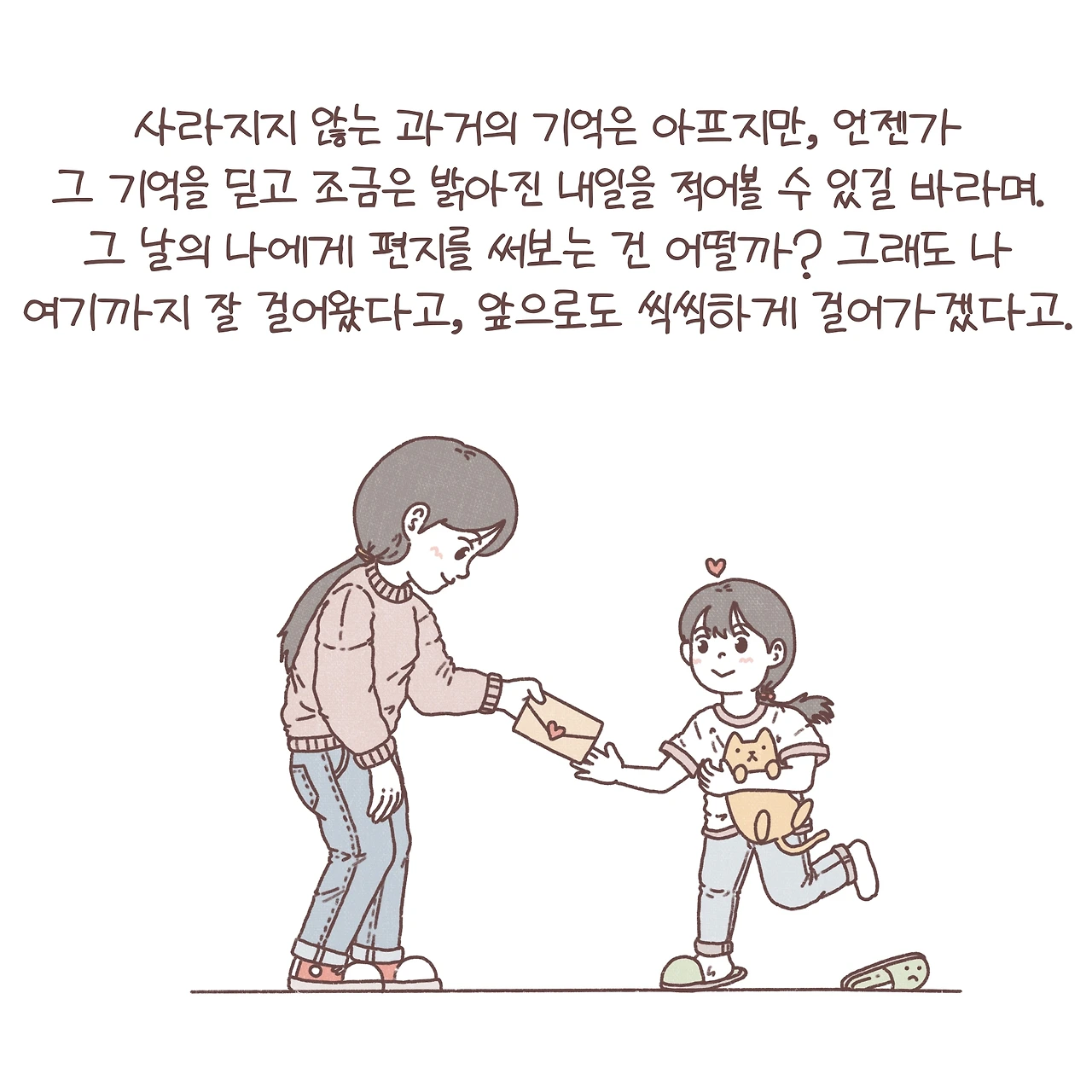 과거의 기억을 지울 수도, 바꿀 수도 없지만, 그래서 너무 괴롭지만.. 또 지난 시간 동안 뒤쳐진 것만 같은 내 모습이 아프지만, 새롭게 적어갈 수 있는 오늘과 내일의 이야기를 위해. 때로는 그날의 나에게 편지를 적어보는 건 어떨까요? 많이 힘들었지만, 나 여기까지 잘 왔다고, 그리고 앞으로도 씩씩하게 걸어가 볼 거라고.