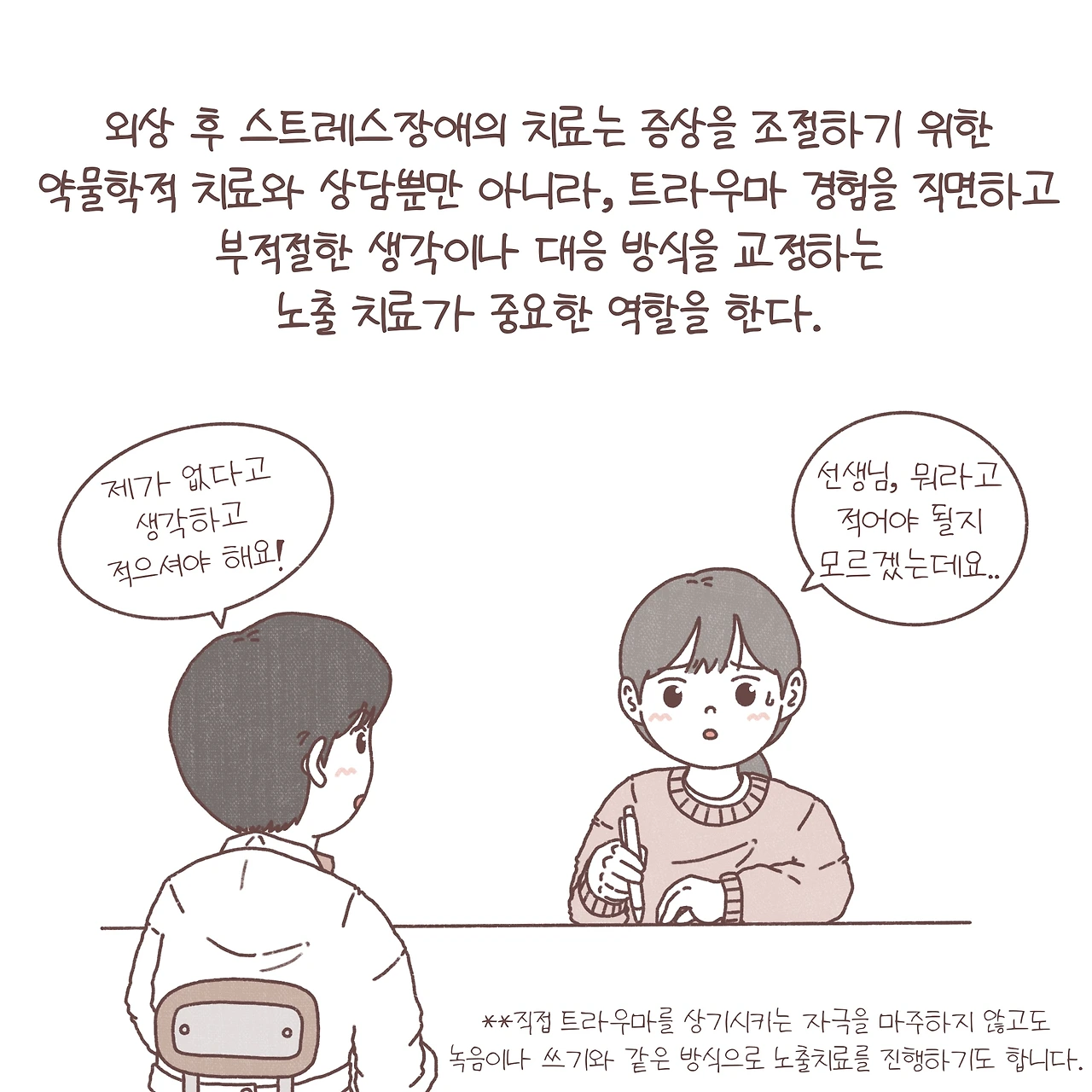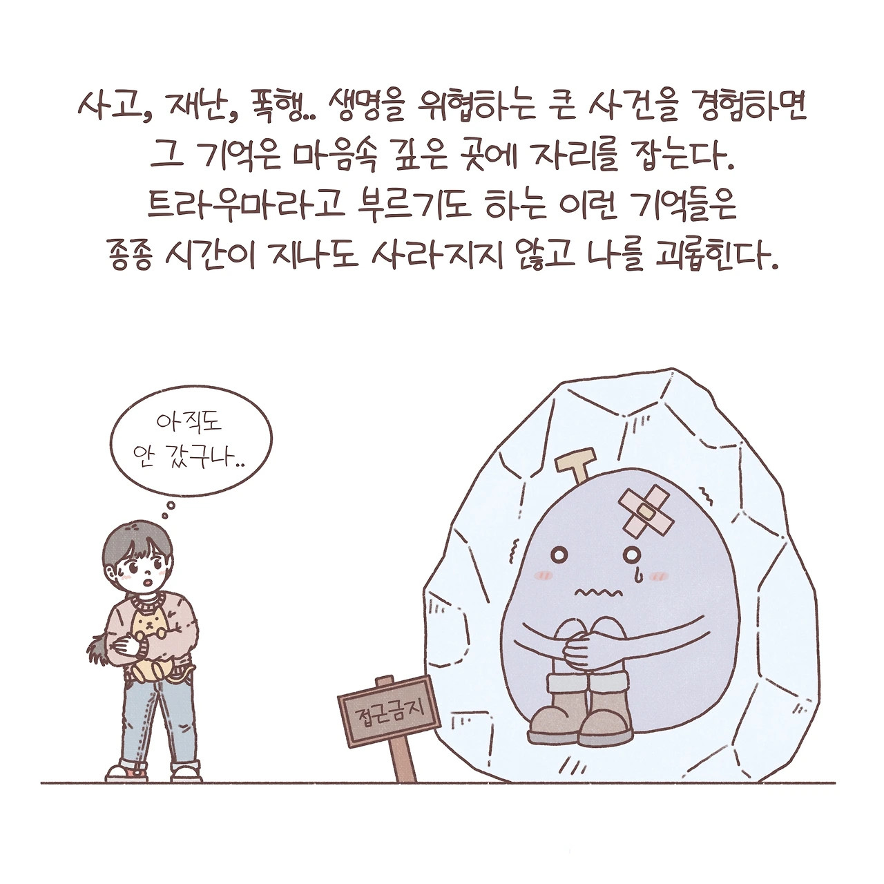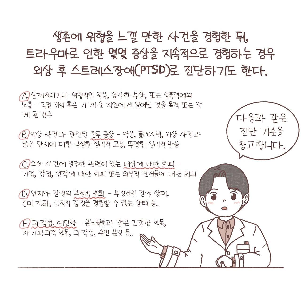 외상 후 스트레스장애(PTSD)라는 용어를 들어보셨나요? 전쟁이나 큰 사고, 폭행처럼 생명에 위협을 느낄 정도로 큰 사건을 겪은 뒤에 생긴 트라우마와 관련된 질환으로, 종종 영화나 드라마에서 다루어지곤 해서 그런지, 비교적 널리 알려진 용어인 것 같습니다. 트라우마를 떠올리게 하는 작은 단서에 대한 반응과 회피 외에도 지속적으로 부정적인 감정 상태라던지, 흥미 저하, 집중력 저하와 같은 만성적인 증상들도 함께 나타나기도 해요. 우울증과 같은 다른 질환이 동반되는 경우도 흔하고, 섞여서 나타나는 증상들을 특정 질환으로 딱 나누어서 구분하기 어려운 경우도 많았던 것 같습니다.