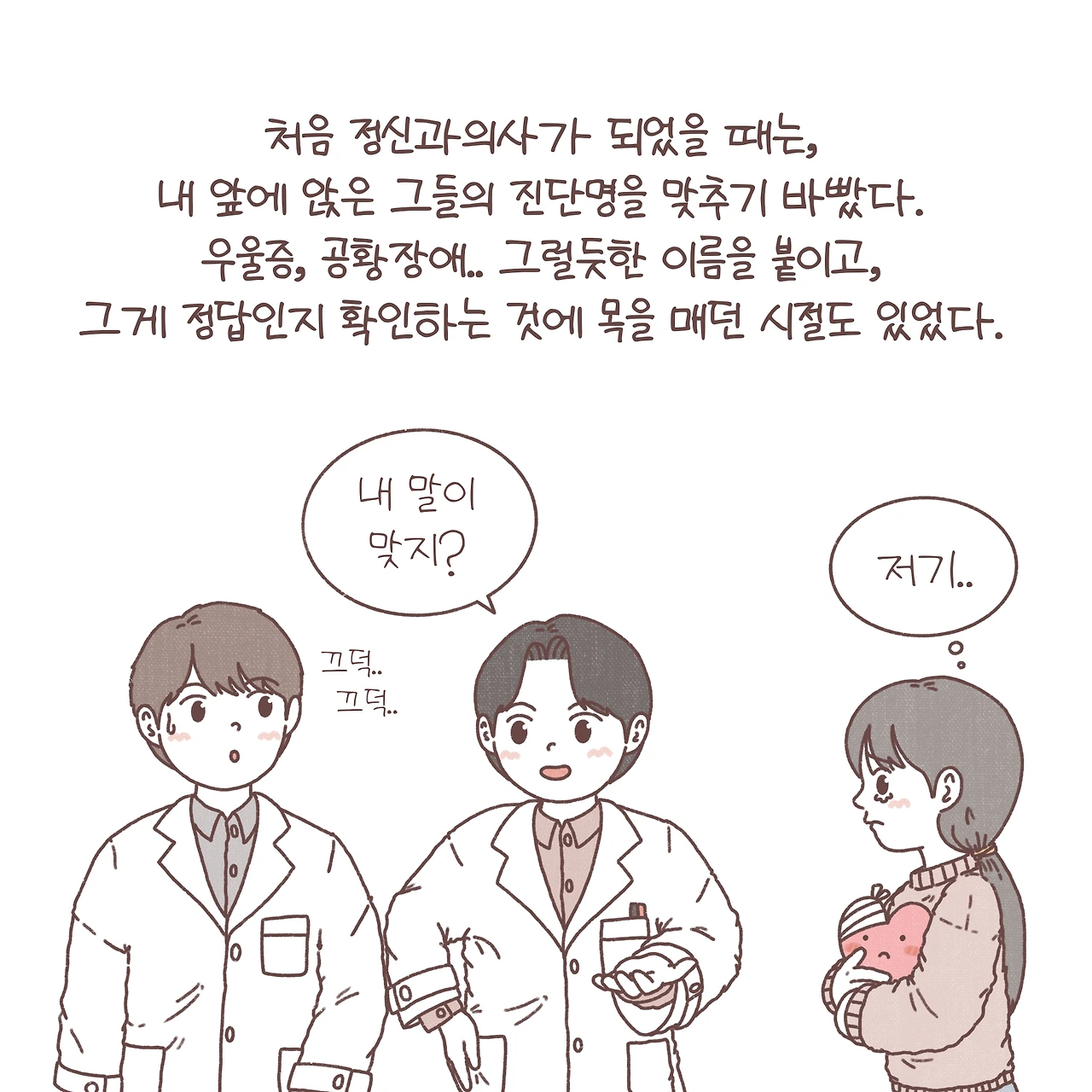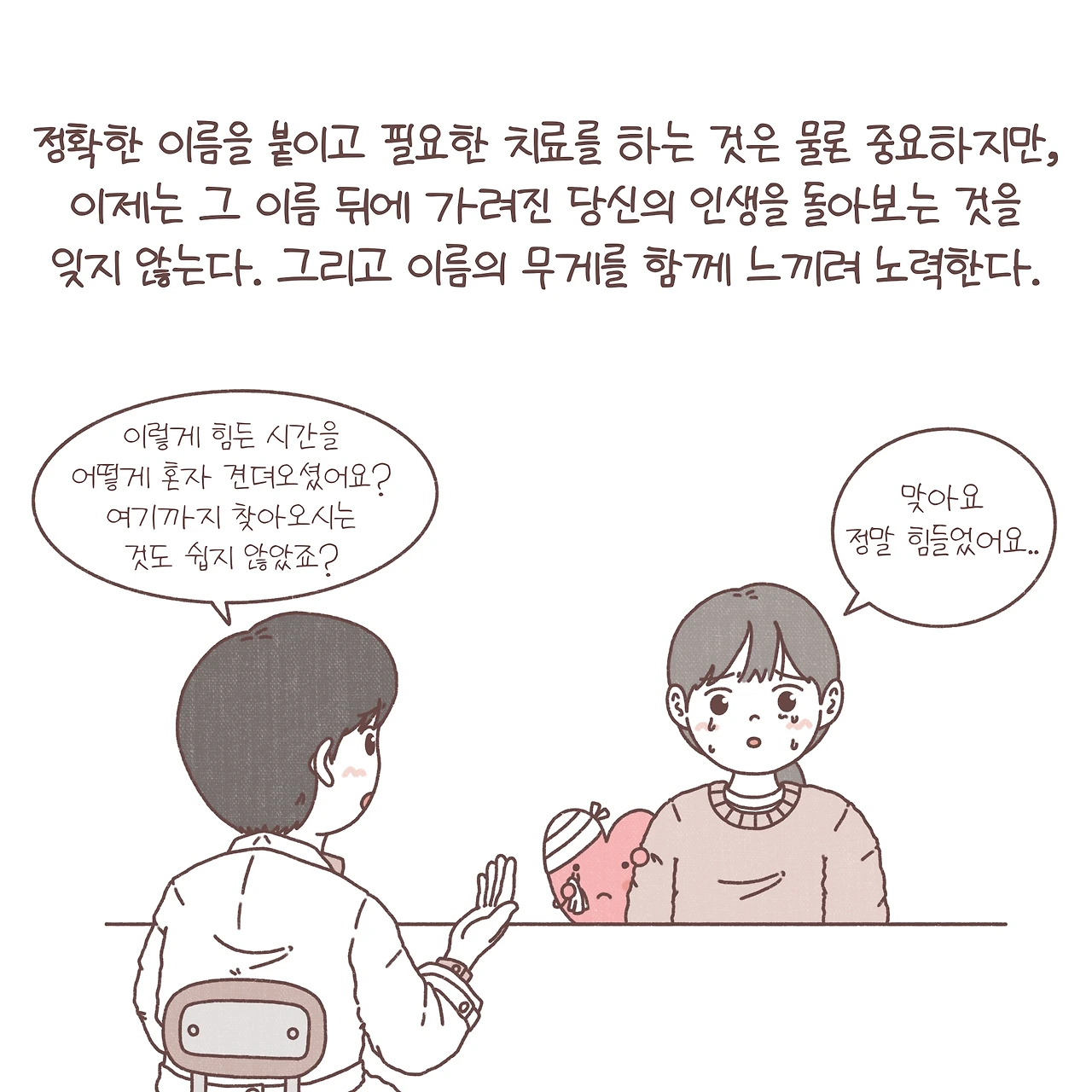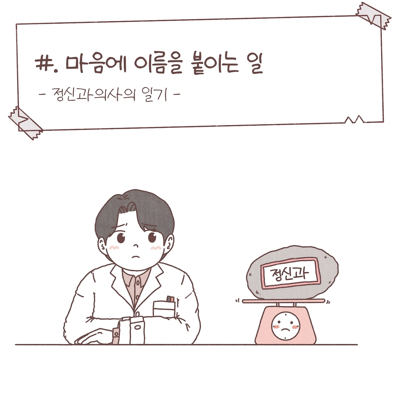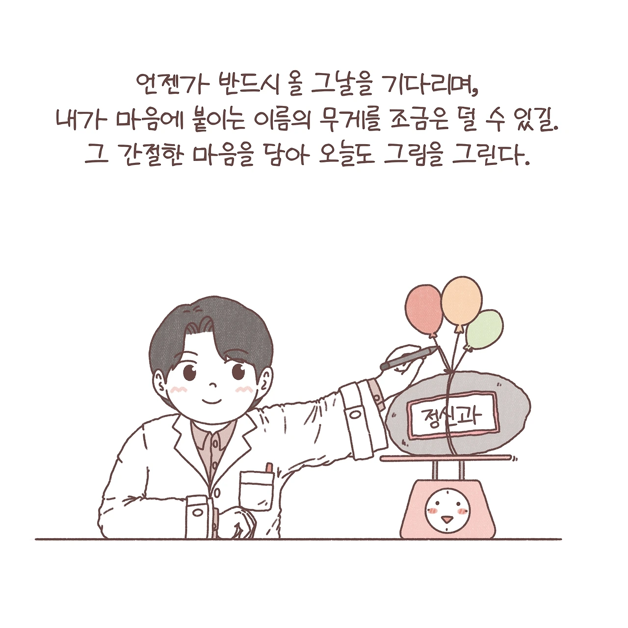안타깝지만, 우리가 살아가는 세상에서 아직 정신과라는 단어가 무겁게 느껴지는 것을 알고 있습니다. 점점 사회적 시선이 바뀌고, 개개인의 인식이 변하면서 조금은 부담을 덜고 정신과를 찾는 분들이 늘고 있지만, 아직도 단어의 무게에 도움의 손길을 거절하는 분들이 많습니다. 이제는 정확한 진단을 내리고 그에 따라 필요한 처치를 하는 것은 물론 중요하지만, 그 이름 뒤에 숨은 당신의 인생을 놓치지 않으려 노력합니다. 병이 아닌 사람을 보라는 한 원장님의 조언을 마음에 새기며, 제가 붙인 그 이름의 무게를 함께 느껴보곤 하죠. 언젠가 그 이름의 무게가 조금은 가벼워지길 바라며 오늘도 이렇게 그림을 그립니다.