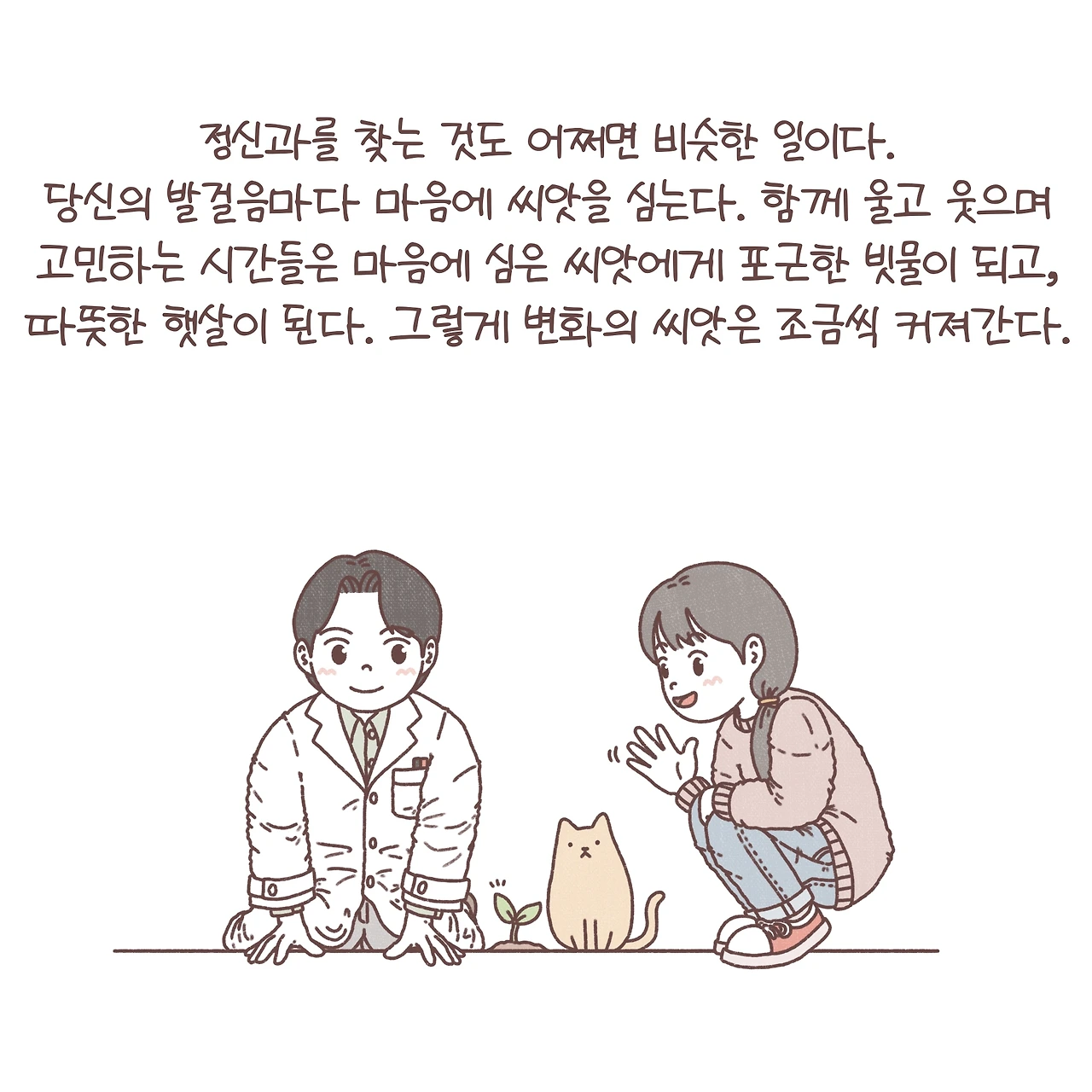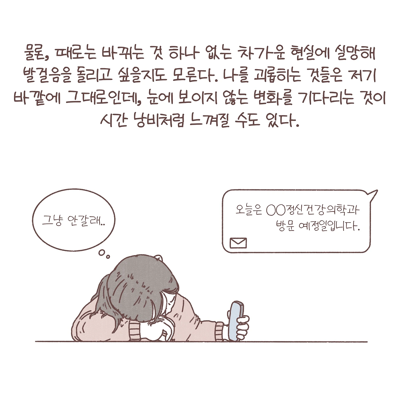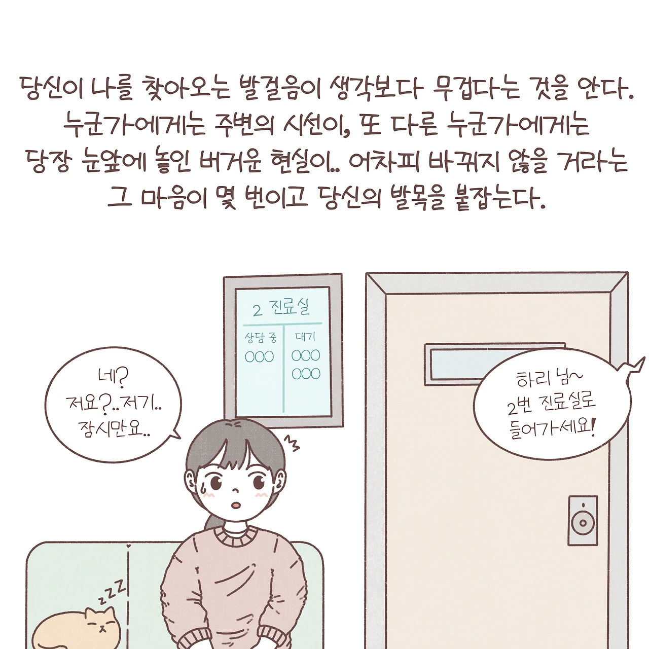아파서 병원을 찾는 것을 망설이거나, 주변의 눈치를 보며 고민했던 적이 있나요? 아프면 병원에 가서 필요한 검사를 받고, 약을 처방받는 것은 당연한 일인데.. 아직도 제가 앉은 이 진료실을 찾아오는 분들의 발걸음은 생각보다 무거운 것 같습니다. 때로는 주변의 시선이나 눈앞에 놓인 버거운 현실에, 어차피 바뀌지 않을 거라는 생각에 문 앞에서 발걸음을 돌리기도 하죠.
