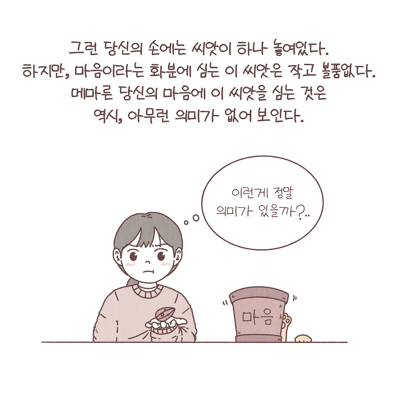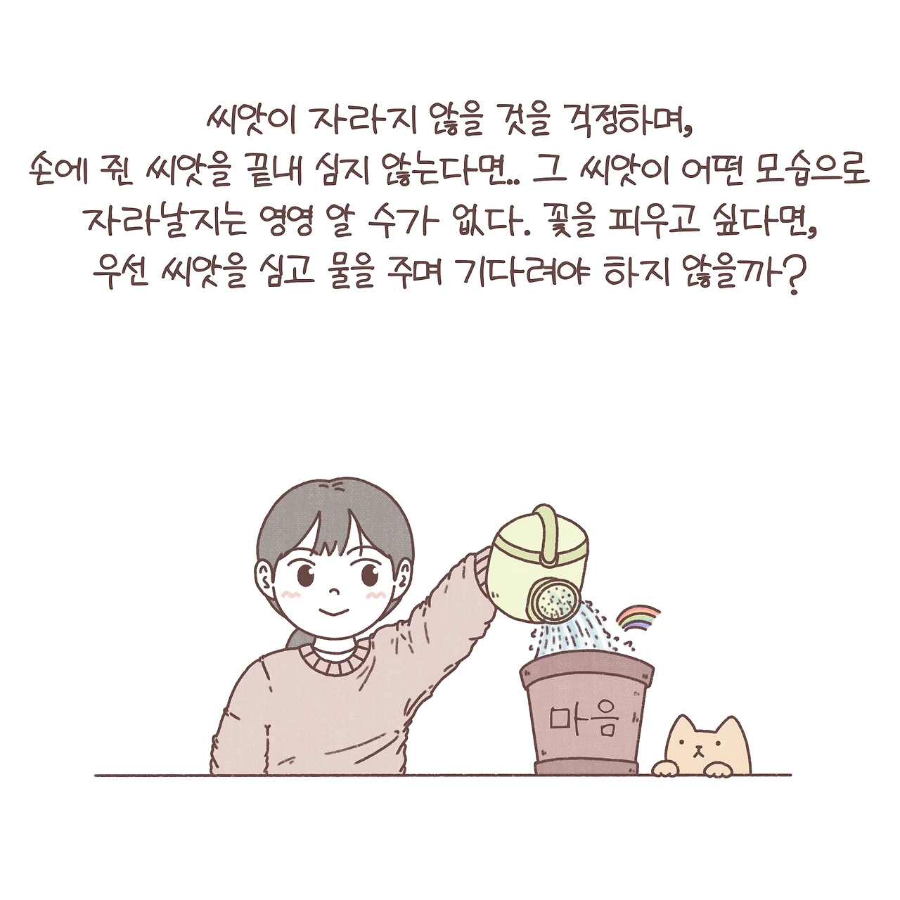 당장 눈에 보이는 변화가 없더라도, 함께 울고 웃으며 노력해 온 시간들이 씨앗에게 포근한 빗물과 따스한 햇빛이 되어 어느새 싹이 돋아나겠죠. 어차피 변하지 않을 것이라 단정 짓고, 끝내 그 씨앗을 심지 않는다면.. 씨앗은 씨앗인 채로 남아있을 수밖에 없습니다.