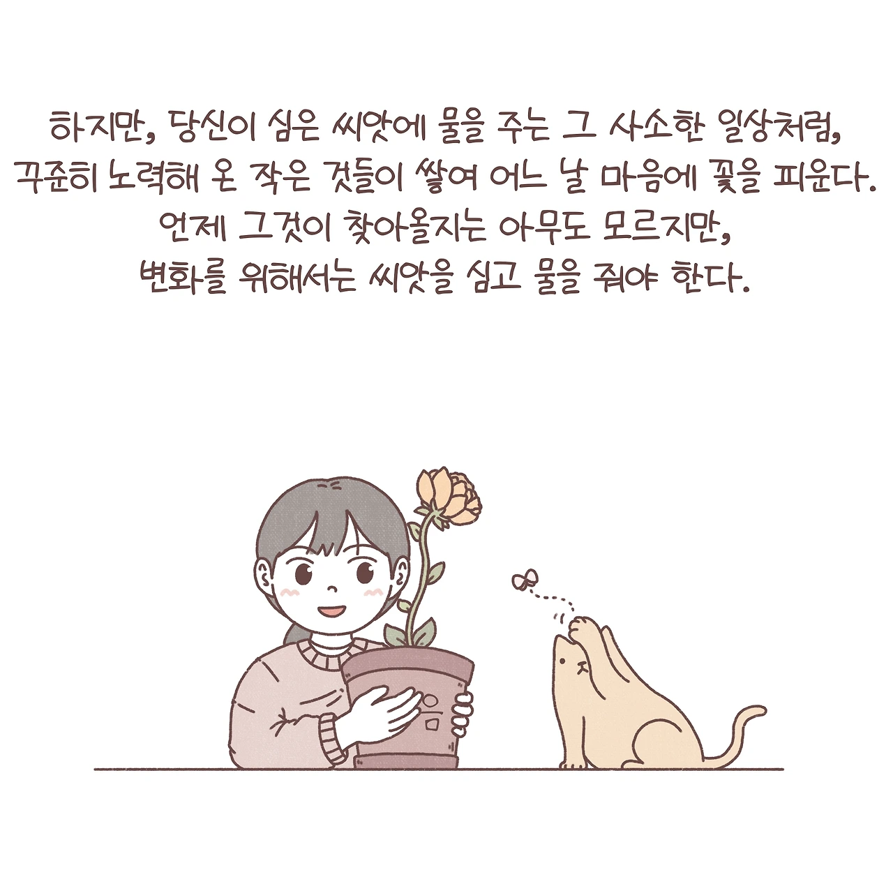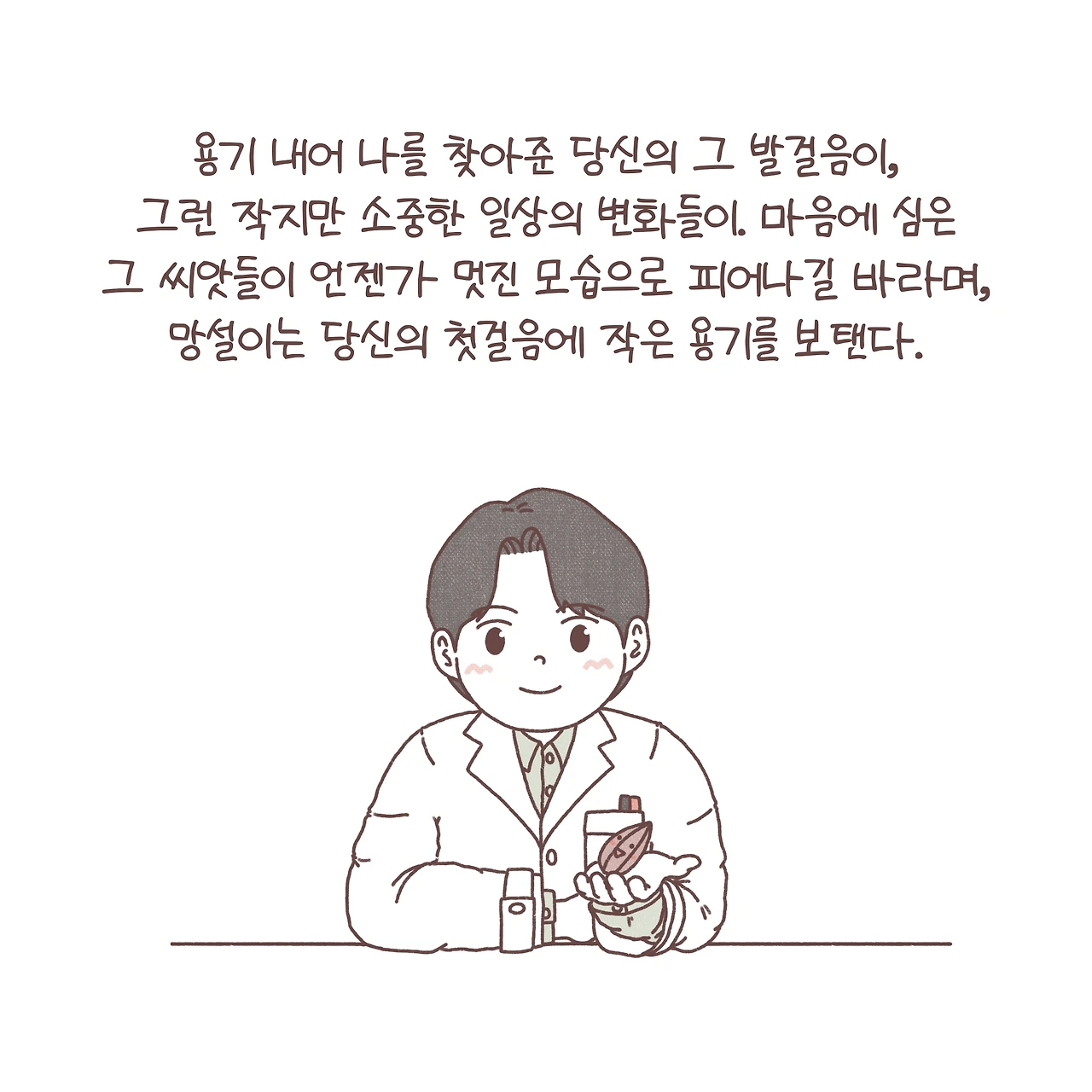 언제, 그 변화가, 어떤 모습으로 당신을 찾아올지는 아무도 알 수 없습니다. 하지만, 마음에 씨앗을 심는 것을 두려워하지 않았으면 해요. 용기 내어 찾아준 당신의 그 발걸음이, 작지만 소중한 일상의 변화들이 쌓이고 또 쌓여 언젠가 멋진 모습으로 피어나길 바라며, 망설이는 당신의 첫걸음에 작은 용기를 보태고 싶습니다.