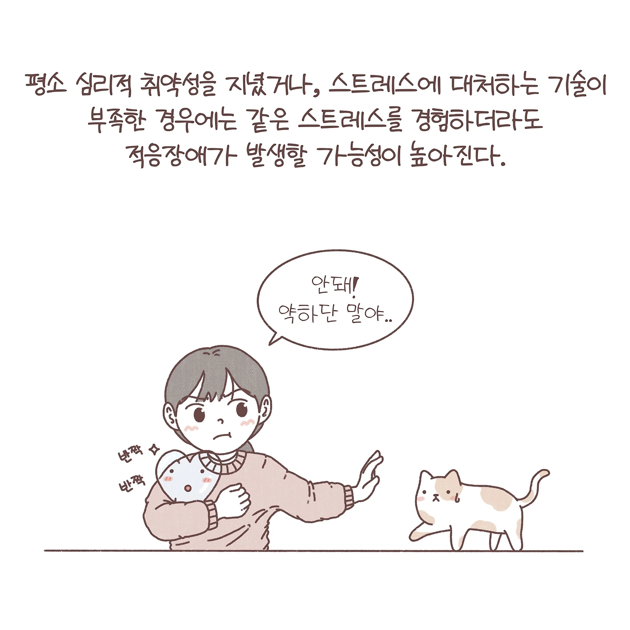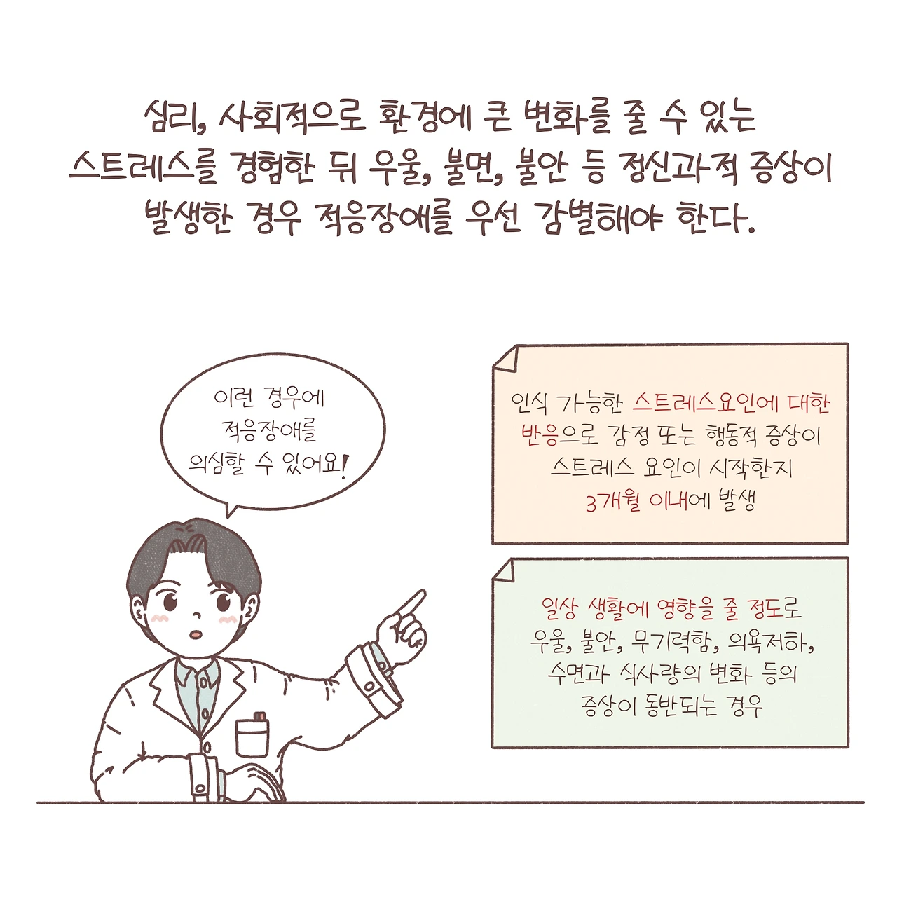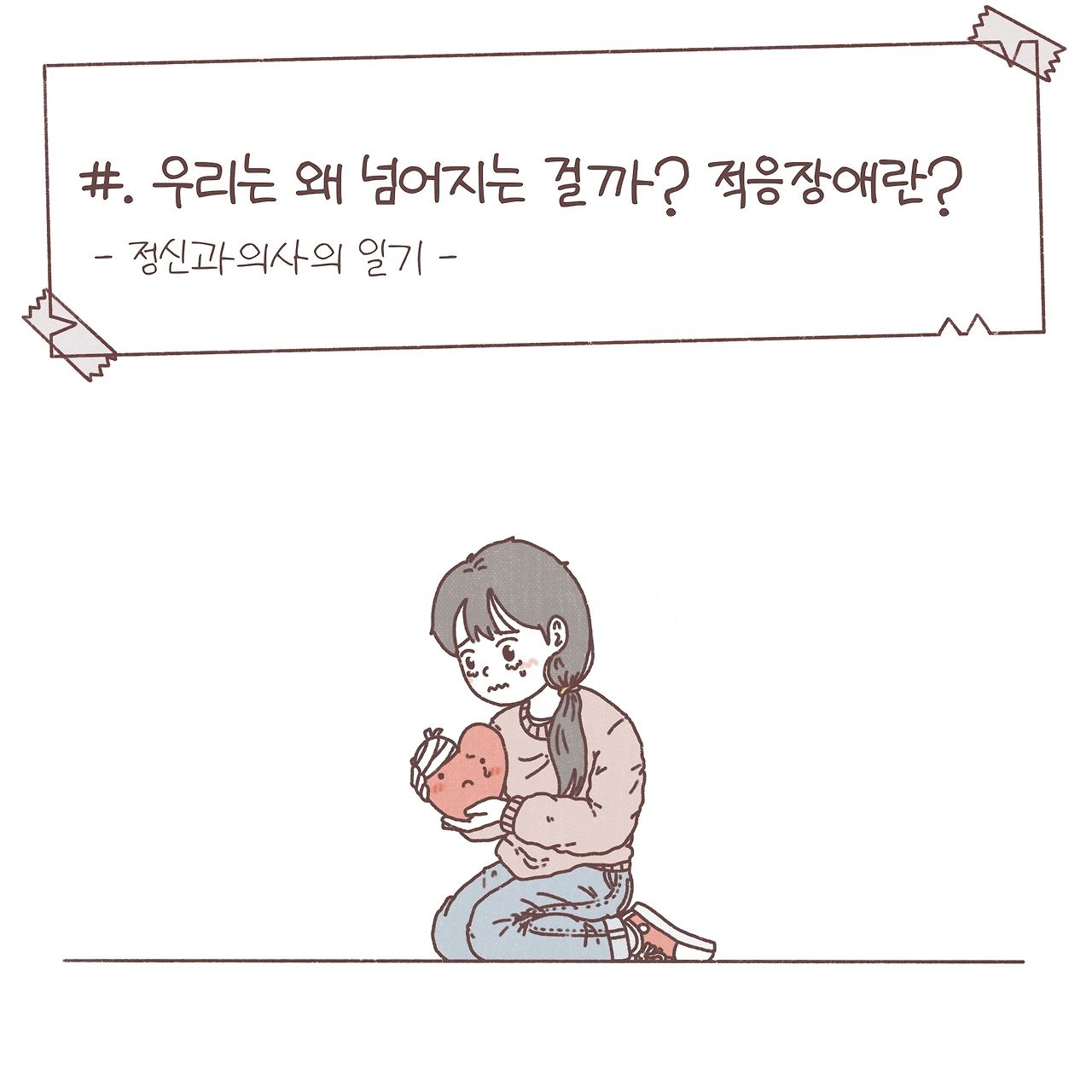 적응장애(Adjustment disorders)라는 용어를 들어보신 적이 있나요? 적응장애는 우울증이나 공황장애와 같이 비교적 흔하게 알려진 질환은 아니지만, 정신과에 처음 찾아오는 분들에게 자주 감별질환으로 붙이게 되는 질환 중 하나랍니다. 우리는 살아가며 수많은 좌절과 실패를 경험하죠. 때로는 갑작스럽게 찾아온 변화가 너무 무거워서 넘어지기도 합니다. 이렇게 다양한 스트레스요인을 경험하고 3개월 이내에 우울, 불안, 불면 등 다양한 감정과 심리 상태의 변화가 나타난 경우 적응장애를 의심해 볼 수 있어요.
