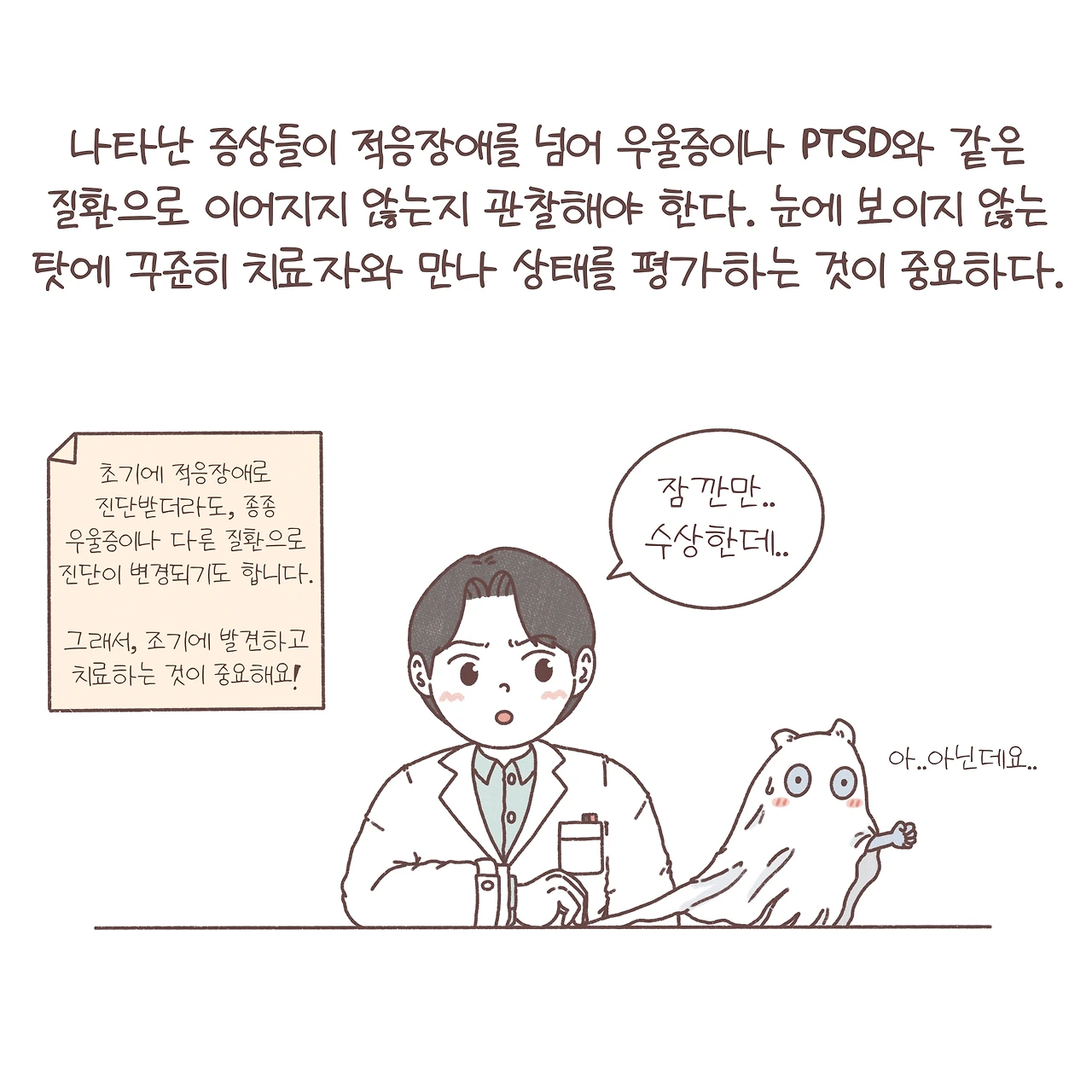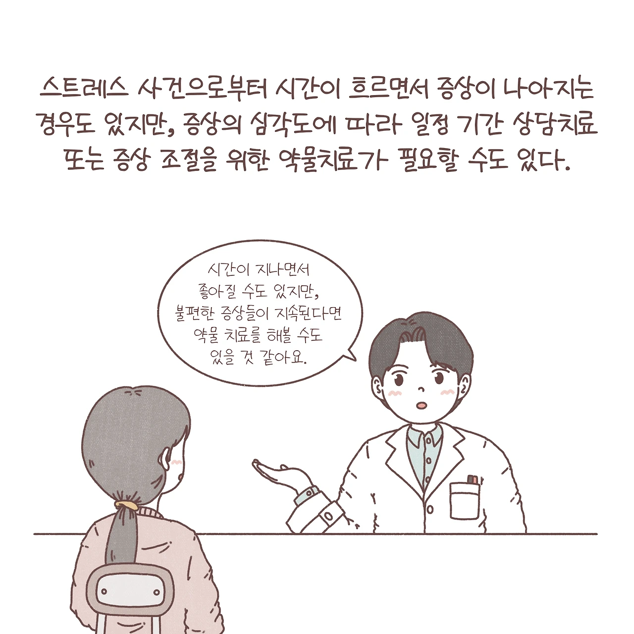 적응장애는 스트레스요인이 사라지고 시간이 지나며 자연스레 호전되기도 하지만, 증상의 정도와 개개인의 상황에 따라 종종 심리치료나 증상조절을 위한 약물치료가 필요한 경우도 있습니다. 적응장애의 증상들은 우울증과 같은 다른 질환에서도 흔히 나타나는 증상들을 포함하고 있기에, 시간을 두고 관찰하며 다른 질환이 의심되지는 않는지 평가하는 것도 중요하죠. 그렇기 때문에, 꼭 약물치료를 시작하지 않더라도 주기적으로 내원하여 힘든 감정에 대해 함께 이야기 나누고 스트레스에 대한 대처 방안을 세워보는 것을 권유드리기도 합니다.