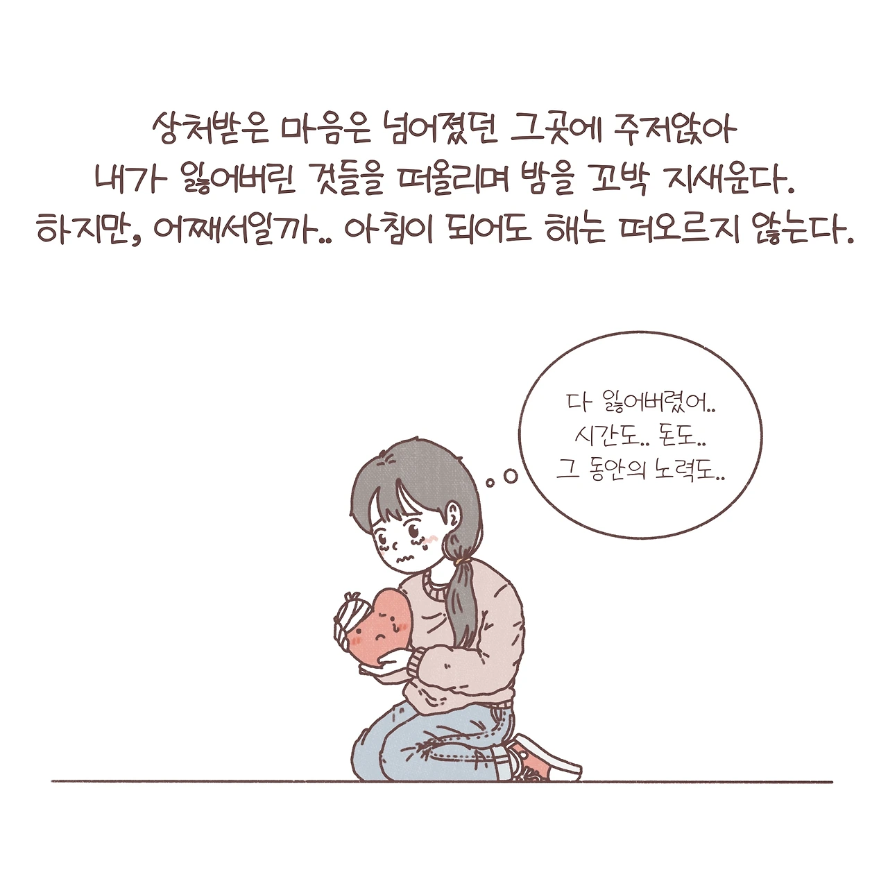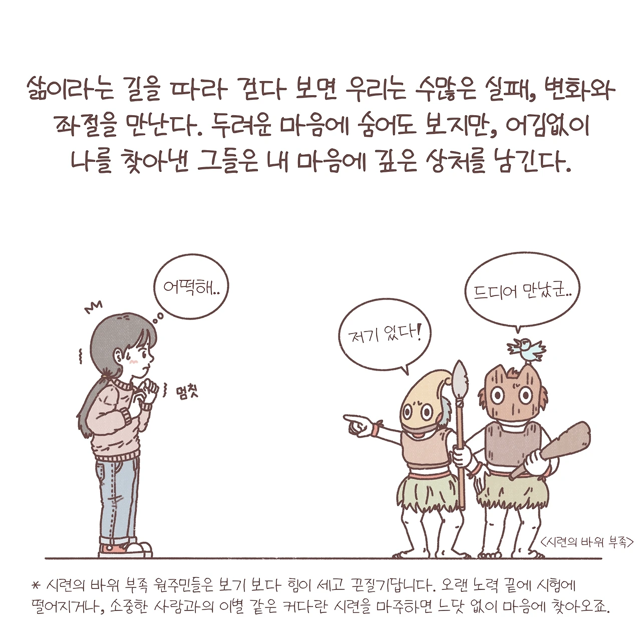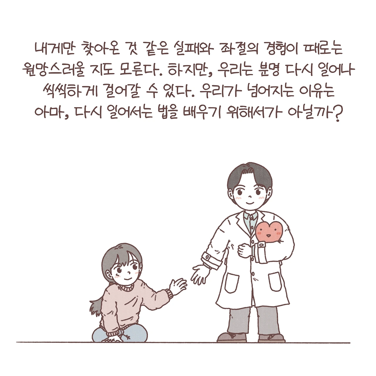 우리는 왜 자꾸만 넘어질까요? 때로는 나만 겪는 것 같은 어려움과 괴로운 시간들이 원망스러울 지도 모릅니다. 하지만, 우리가 넘어지는 이유는 아마, 다시 일어서는 법을 배우기 위해서가 아닐까요? 다시 일어나 씩씩하게 걸어갈 당신의 내일에 작은 용기를 보탭니다.