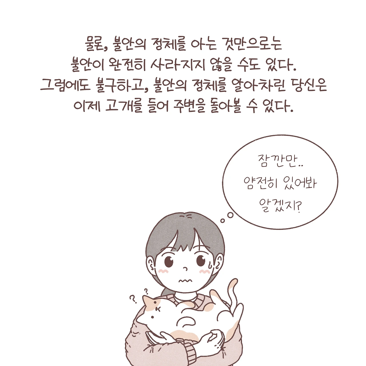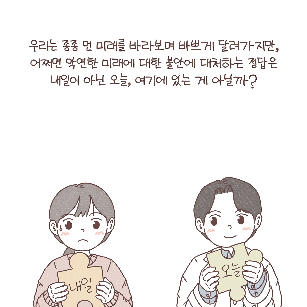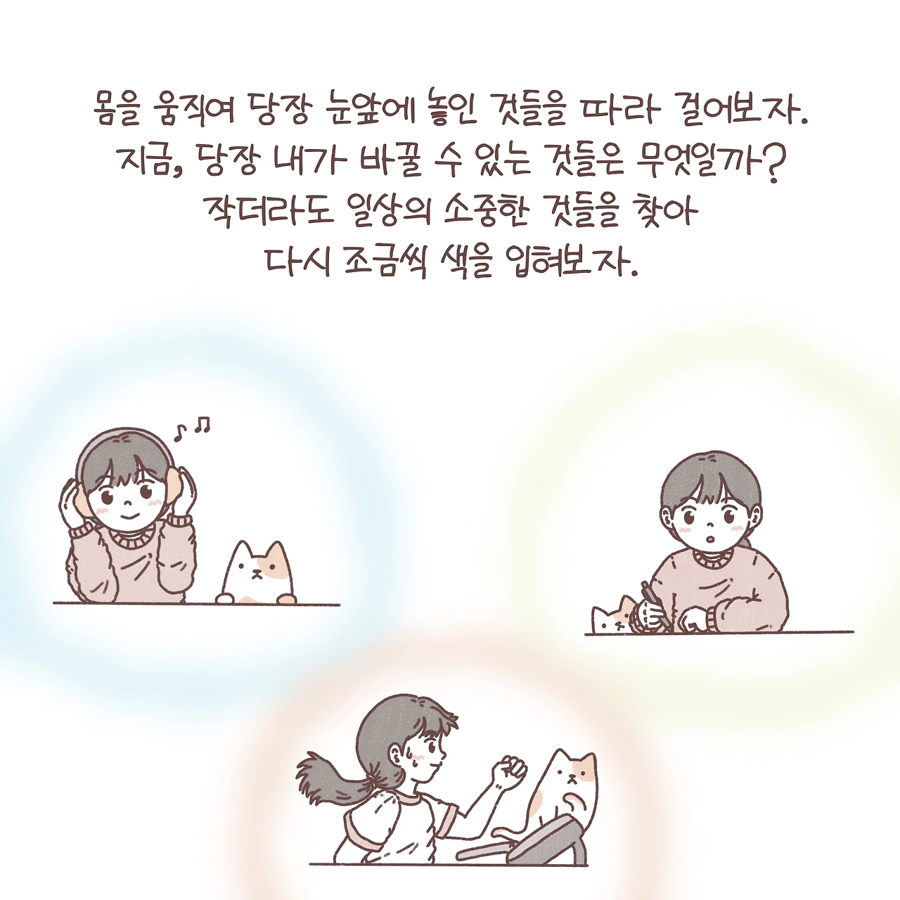 비록 불안이라는 감정이 완전히 사라지지는 않더라도, 우리는 일상 속 소중한 것들을 찾아 조금씩 다시 색을 입혀갈 수 있습니다. 먼 미래만을 바라보며 바쁘게 달려가는 우리. 막연한 미래에 대한 불안에 대처하는 정답은 어쩌면 내일이 아닌 오늘, 여기에 있는 걸지도 모릅니다.