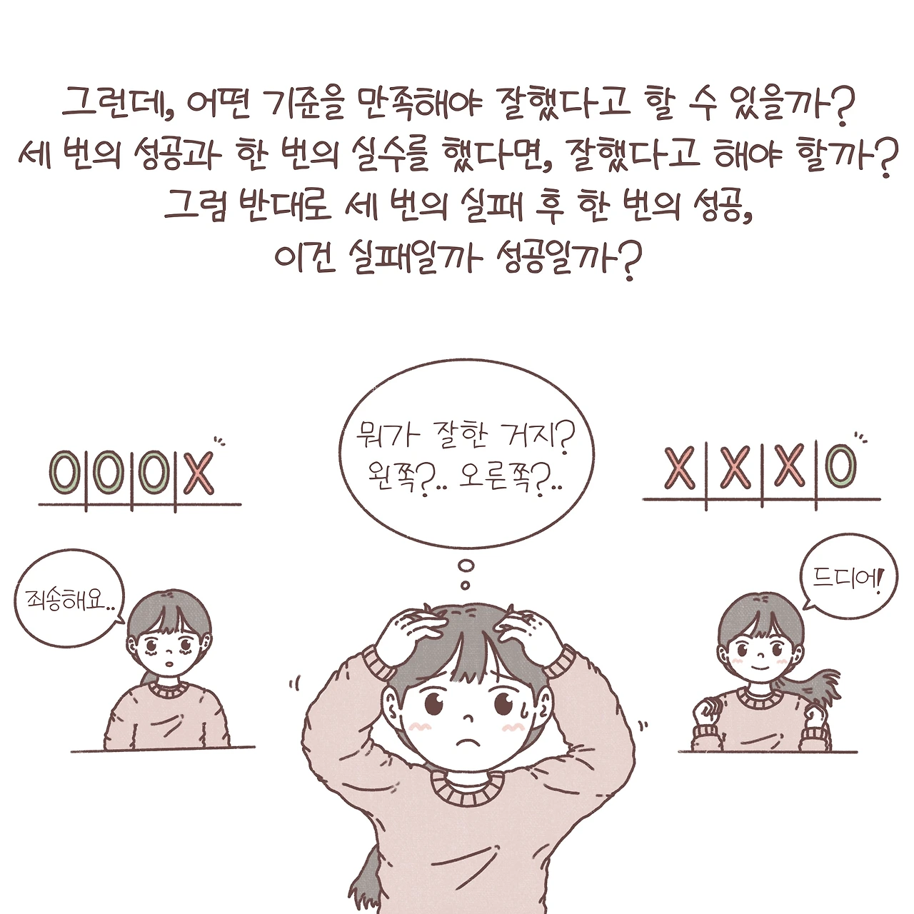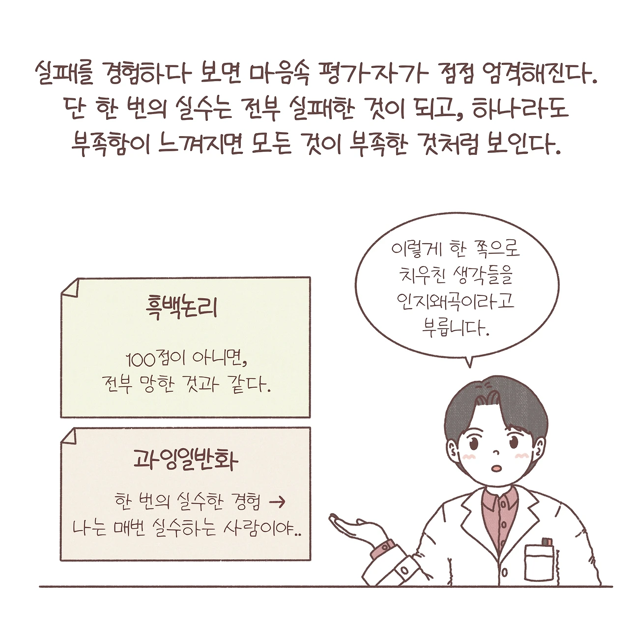 우리는 삶의 많은 부분에서 보이지 않는 기준을 세워두곤 합니다. 그리고 그 기준은 내게만 유독 엄격해서, 마음속 평가자는 매번 기준 미달의 점수를 매겨 나를 좌절하게 만듭니다. 실패와 좌절의 경험이 쌓일수록, 마음속 평가자는 점점 더 엄격해지죠. 단 한 번의 실수는 모든 것을 실패로 만들어버리고, 하나라도 부족하면 모든 것이 수포로 돌아간 것처럼 느껴지기도 합니다. 이런 한쪽으로 치우친 생각들을 '과잉일반화'나 '흑백논리' 같은 인지왜곡이라고 부르기도 해요.