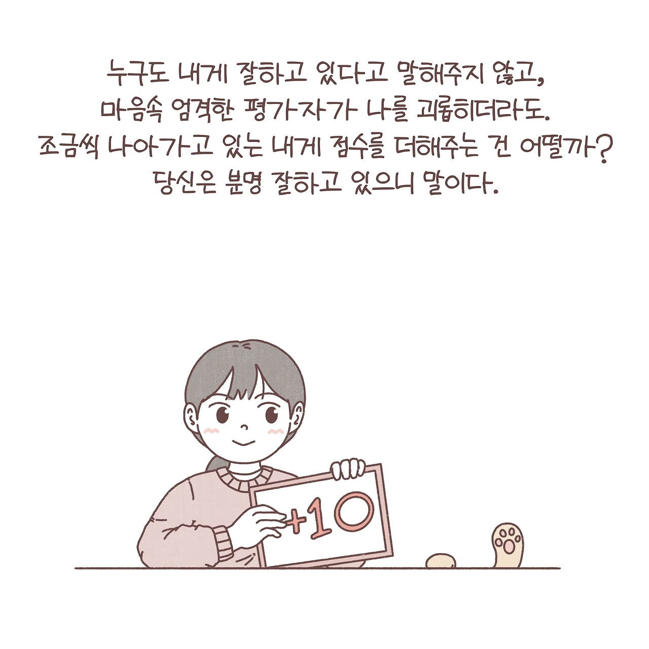 누구도 내게 '잘하고 있다'고 말해주지 않고, 마음속 엄격한 평가자가 여전히 나를 괴롭힌다고 해도. 이제는 스스로를 응원하며 조금씩 나아가고 있는 자신에게 점수를 더해보는 건 어떨까요? 우리는 분명 잘해나가고 있으니 말이에요.