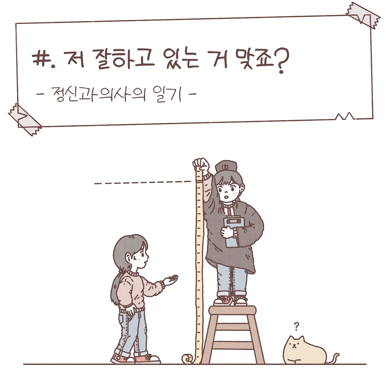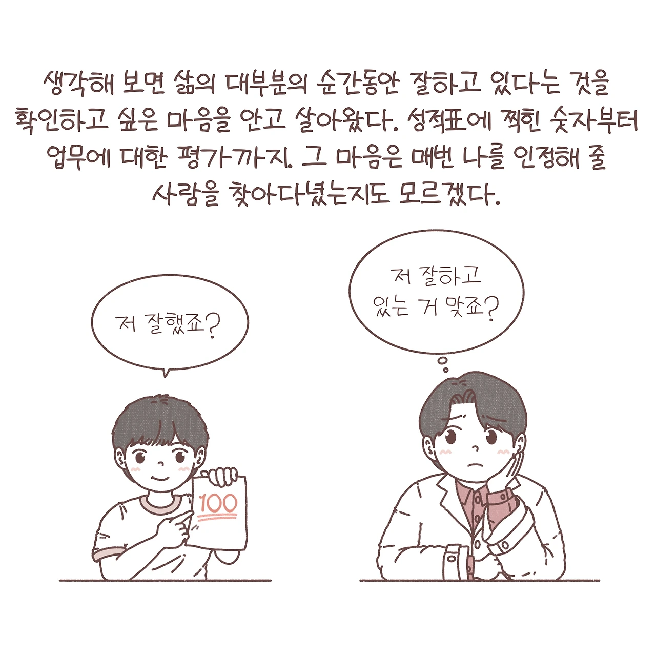 생각해보면, 저는 인생의 대부분을 스스로 잘하고 있다는 것을 확인하고 싶은 마음으로 살아온 것 같습니다. 성적표에 찍힌 숫자가 전부였던 학창 시절부터, 대학을 졸업하고 인턴이 되어 업무 평가를 받던 날들까지. 그리고 평가나 시험이 더 이상 의미가 없어진 지금도, 제 마음은 여전히 저를 인정해 줄 누군가를 찾아 헤매고 있었던 것 같아요. 그 마음은 정신과의사가 된 뒤에도 사라지지 않았습니다. 가늠할 수 없는 어려운 상황 속에서 마음에 생긴 병을 다루는 일을 하면서도, 내가 잘하고 있다는 것을 확인하고 싶어 하는 마음이 여전히 고개를 들곤 했죠.