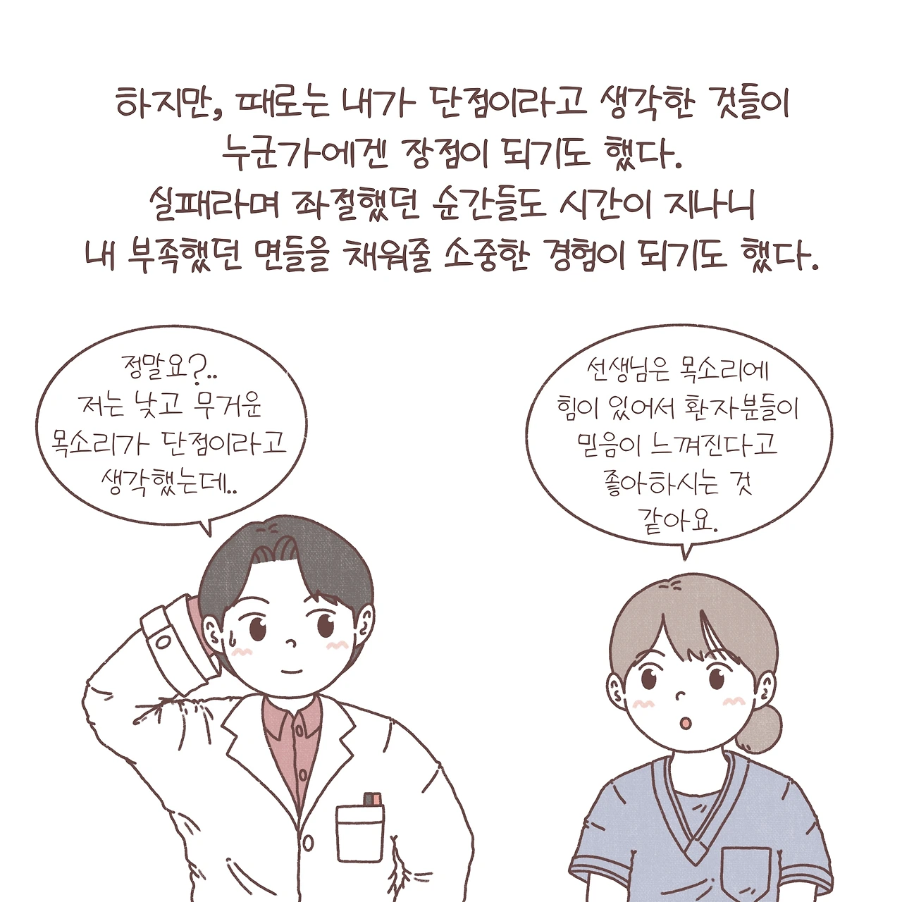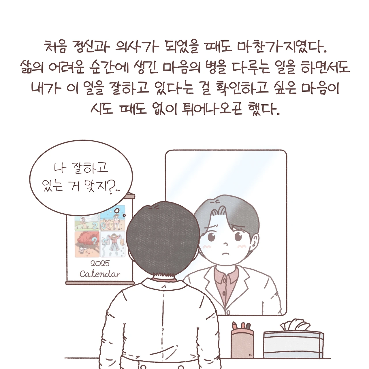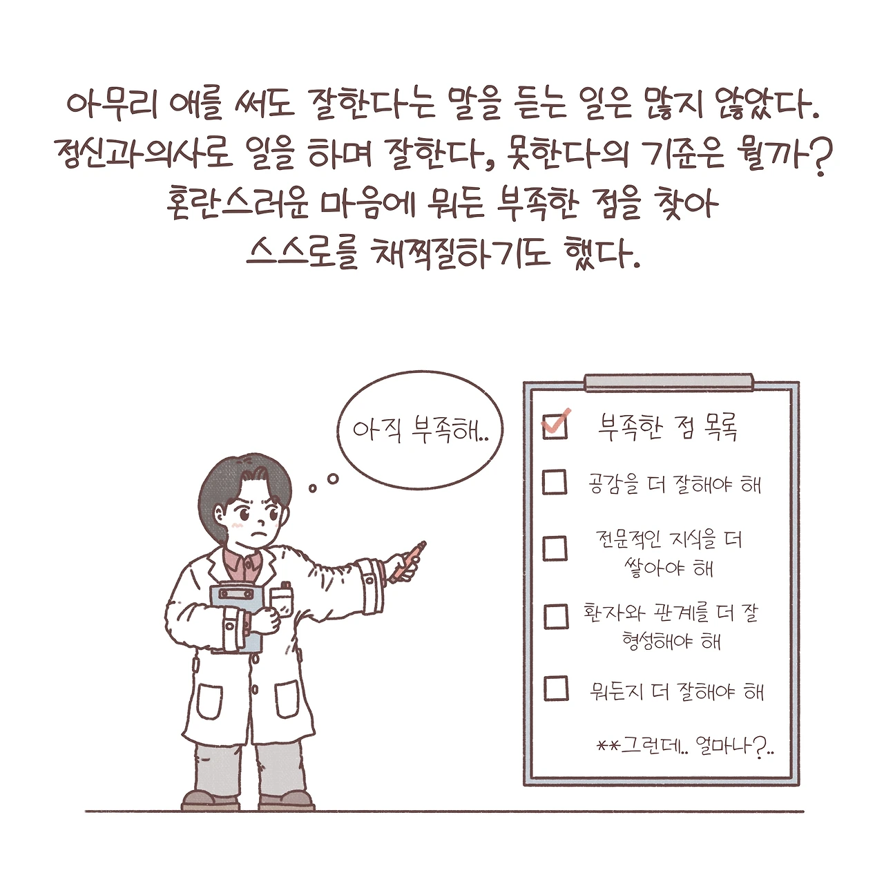 하지만 아무리 애써도 그 마음은 채워지지 않았습니다. 애초에 정신과의사로서 '잘한다'와 못한다'를 구분할 수 있는 기준을 세우는 것 자체가 쉽지 않았으니까요. 그러다 보니 점점 내게 부족한 점을 찾는 데 몰두하며, 조금이라도 나아지기 위해 스스로를 채찍질하는 날들을 보내왔던 것 같습니다.