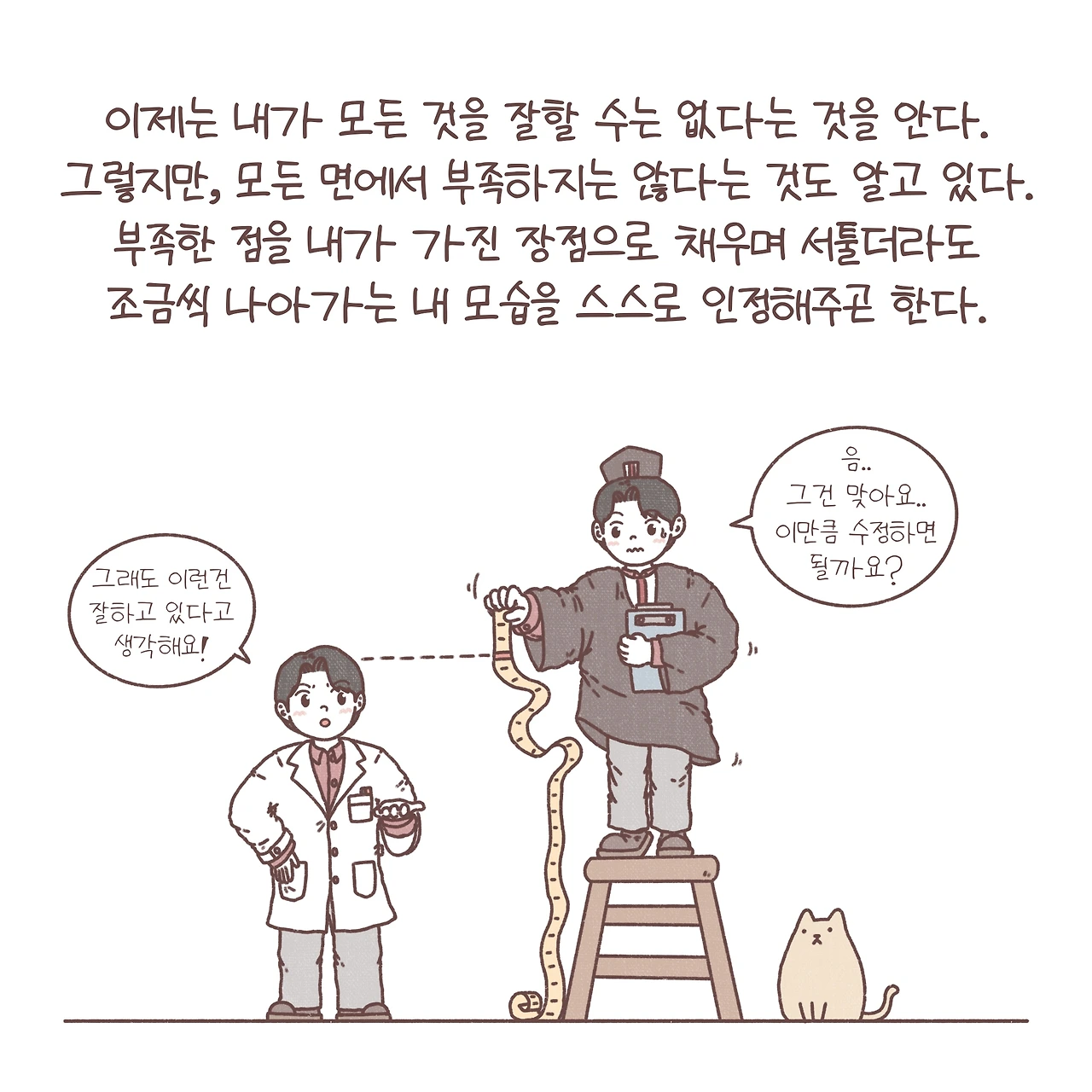 물론 지금도 종종 마음속 엄격한 평가자가 저를 괴롭히곤 합니다. 그림을 그리는 순간에도, 조금 더 완벽하고 좋은 작품을 만들고 싶다는 생각이 마음속에서 풍선처럼 부풀어 오르며 여유를 빼앗아가곤 하죠. 그렇지만 이제는 제가 모든 것을 잘할 수 없다는 사실을 압니다. 하지만, 그것이 결코 내가 모든 면에서 부족하다는 뜻이 아니라는 것도 알고 있습니다. 부족한 부분이 있더라도 내가 가진 장점들로 채워가며 서툴지만 조금씩 나아가고 있는 내 모습을 스스로 인정해주려 노력해요.