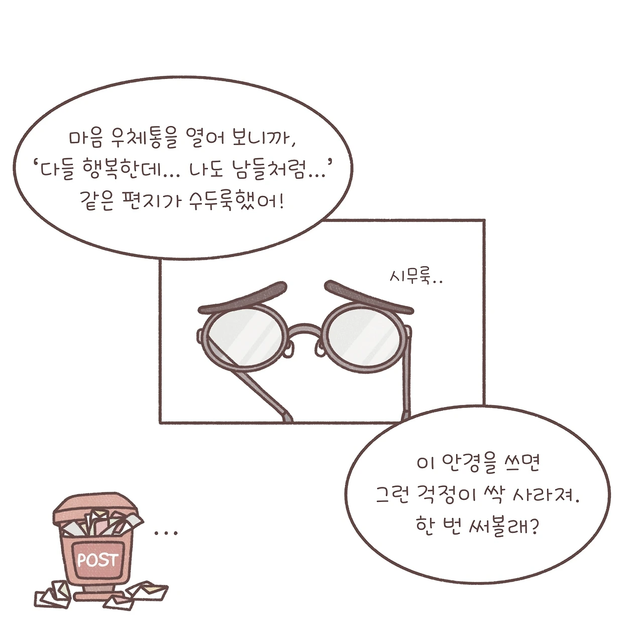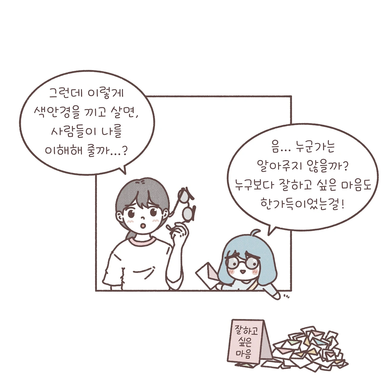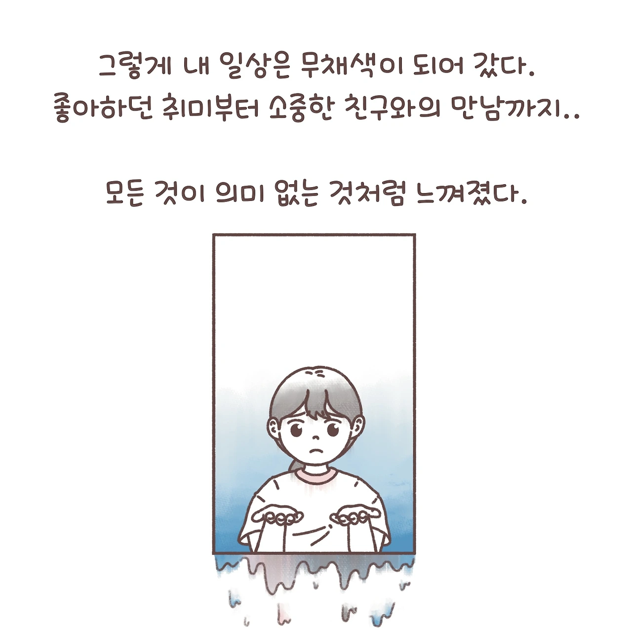 문제는 이 방어막이 마음에 너무 오래 머물러 일상의 색을 모조리 빼앗아 갈 때입니다. 혹시 좋아했던 음식도, 친구와의 만남도, 주말에 떠나던 여행도, 즐겨 듣던 음악도 점점 멀어지고 있지는 않나요? 어느새 소중했던 것들을 뒤로한 채 빛바랜 하루를 버티듯 살아가고 있다면, 이는 일시적 기분 변화가 아닌 치료가 필요한 신호일 수 있습니다. 오늘은 좋아하는 음악을 틀어놓고 파란 하늘을 올려다보는 건 어떨까요? 마음에 씌워진 시무룩 안경을 벗고, 다시금 소중한 것들에 색을 입혀 갈 당신의 내일을 응원하겠습니다.