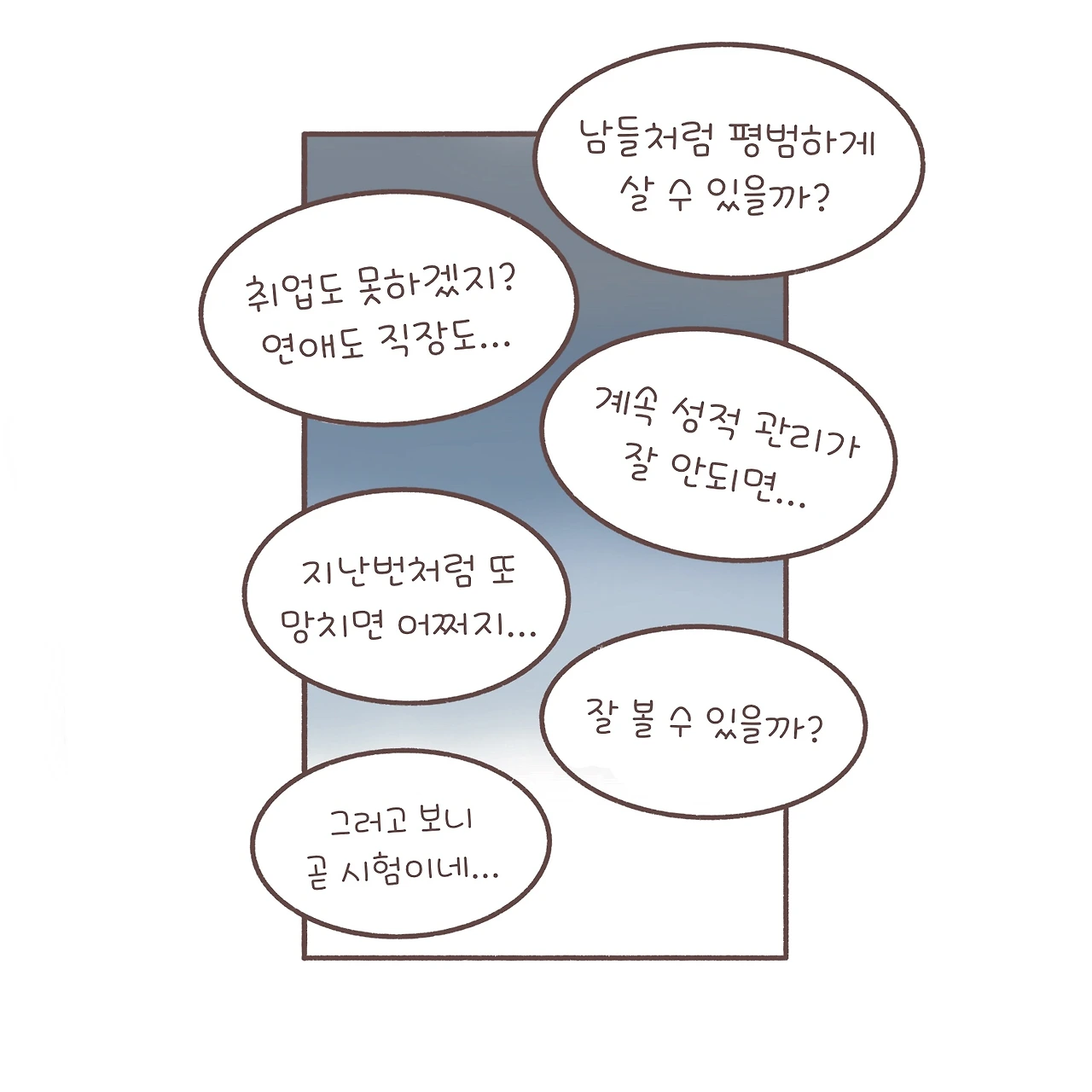 몇 가지 설문지와 상담을 마친 S씨는 우울증이 의심된다는 뜻밖의 이야기를 들었습니다. 평소 밝고 자신감이 넘치던 S씨였기에 그럴 리 없다며 손사래를 치고 병원을 나섰지만, 집으로 향하는 발걸음은 유독 무겁게 느껴졌습니다. “내가 우울증이라고…?” 처방받은 약을 아직 열어보지 않고 머리맡에 올려둔 채 잠이 오길 바라며 눈을 감았지만, 그날 밤은 어째서인지 더 길게 느껴졌습니다.