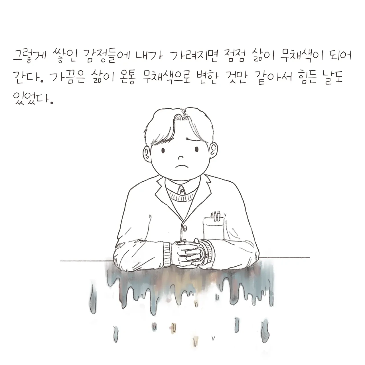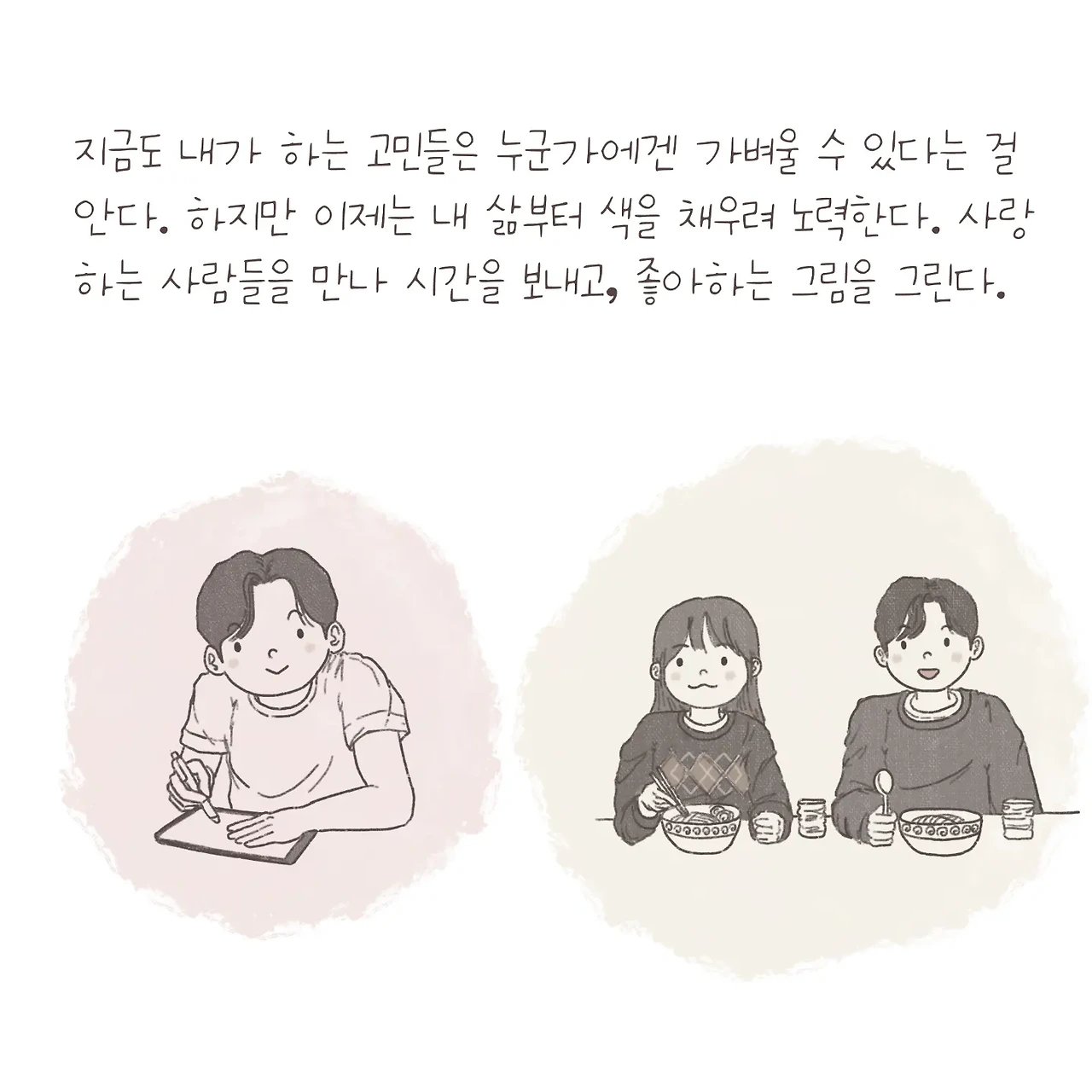 아직은 제 개인적인 고민들을 담은 이야기들만 그려내는 것 같아요. 꾸준히 그려낸다면 저만의 이야기에서 모두의 이야기가 될 수 있는 그런 그림을 그려보고 싶네요.