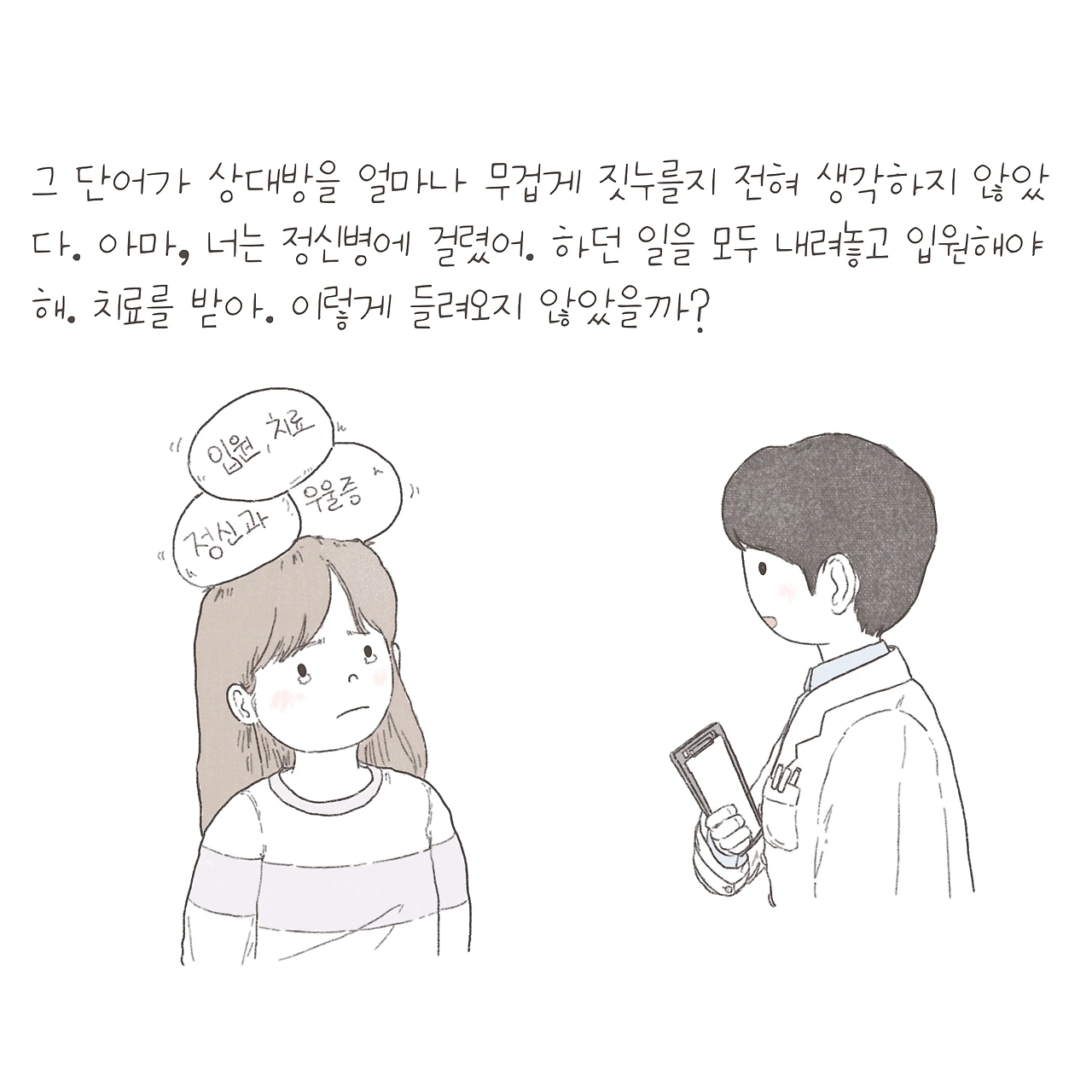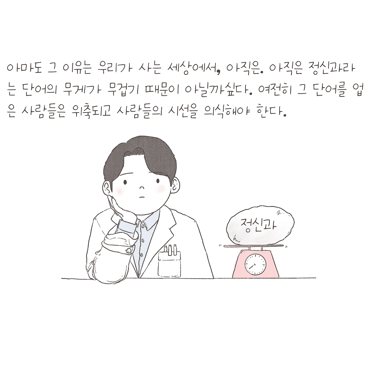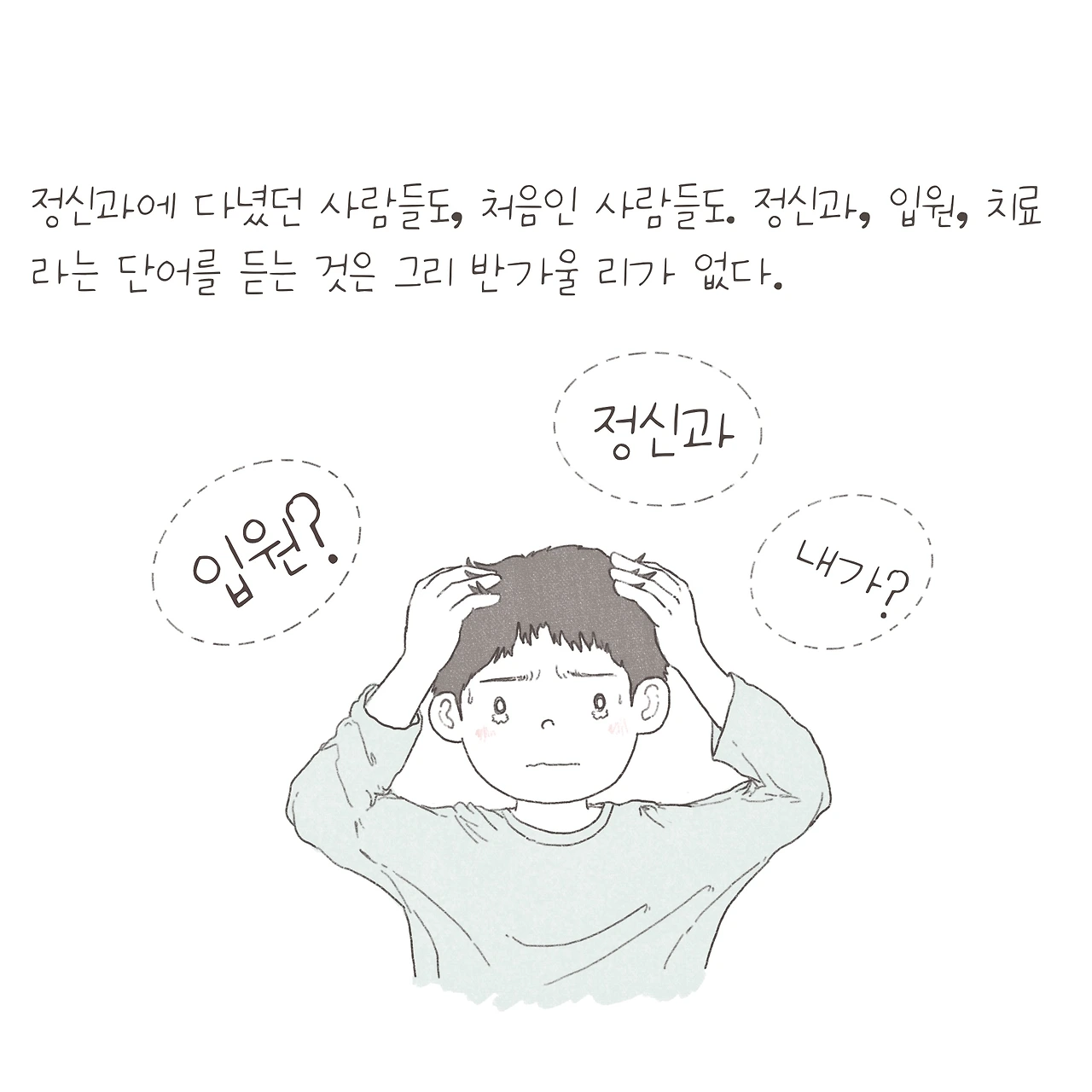 입원 치료, 그게 어렵더라도 적어도 최소한의 치료가 필요한 사람들을 만납니다. 그중 누군가는 정신과라는 단어를 듣자마자 화를 내기도하고, 별 일 아니라며, 치료해서 될 문제가 아니라며 거절하기도 합니다. 처음엔 내민 손이 갈 곳을 몰라 내심 서운하기도 했지만, 열심히 살아온 당신들이 잠시 무너진 그 때에. 정신과 치료라는 그 단어를 쉽게 받아들이지 못하는건 어쩌면 우리 사회에서 그 단어의 무게가 아직은 너무 버겁기 때문일지도 모르겠다는 생각을 합니다.