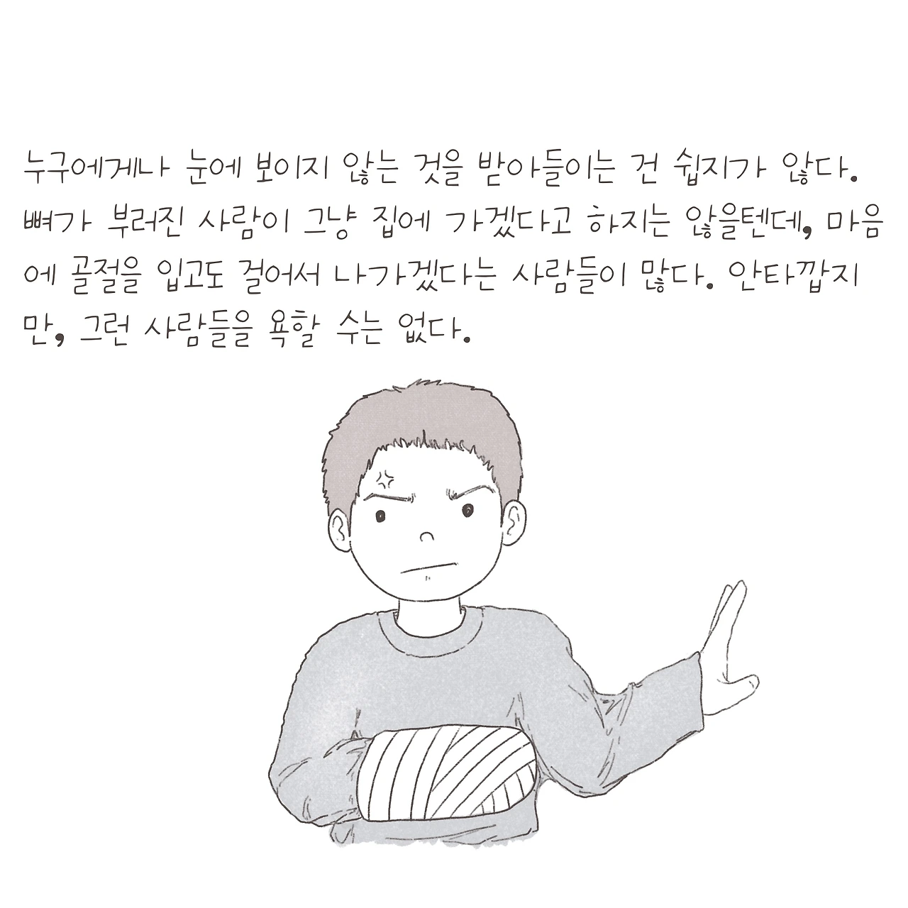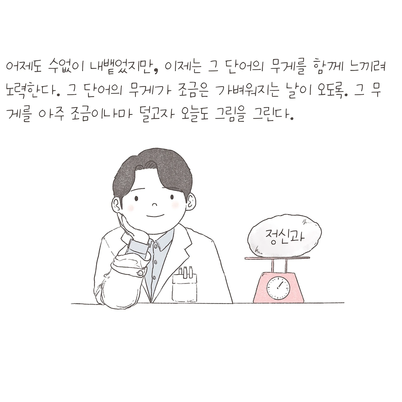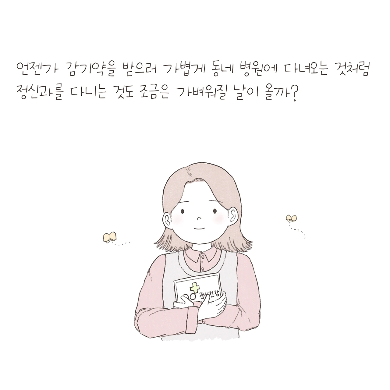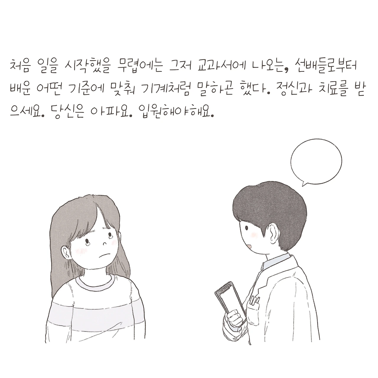 입원 치료, 그게 어렵더라도 적어도 최소한의 치료가 필요한 사람들을 만납니다. 그중 누군가는 정신과라는 단어를 듣자마자 화를 내기도하고, 별 일 아니라며, 치료해서 될 문제가 아니라며 거절하기도 합니다. 처음엔 내민 손이 갈 곳을 몰라 내심 서운하기도 했지만, 열심히 살아온 당신들이 잠시 무너진 그 때에. 정신과 치료라는 그 단어를 쉽게 받아들이지 못하는건 어쩌면 우리 사회에서 그 단어의 무게가 아직은 너무 버겁기 때문일지도 모르겠다는 생각을 합니다.