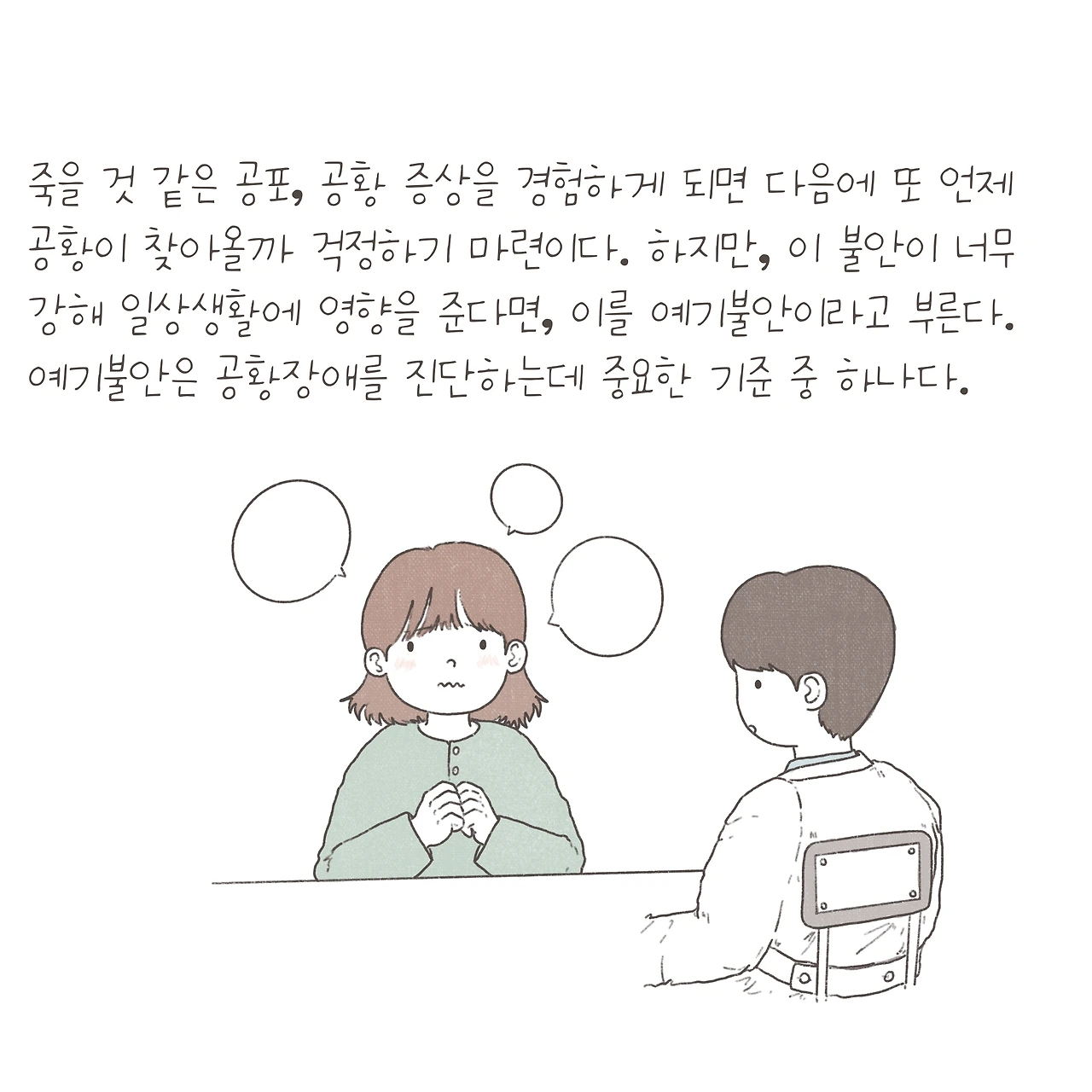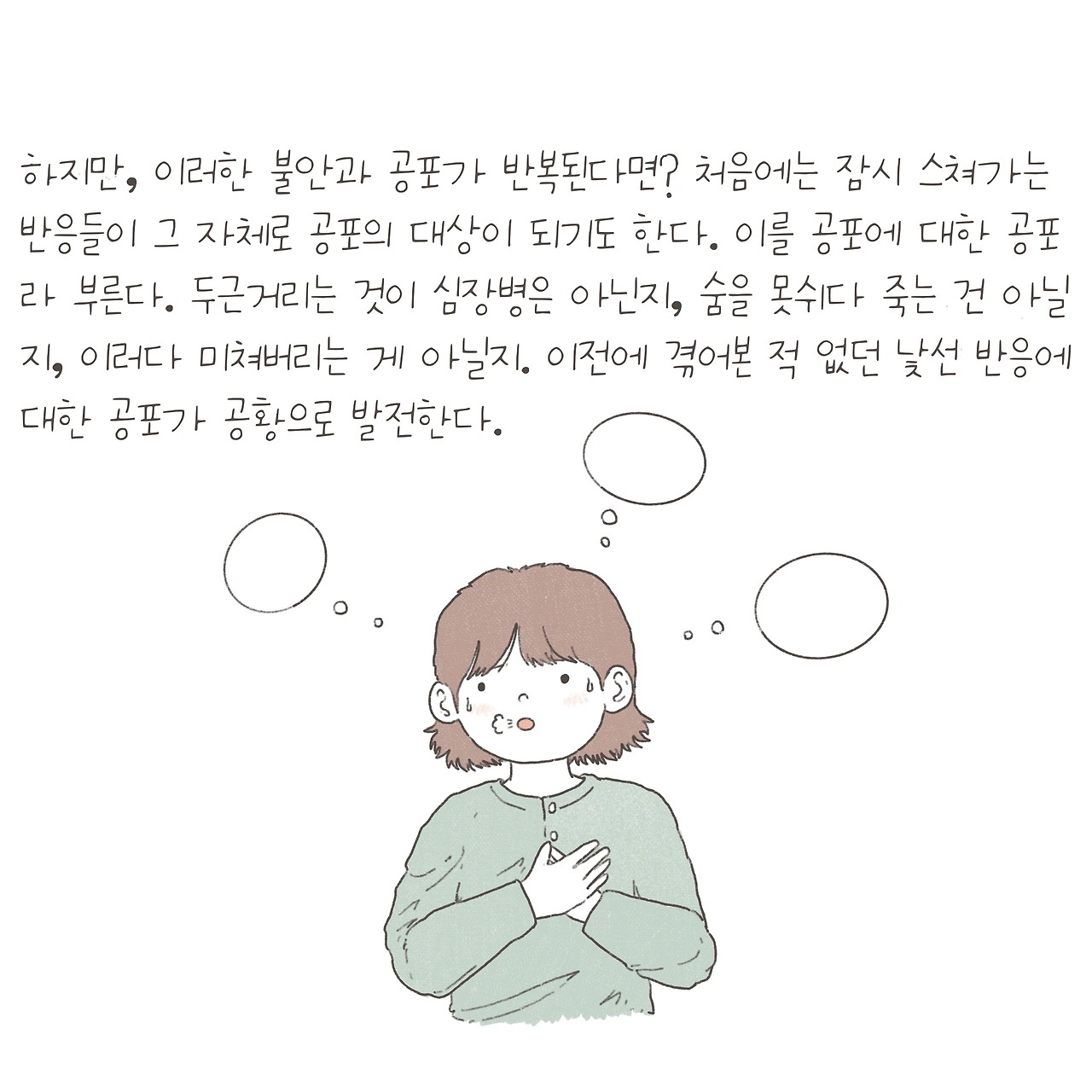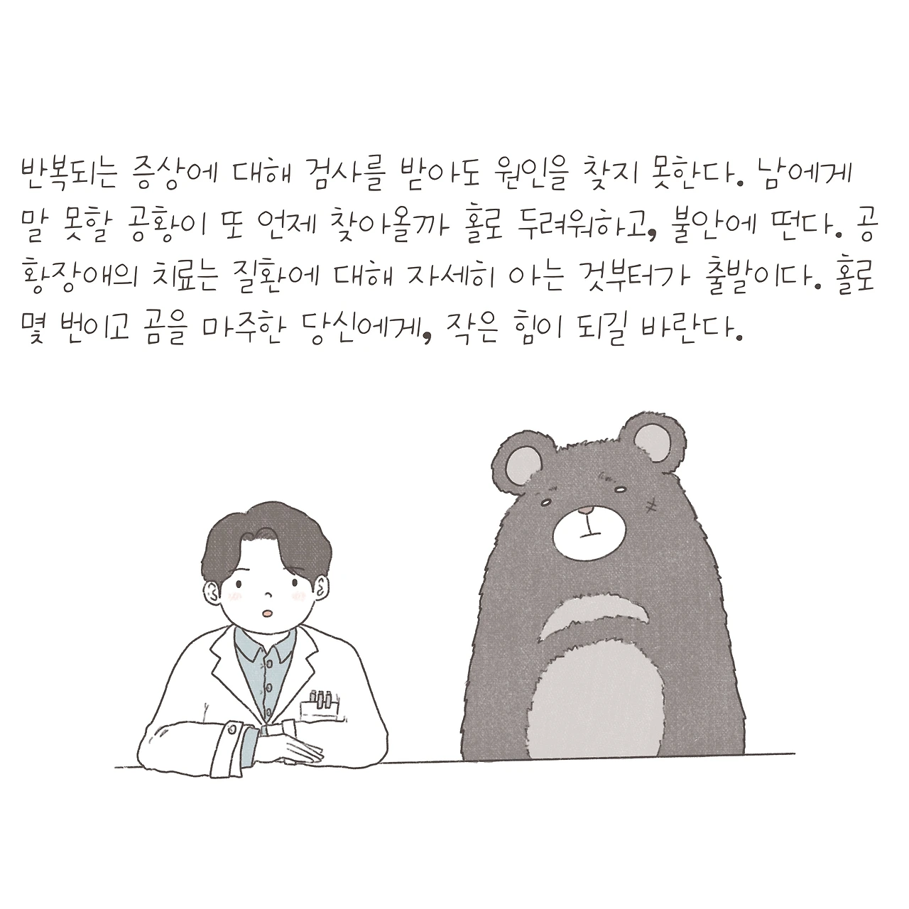 요즘들어 공황 증상을 앓는 환자들을 자주 마주하게 됩니다. 죽을 것 같은 공포를 느끼지만, 반복되는 병원 방문에도 이상이 없다는 말을 듣고 점점 고립되어가는 분들도 많은 것 같아요. 공황장애 환자들이 응급실이나 외래로 찾아온다면 가장 우선시하는 것은 정확한 질병교육과 복식호흡 교육인 것 같습니다. 도망치고만 싶은 '공황'이라는 공포의 정체에 대해 제대로 알아가는 것 부터가 치료의 시작인 것 같아요. 오늘도 마주한 누군가에게 도움이 되길 바라며, 기회가 된다면 복식호흡에 대한 이야기도 그려보려 합니다.