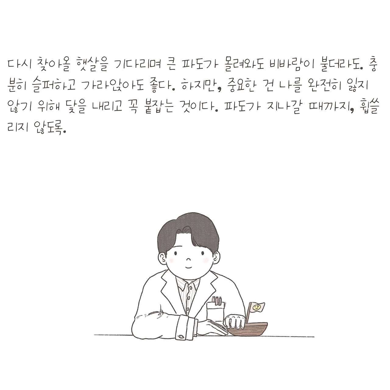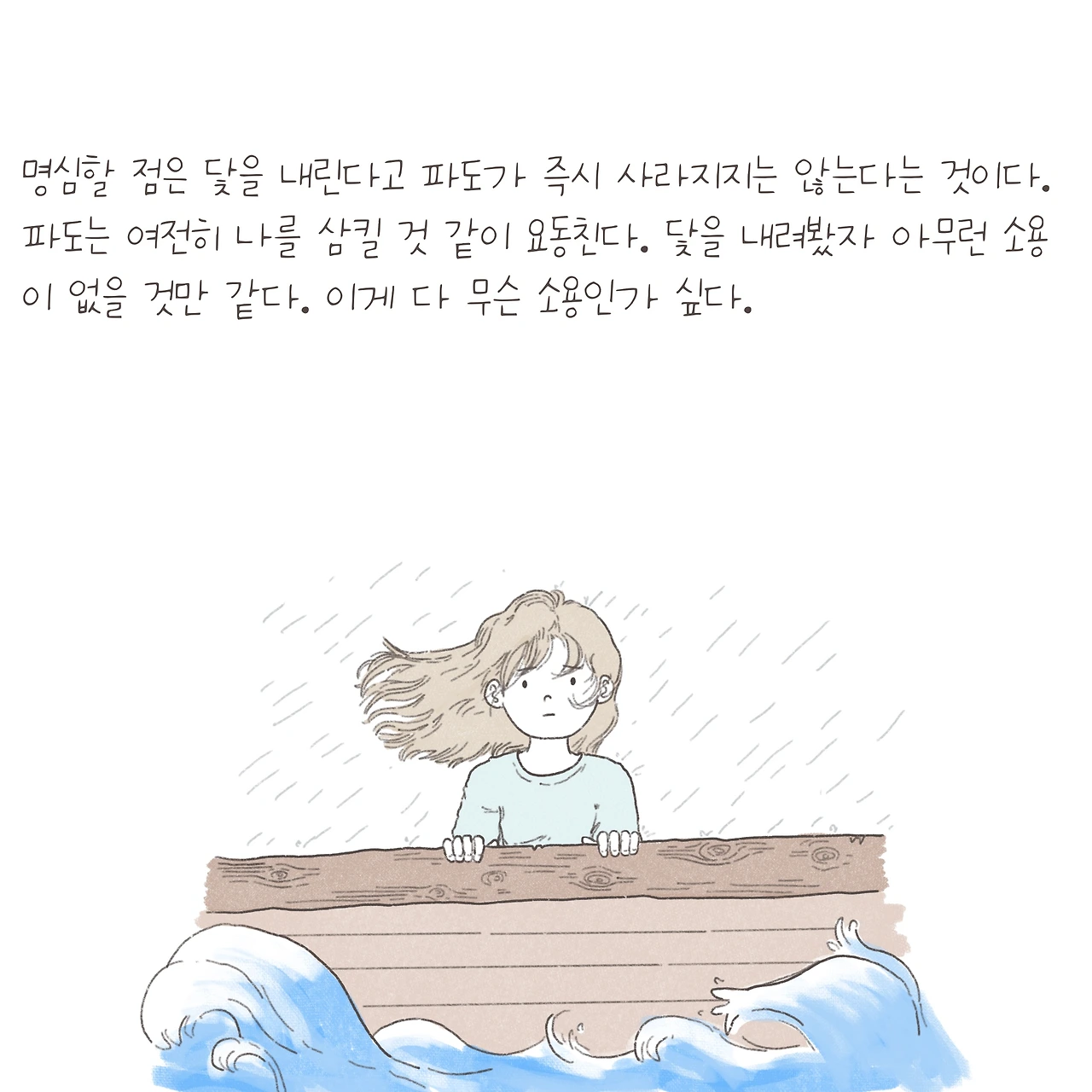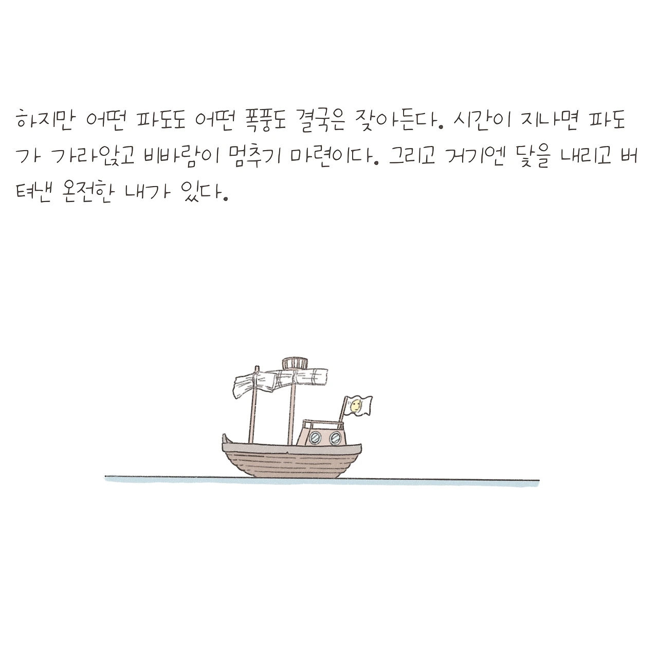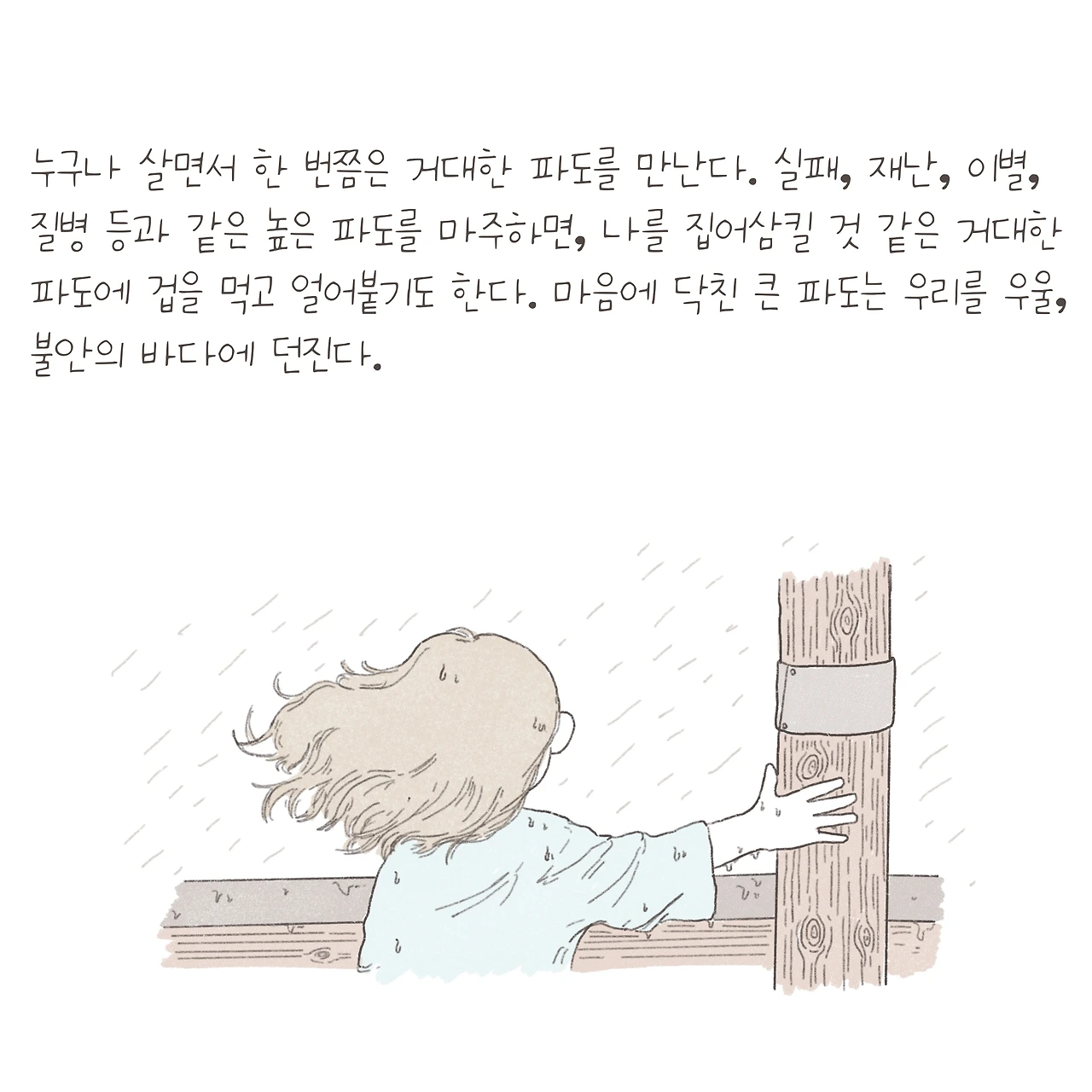 요즘은 일이 바빠져서 정말 오랜만에 그림을 올리는 것 같네요. 외래 진료를 보다보면 감정과 생각에 사로잡혀 일상을 잃어버린 사람들을 종종 만나곤 합니다. 완전히 감정을 떨쳐낸다는 것이 어려운 걸 알지만, 감정의 파도가 지나갈 때까지 나를 완전히 잃어버리지 않도록 닻을 내리고 나를 꼭 붙잡을 수 있길 바라며. '인생에 거친 파도가 몰아칠 때'라는 책에서 읽은 좋은 글들을 풀어서 들려드리곤 합니다.
