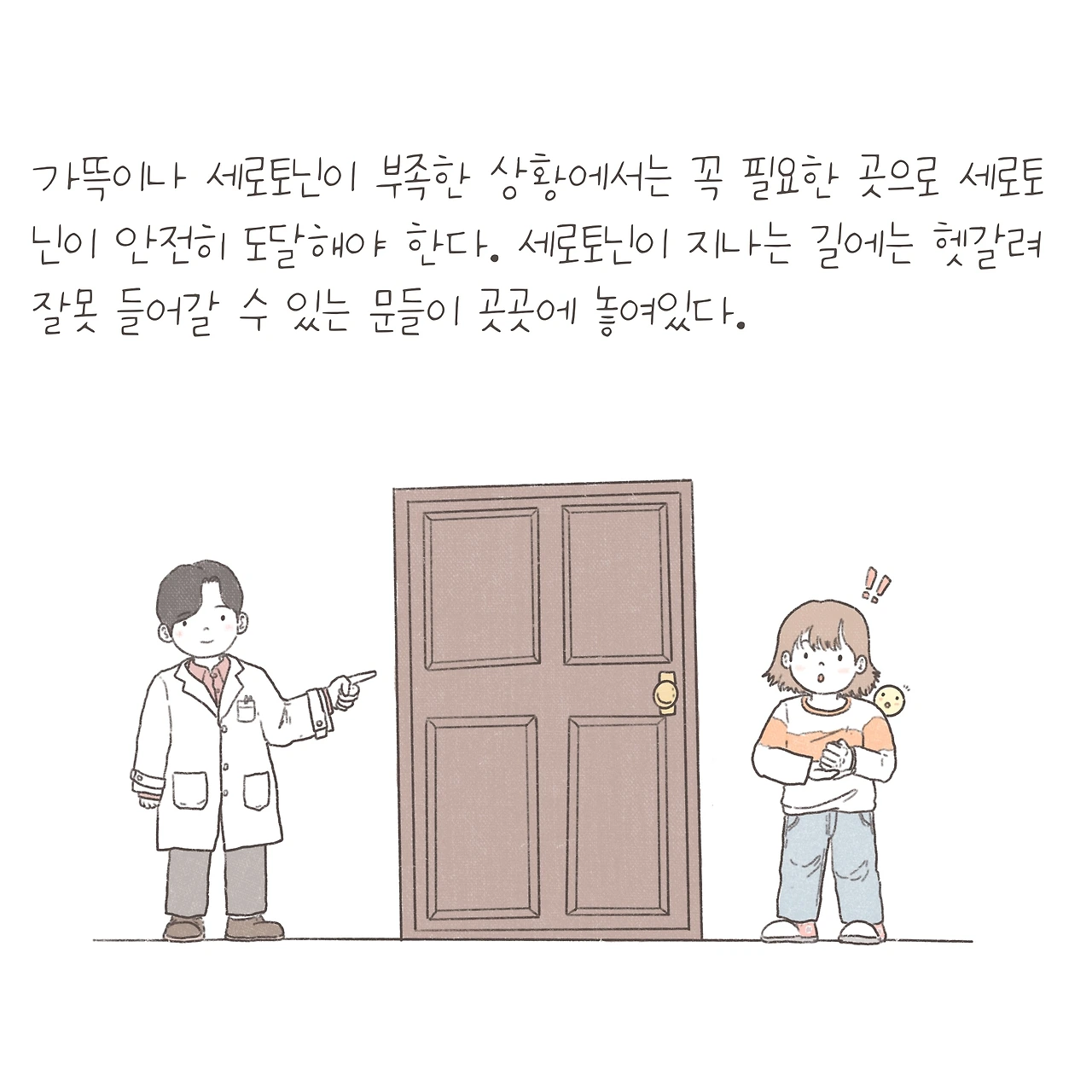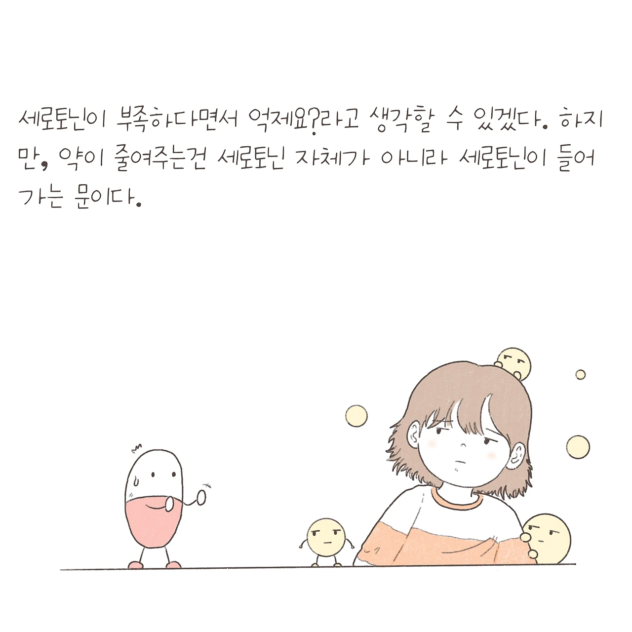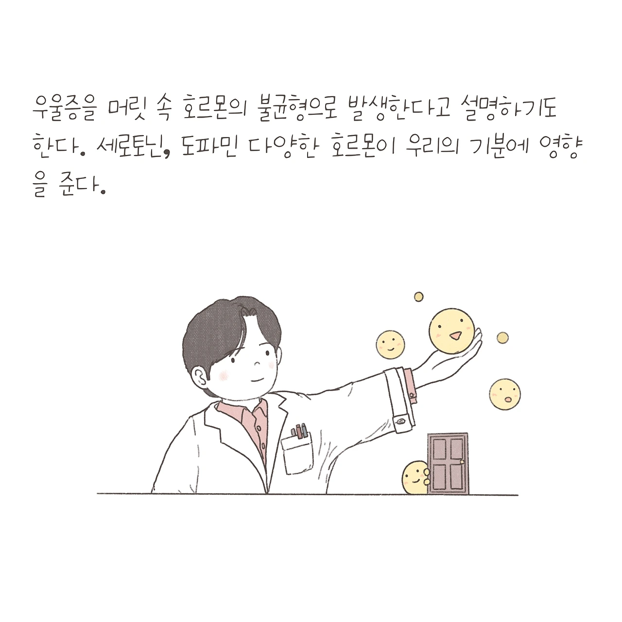 우울증약과 호르몬, 문에 빗댄 내용은 앞서 그렸던 적이 있지요. 그런데 설명을 하다보니 호르몬 자체가 줄어든다고 이해하는 경우가 종종 있더라구요. 게다가 요즘은 실습 참관 학생들에게 제가 그린 그림을 보여주며 설명해줄 때가 간혹 있는데, 정확한 정보를 전달해주어야 할 것 같아 내용을 다듬어 새롭게 그려봤습니다. 하지만, 꼭 하나의 호르몬 부족으로 모든 증상을 설명할 수는 없는 것 같아요.